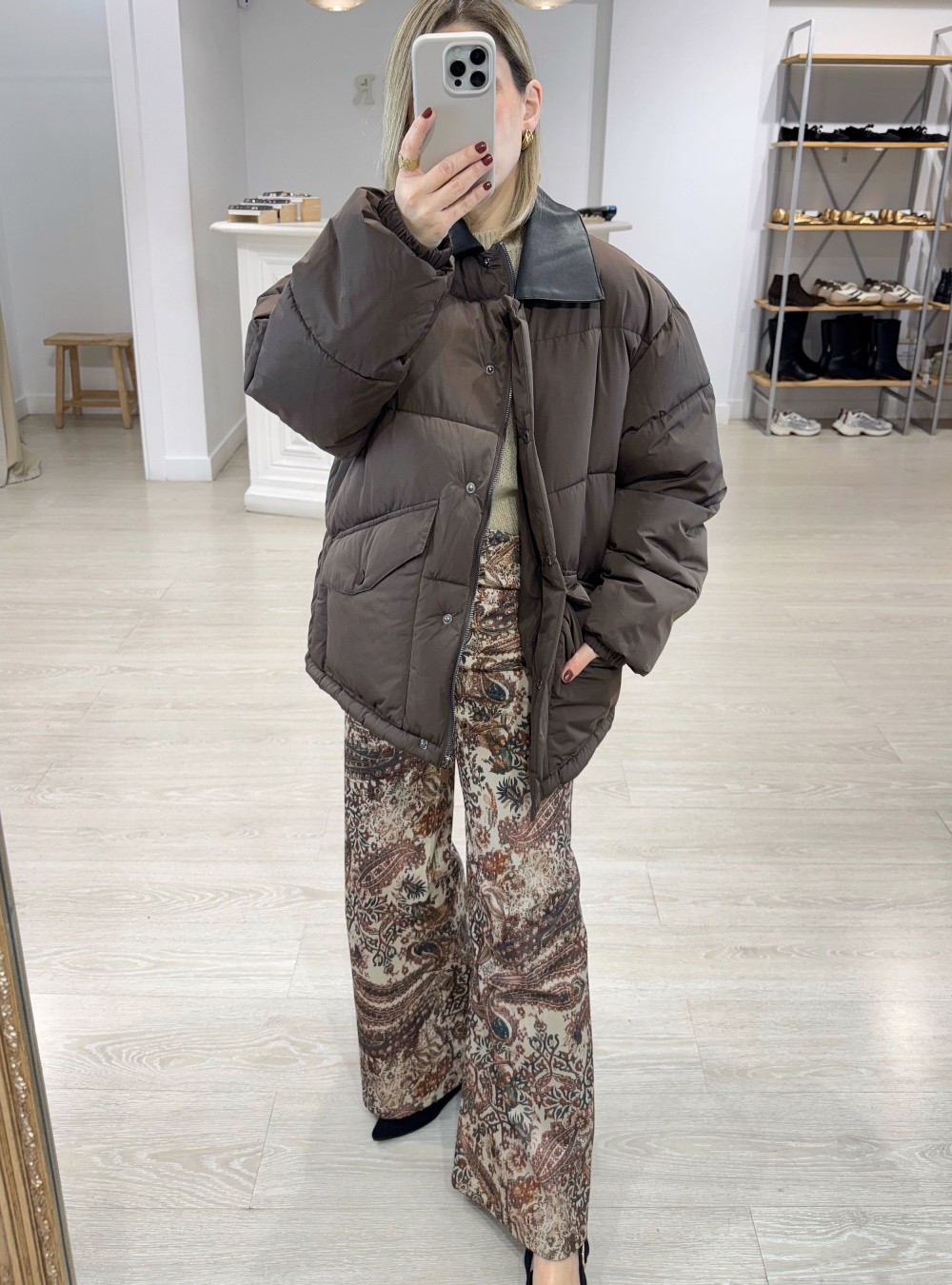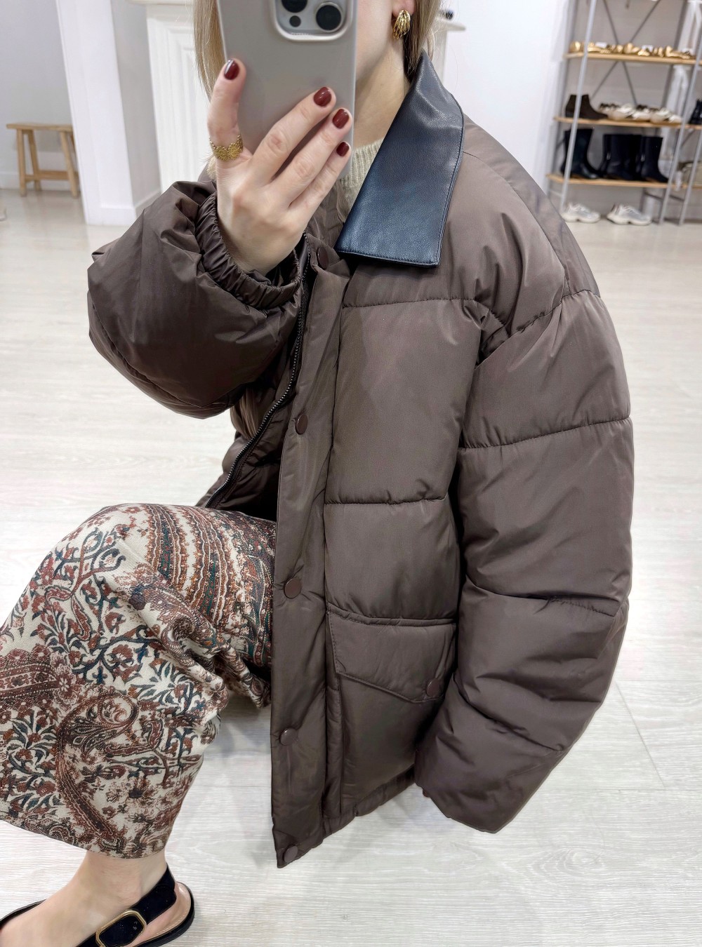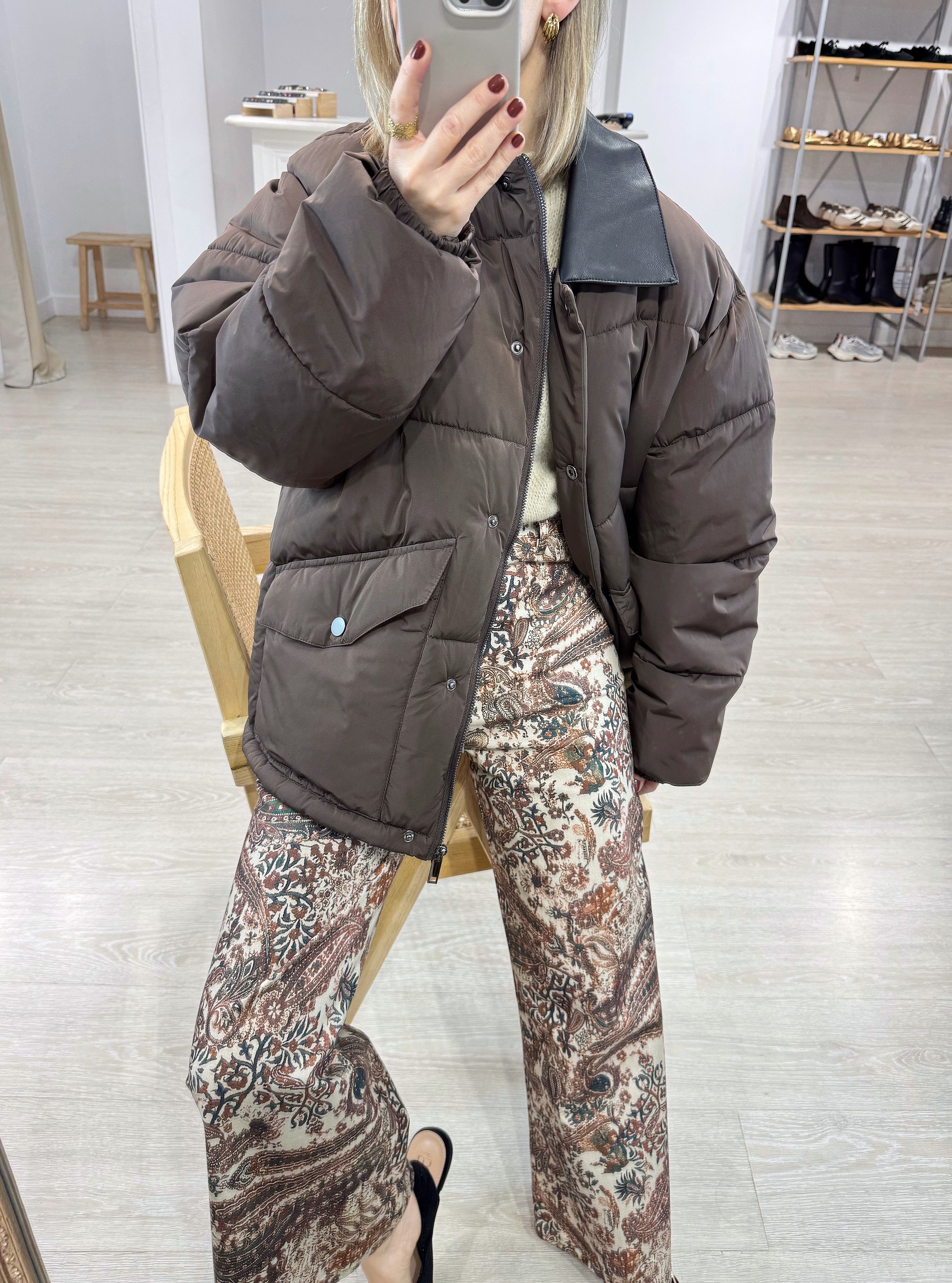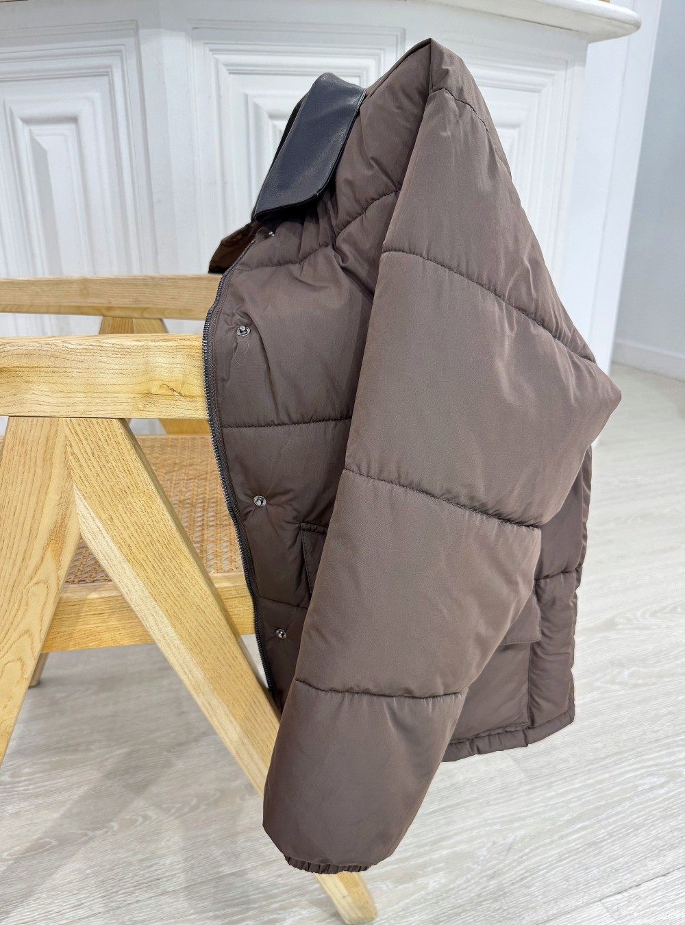 Abrigo acolchado de largo medio con el cuello en contraste efecto piel. Cierre por medio de cremallera y botón. Dos bolsillos. Corte holgado. Bajo ajustable.