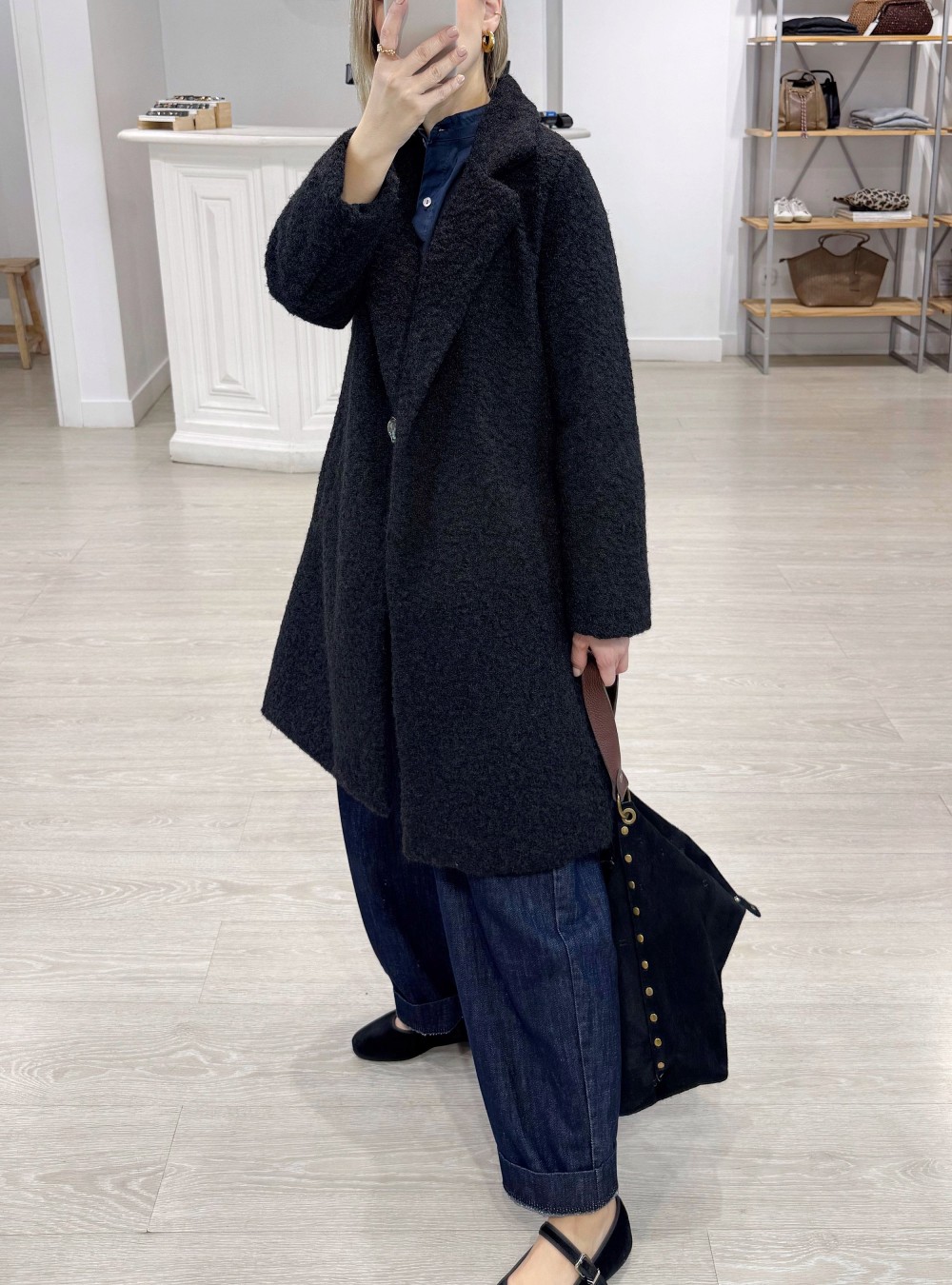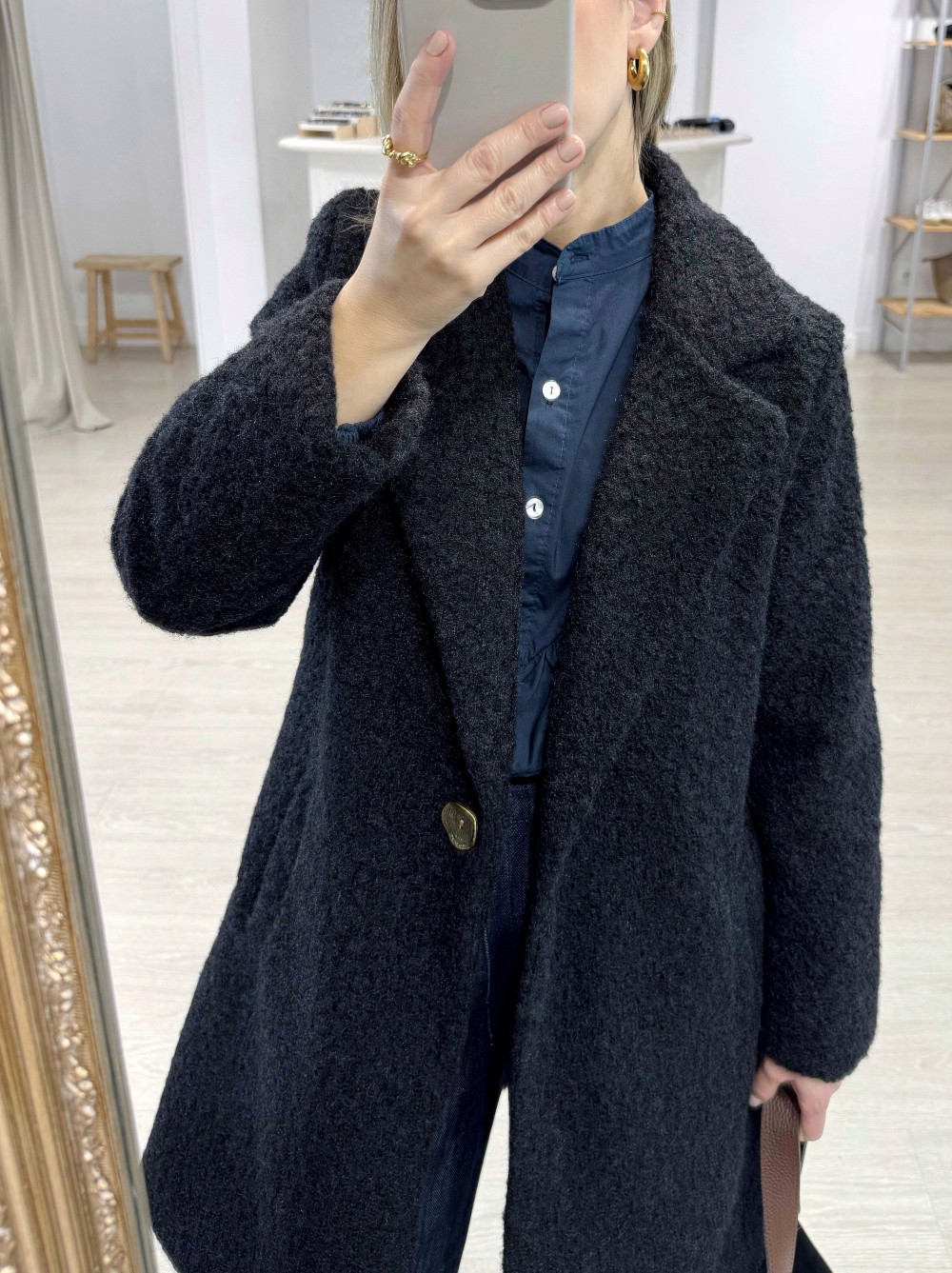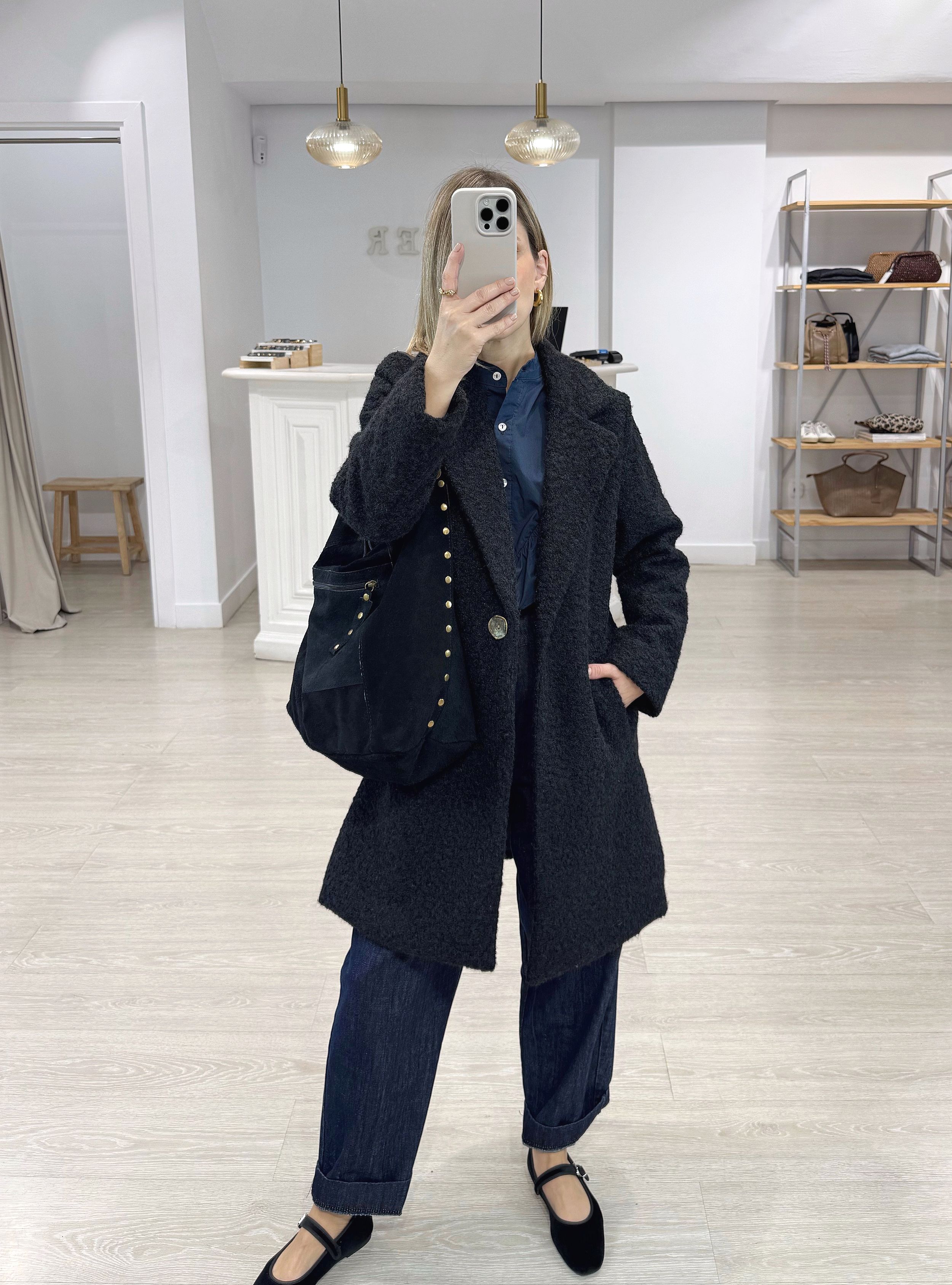 Abrigo midi con acabado exterior en rizo, cuello solapas y cierre por un botón metálico. Tiene forro y dos bolsillos laterales en la parte baja. En una combinación de negros y azules oscuros este abrigo se desenvuelve como pez en el agua.