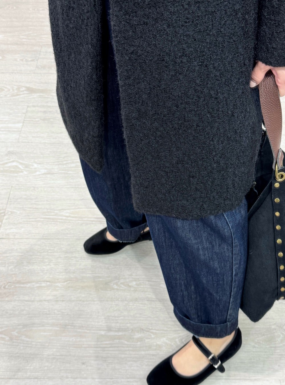 Iraide tiene una talla S y mide 154 cm. El abrigo de la foto es talla Única.