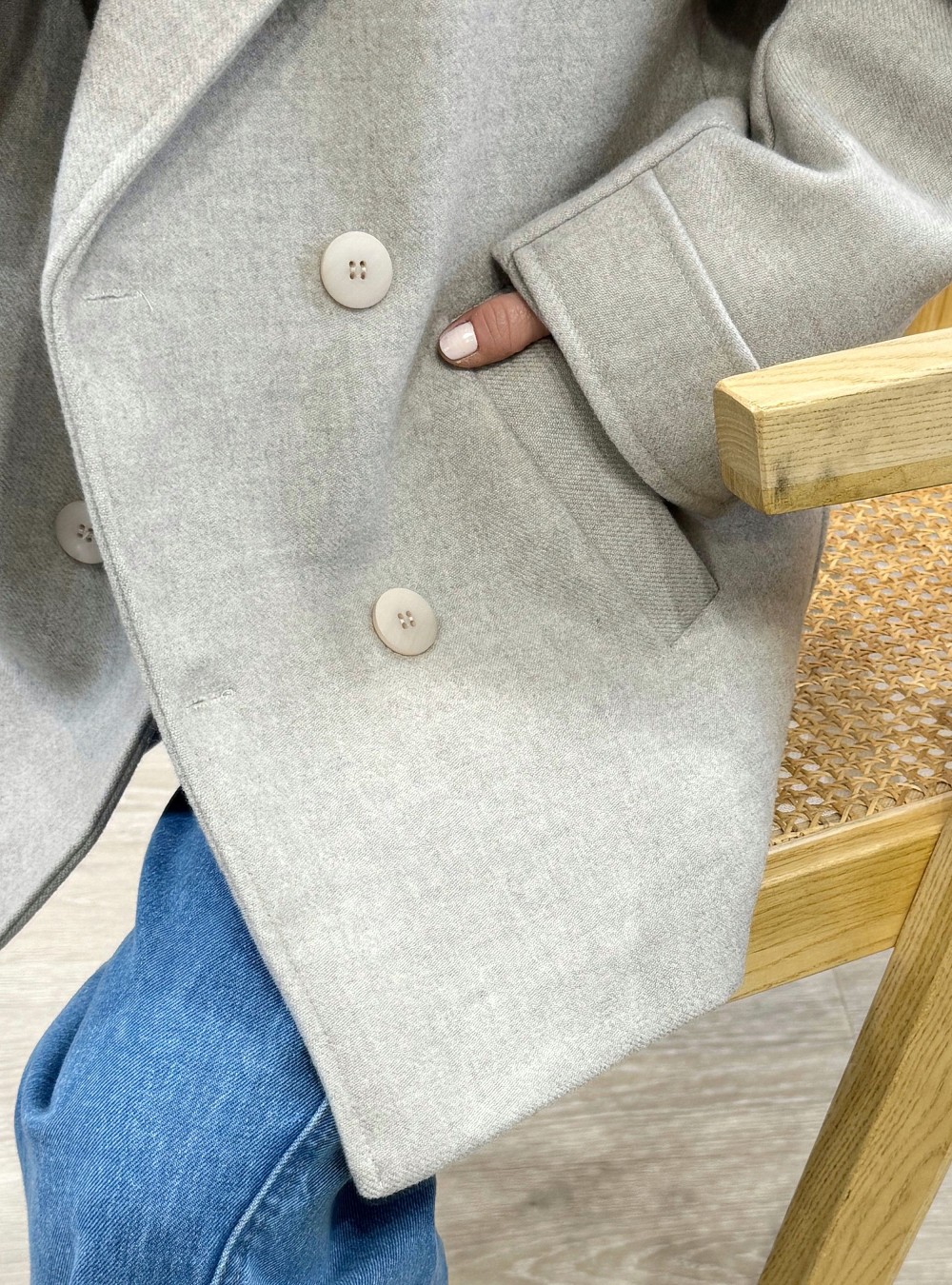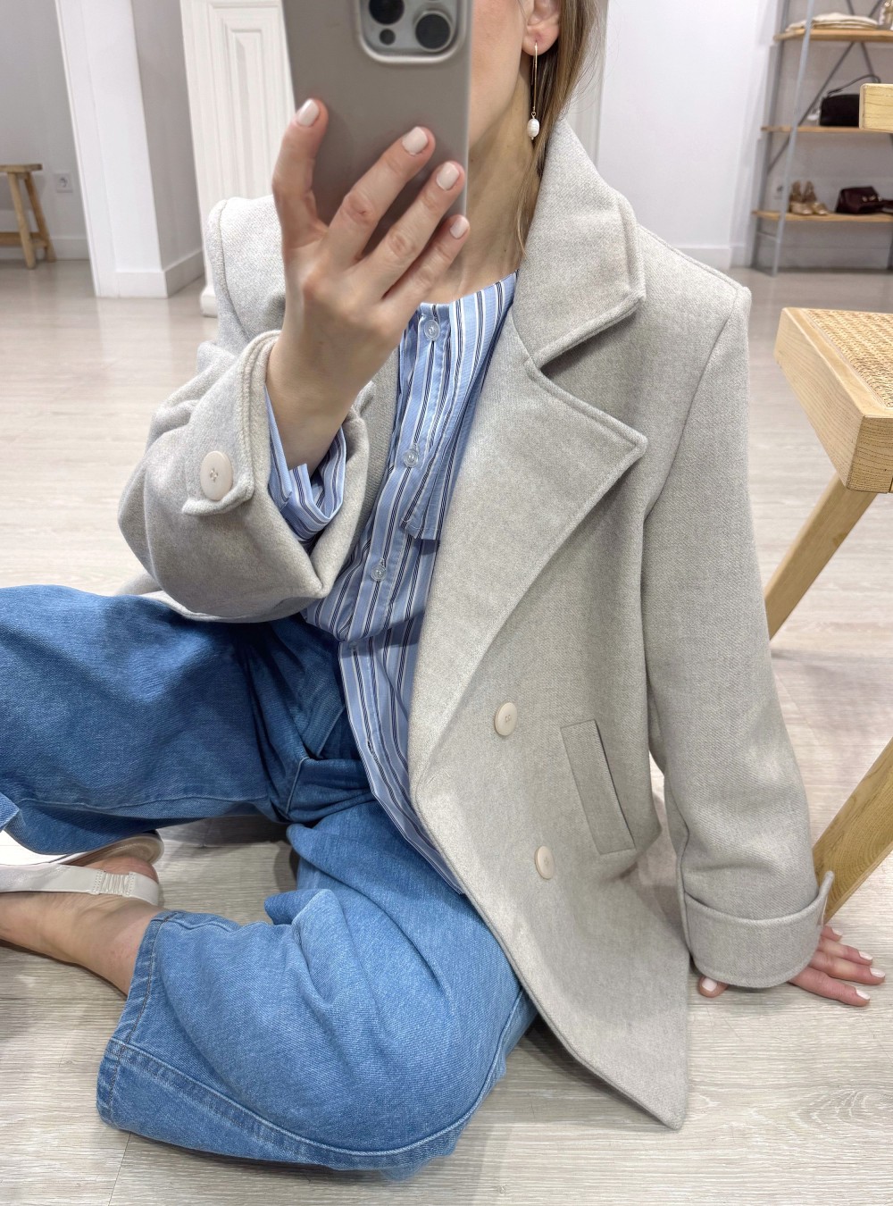 Abrigo de paño cruzado de corte amplio. Cuello solapa. Dos bolsillos. Tiene forro. Puedes mezclarlo con una camisa de rayas y nuestro Jeans Balloon super confort.