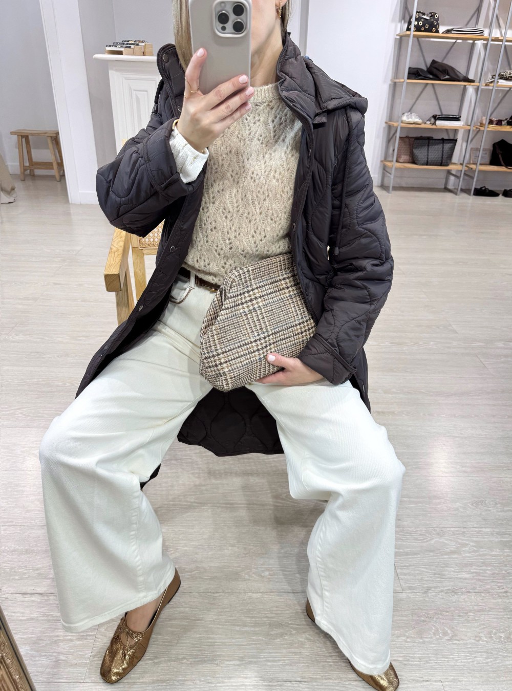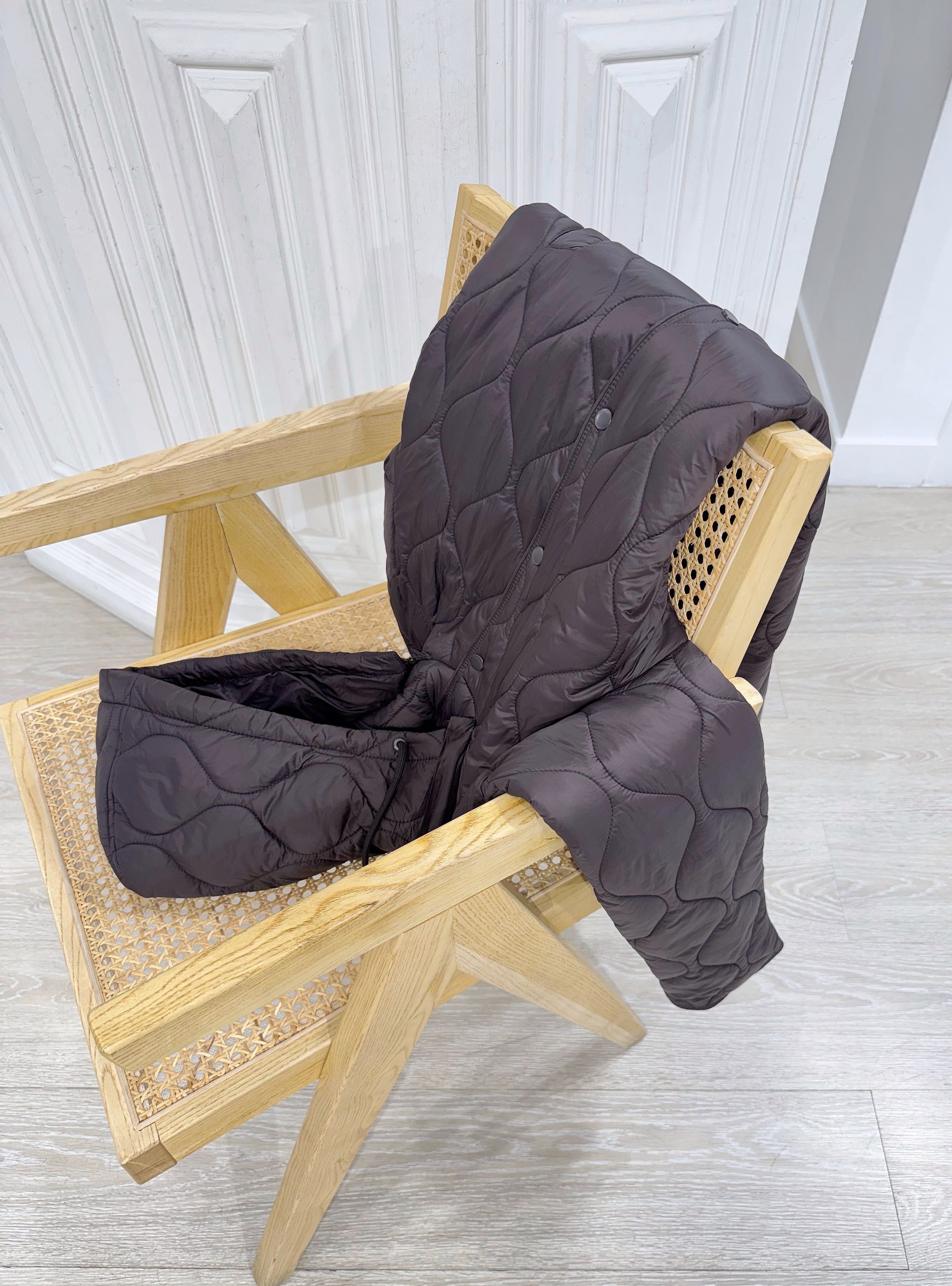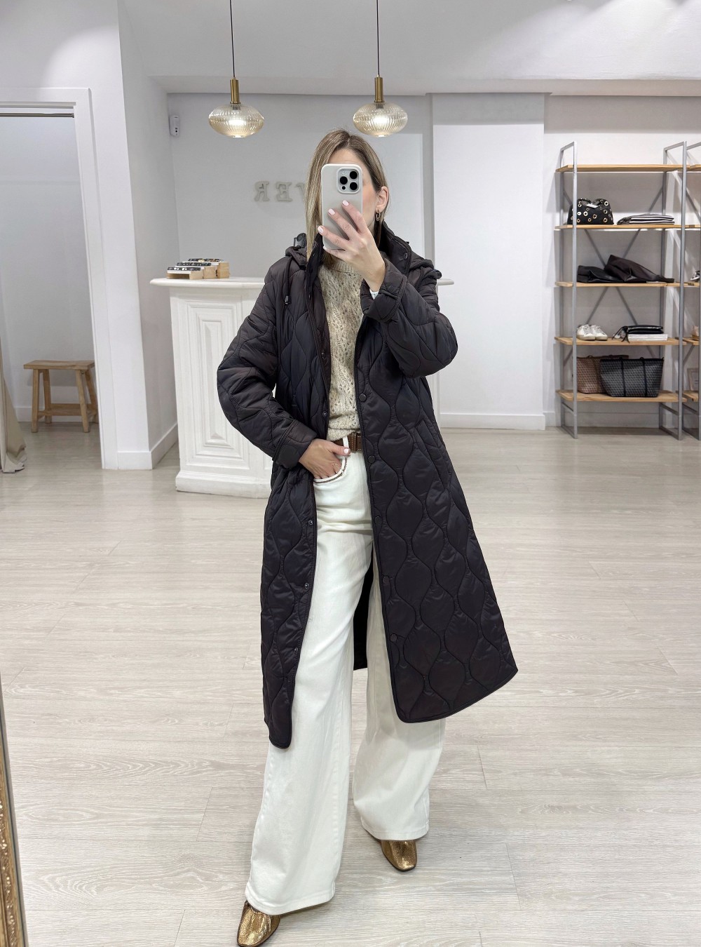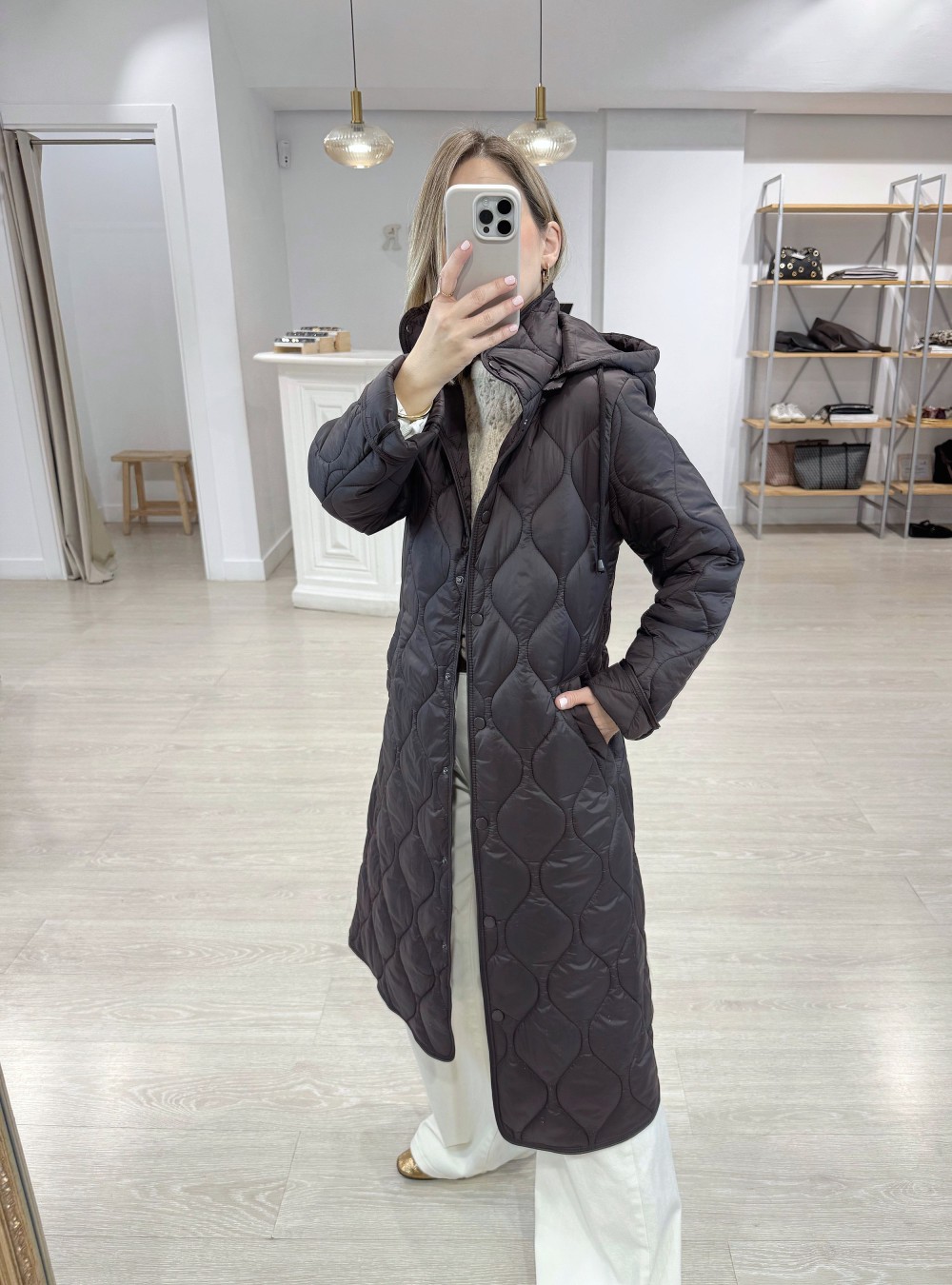 Abrigo largo acolchado. Dos bolsillos. Capucha desmontable. Tejido ligero pero calentito. Cierre por medio de botones.