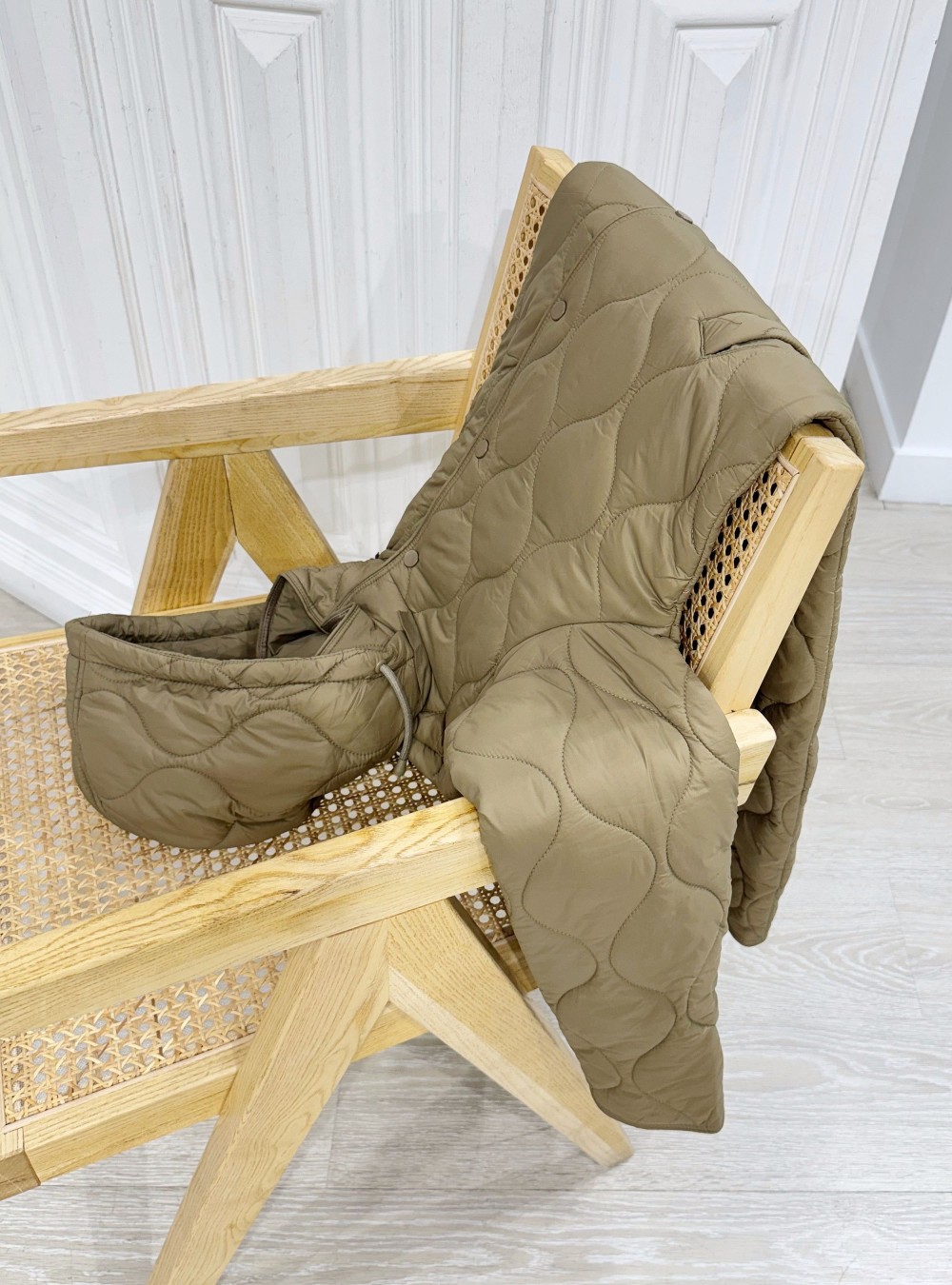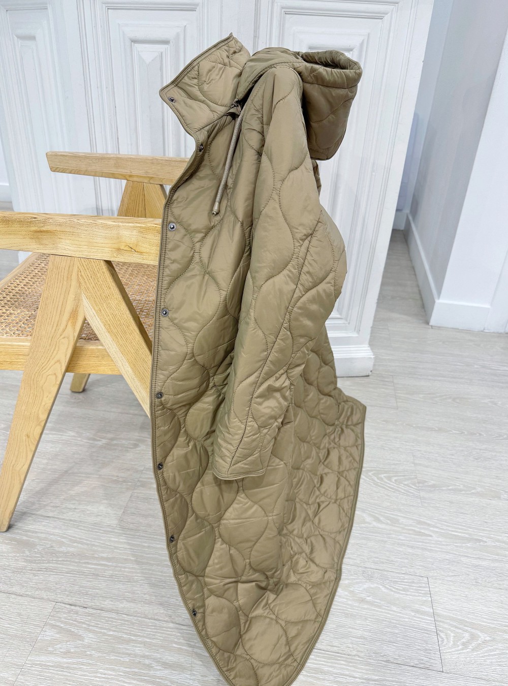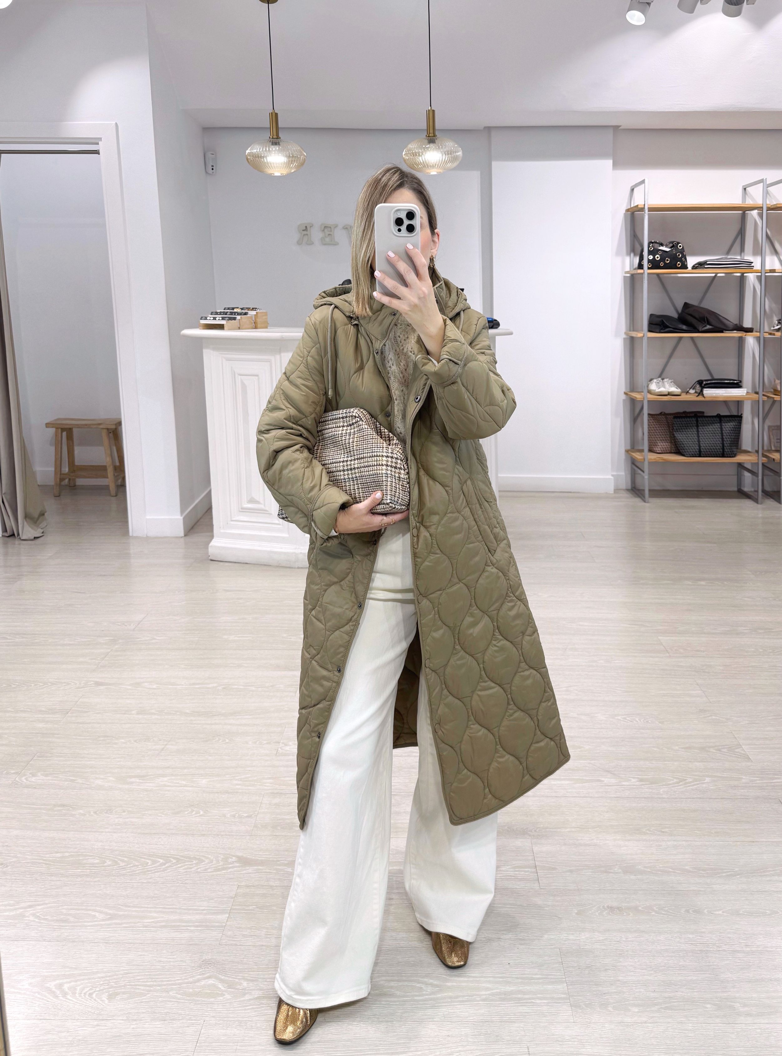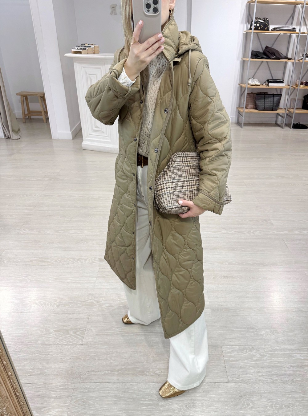Abrigo largo acolchado. Dos bolsillos. Capucha desmontable. Tejido ligero pero calentito. Cierre por medio de botones.
