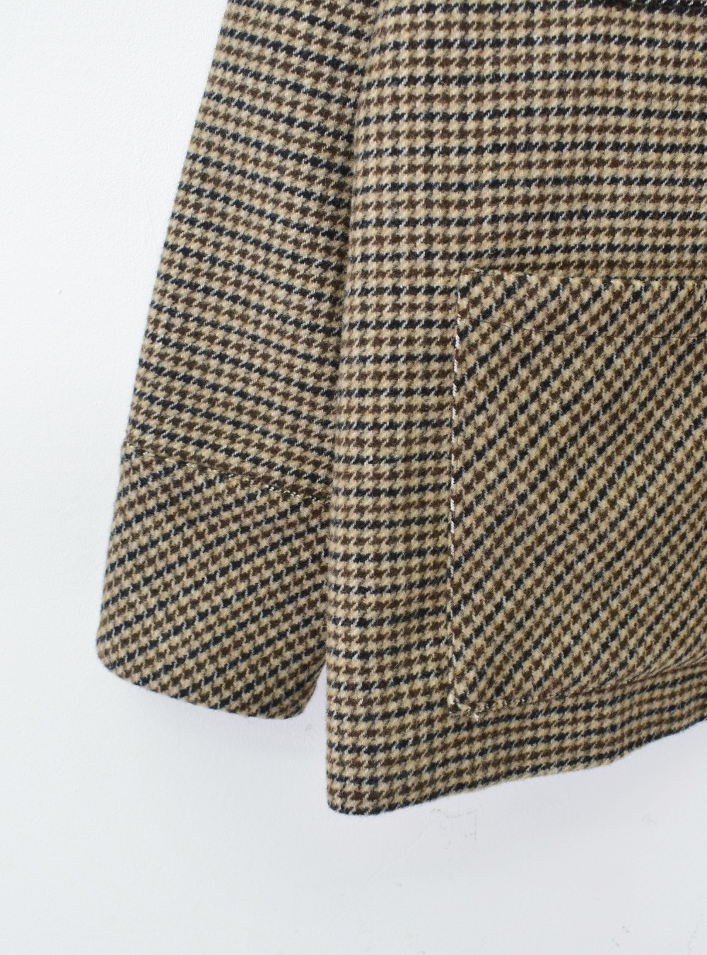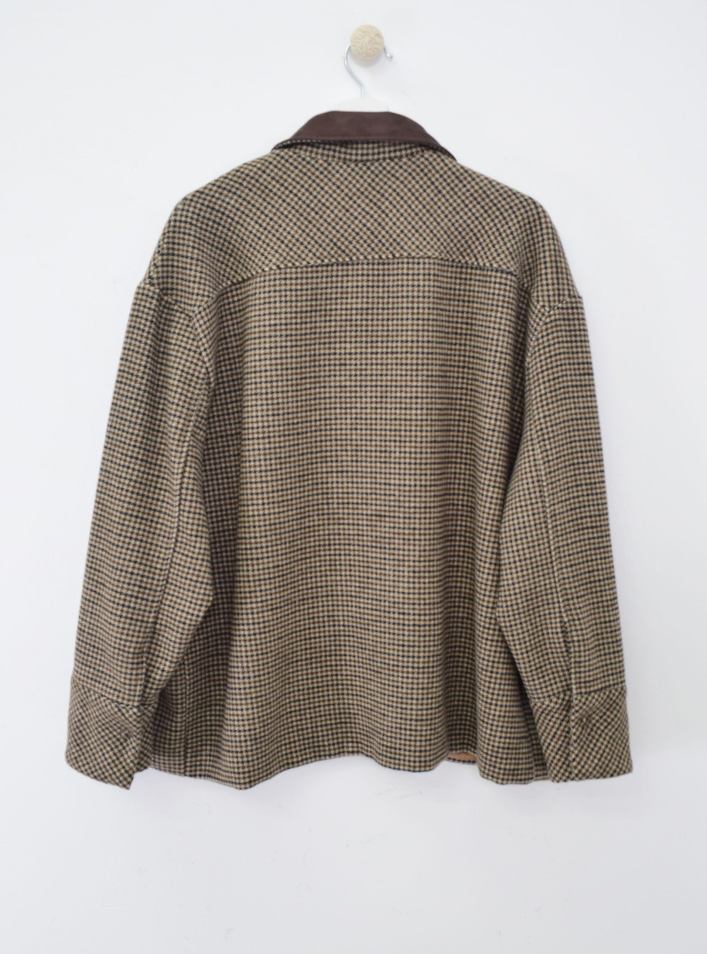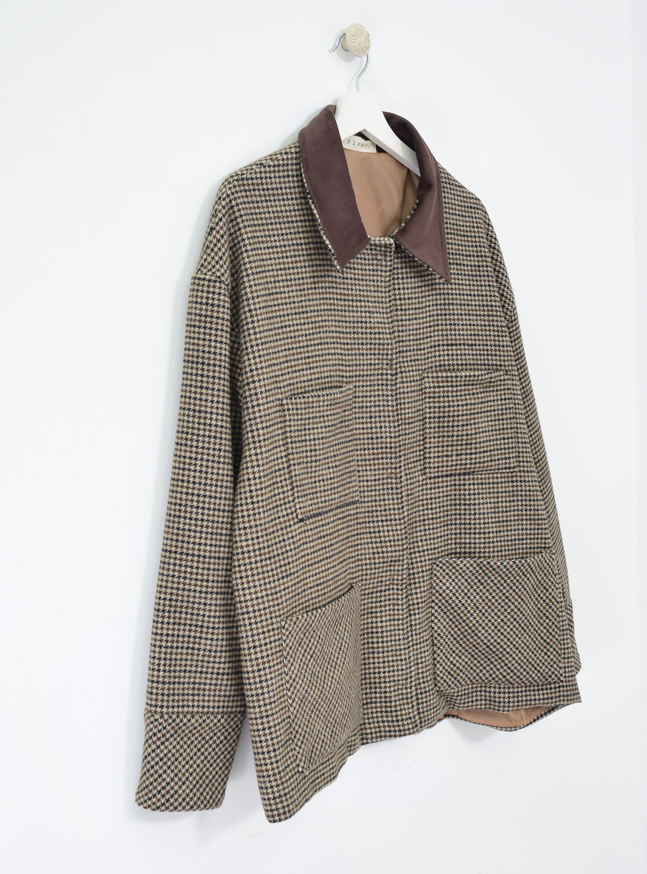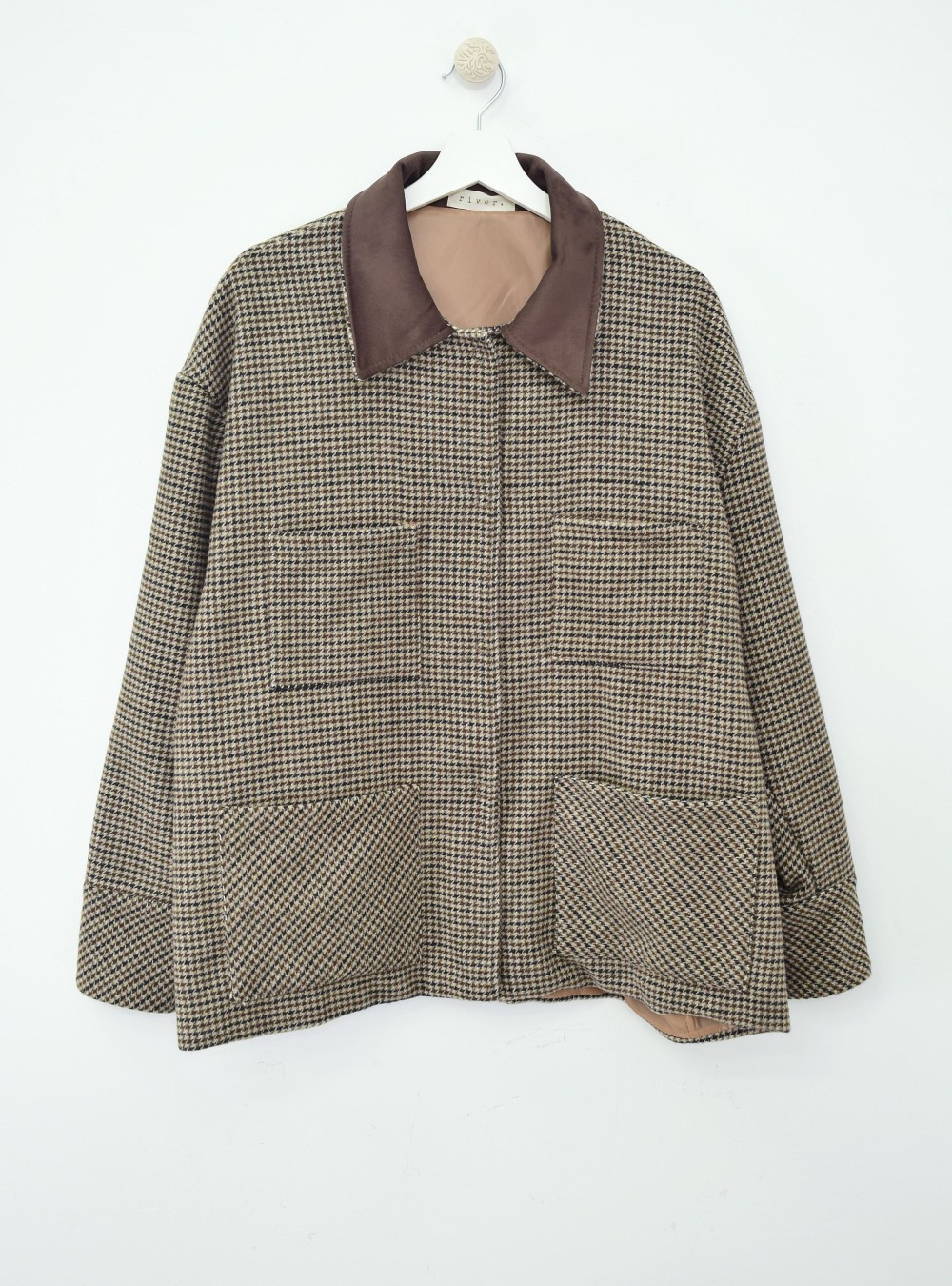 Abrigo ¾ de paño con corte oversize y un porcentaje de lana. Estampado pata de gallo en toda la prenda menos en el cuello que es liso de color chocolate. Cierre por botones automáticos, también en los puños. Tiene forro y cuatro bolsillos de parche por delante.