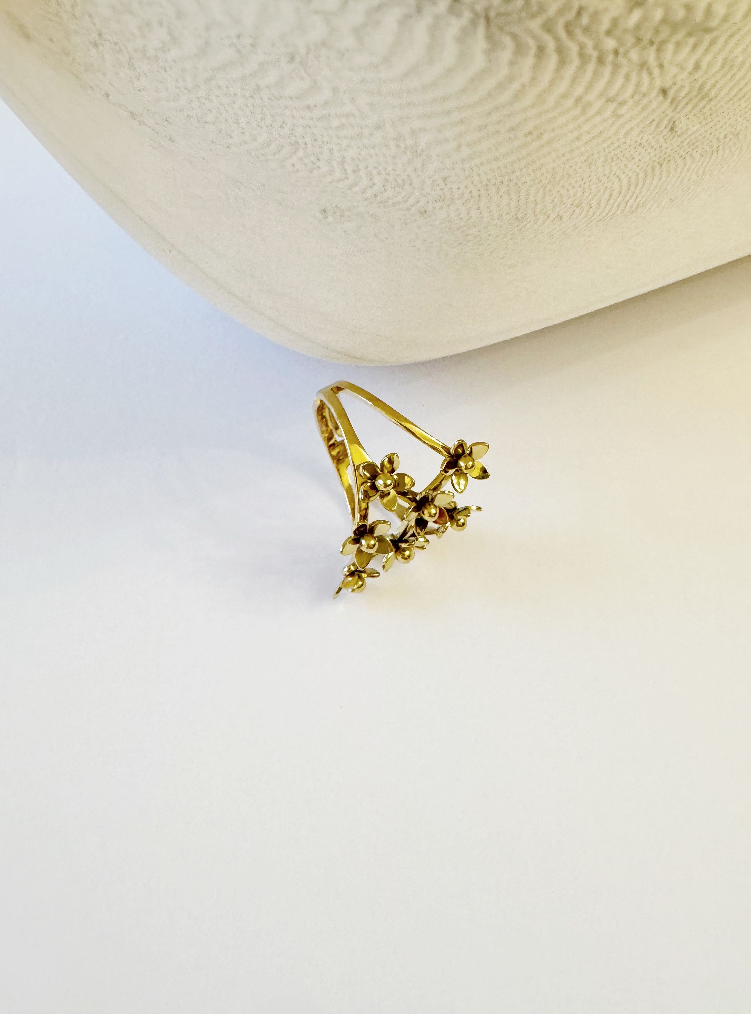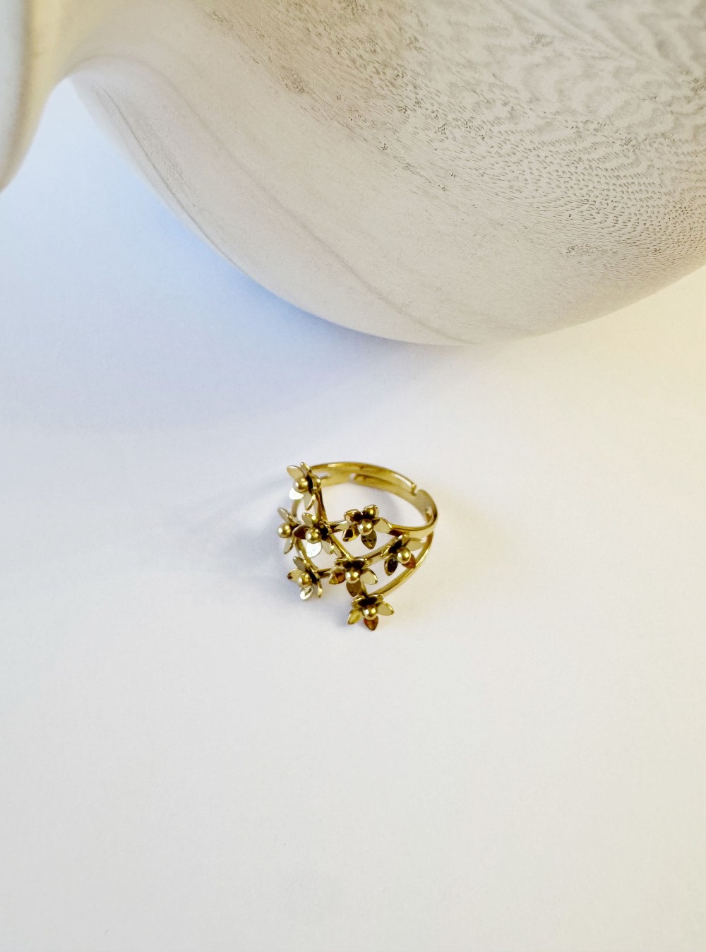Anillo de acero inox. abierto para poder ajustar el diámetro a tu dedo. Parte de arriba con entramado de flores en el mismo material y color.