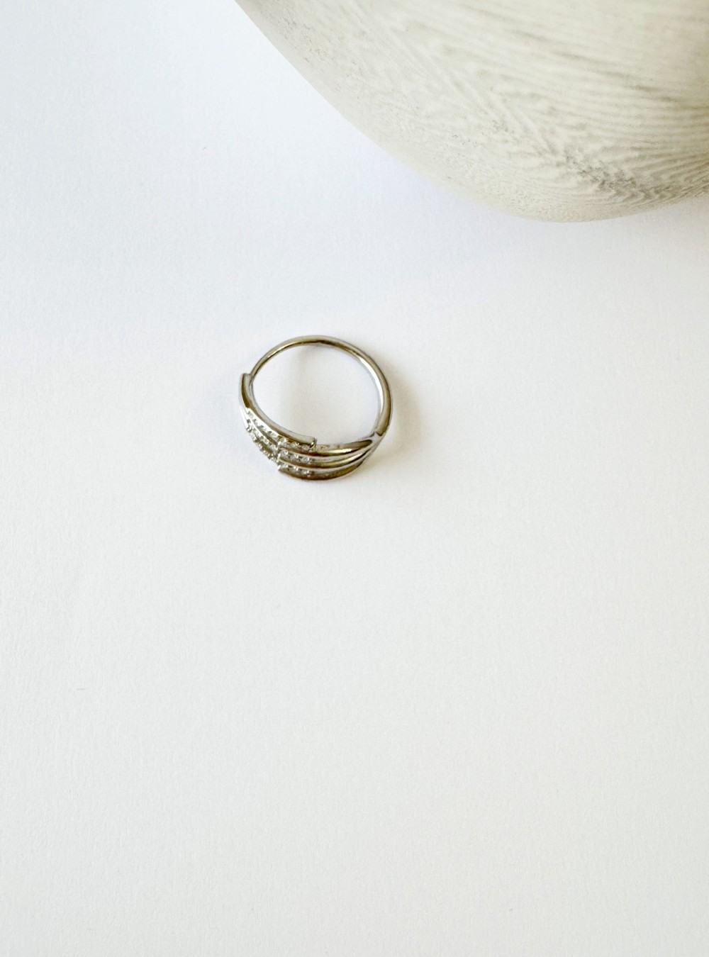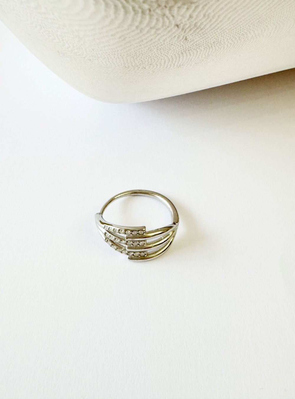 Anillo de acero inox. con tres dedos de cada lado que se entrelazan en la parte de arriba del anillo. Los dedos de una de las partes están rematados con circonitas transparentes. El anillo está abierto por lo que podrás ajustarlo a tu dedo.