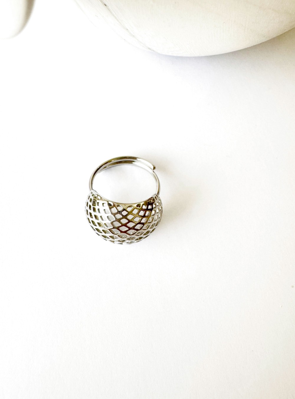 Anillo regulable de tamaño medio con una semiesfera perforada.