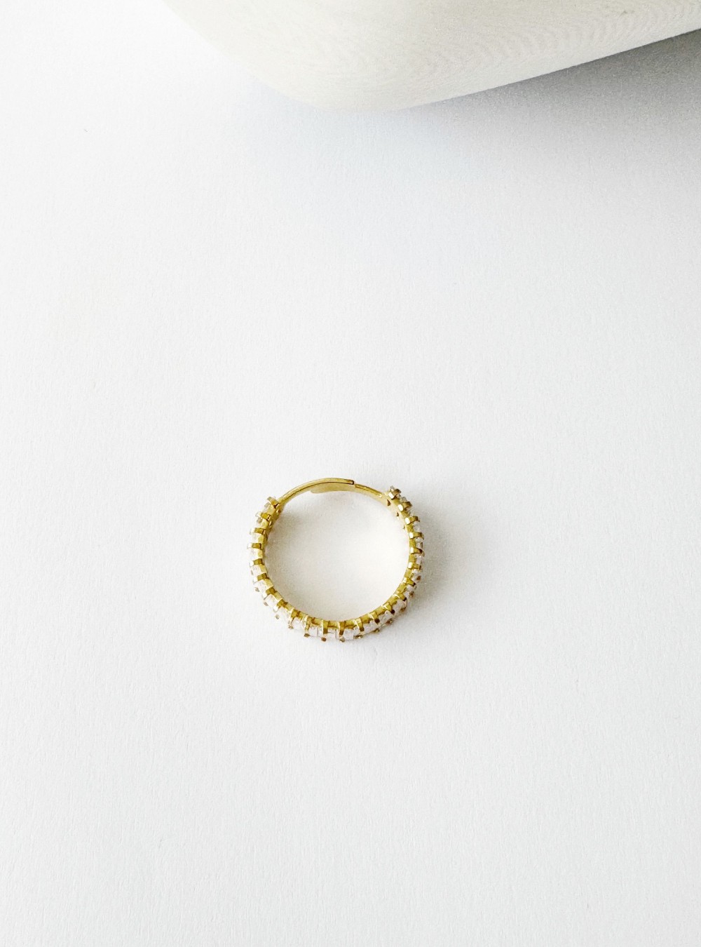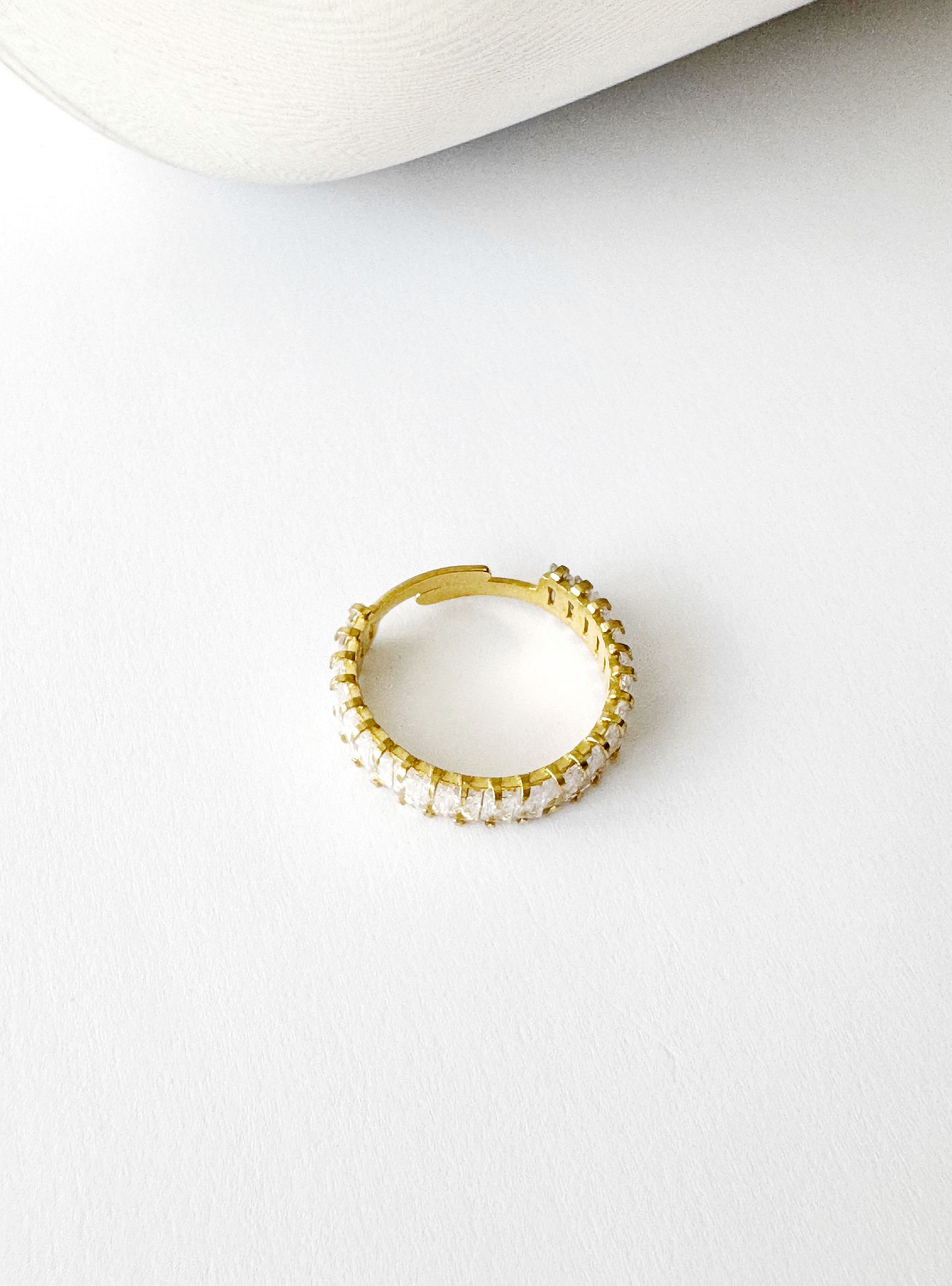 Anillo de acero inox. con circonitas engastadas en el exterior. Anillo abierto por lo que vas a poder regular el diámetro.