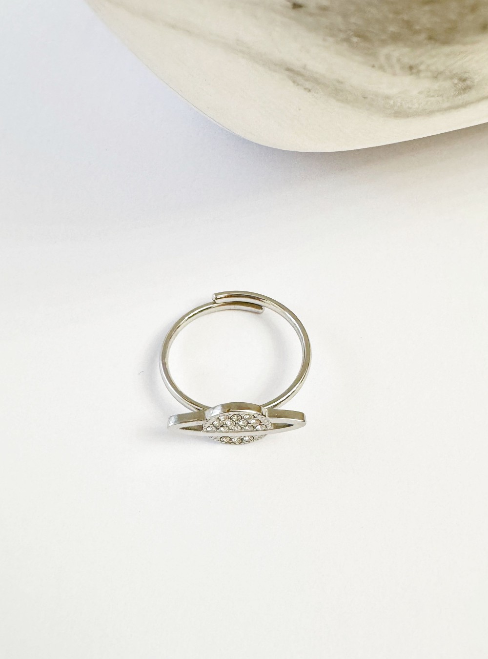 Anillo regulable con forma de planeta con pequeños brillos plata.