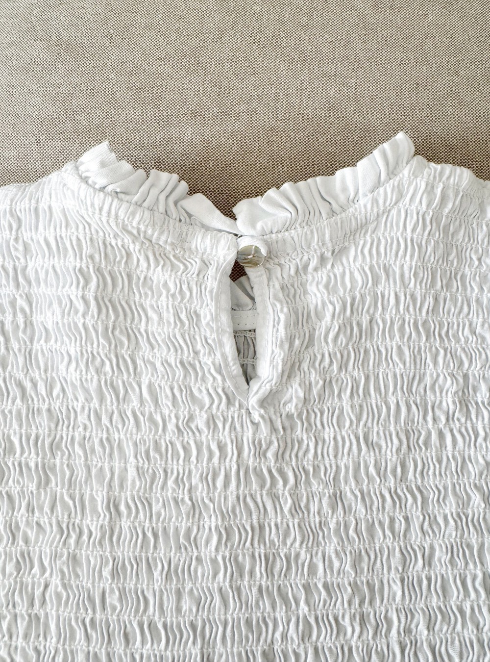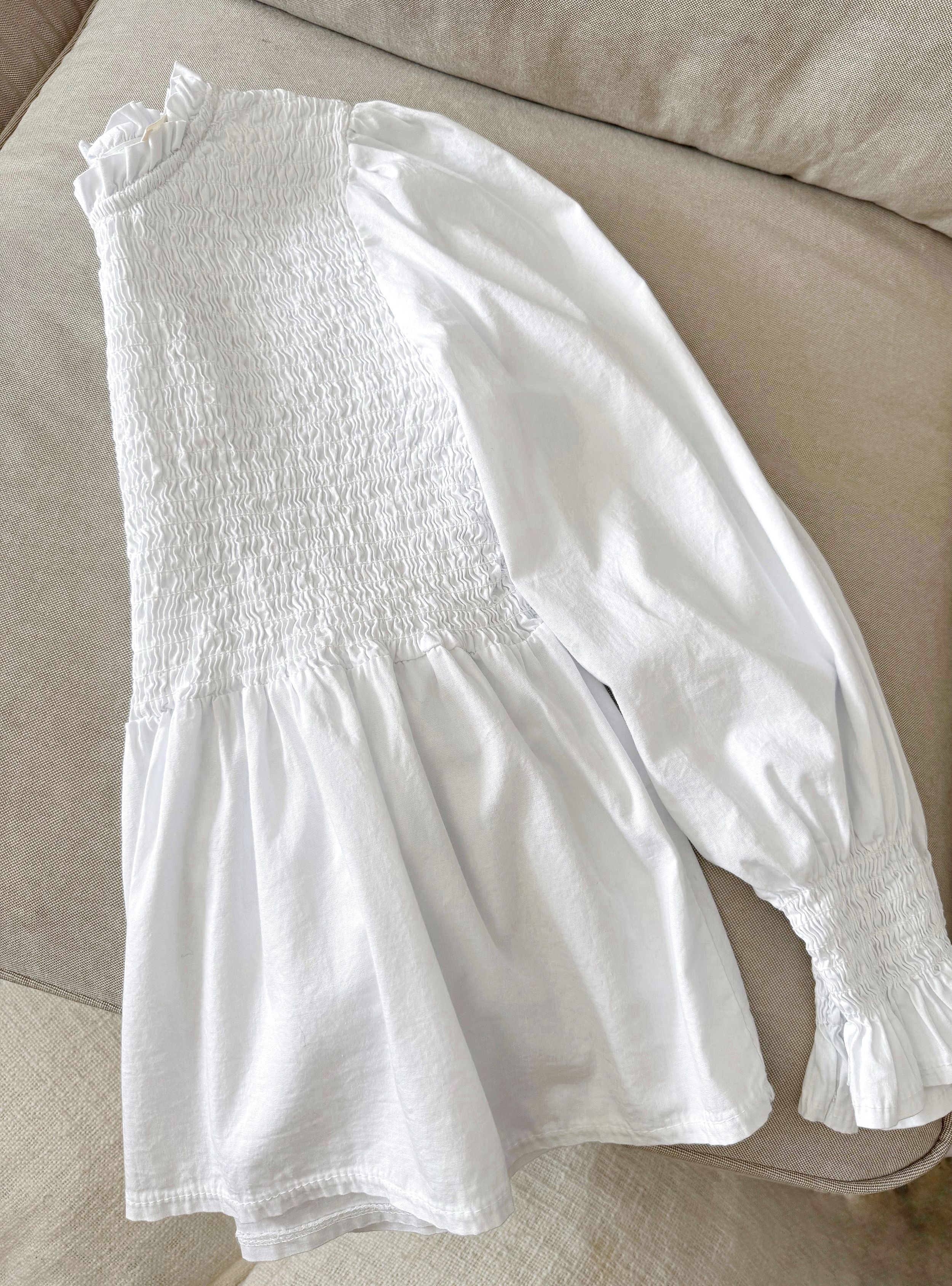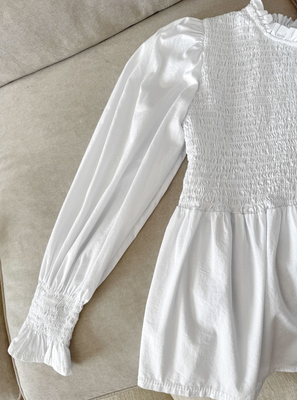 Blusa de manga larga en tejido de algodón con cuerpo y puños en nido de abeja. Cierre en la espalada mediante un botón de nácar. Fácil de combinar en tus look es un firme candidata para tu fondo de armario.