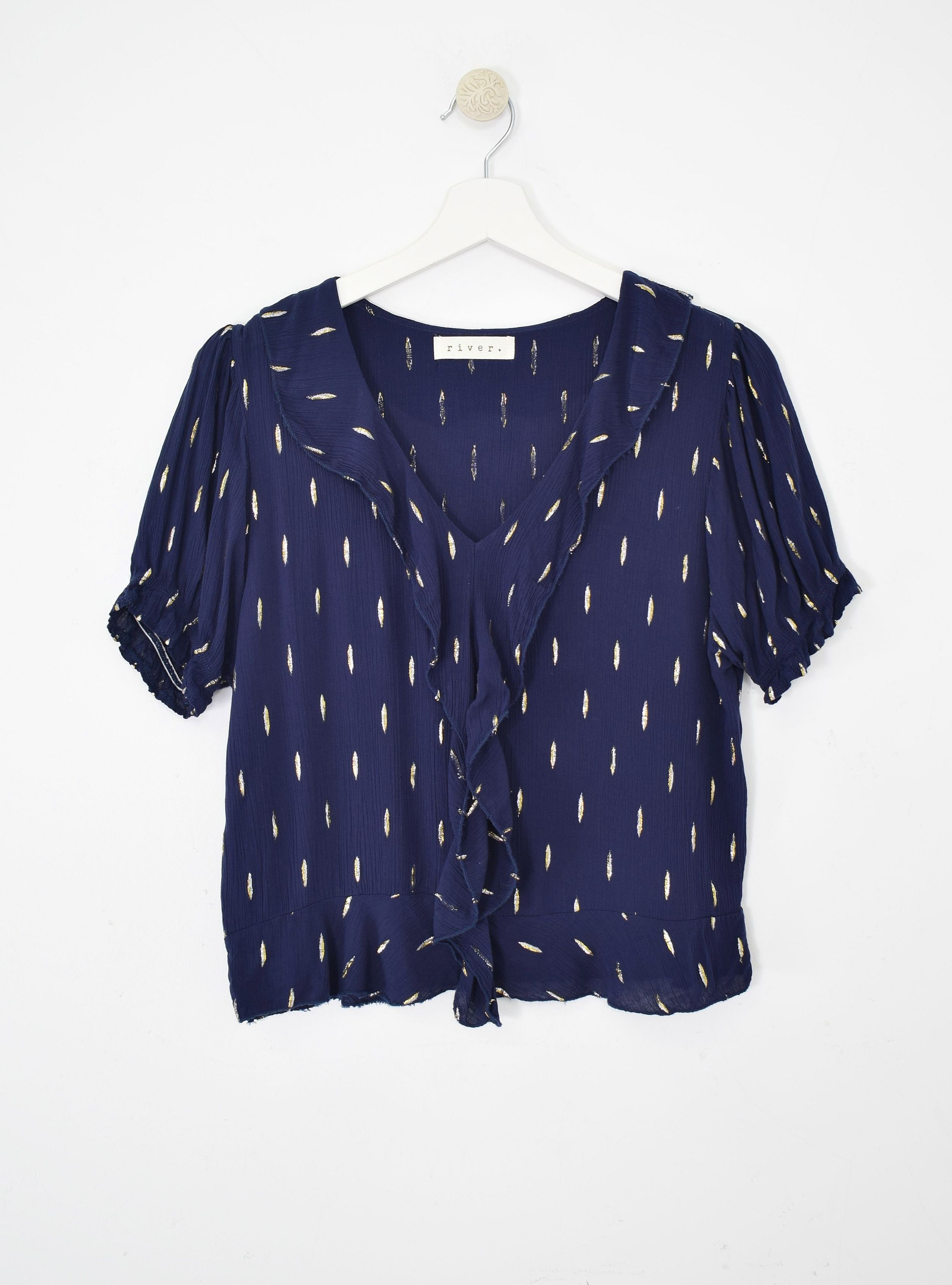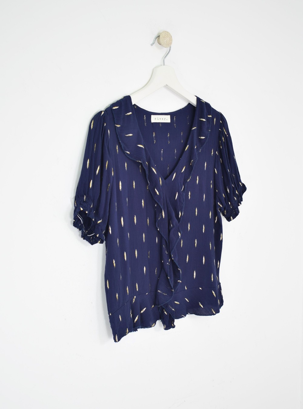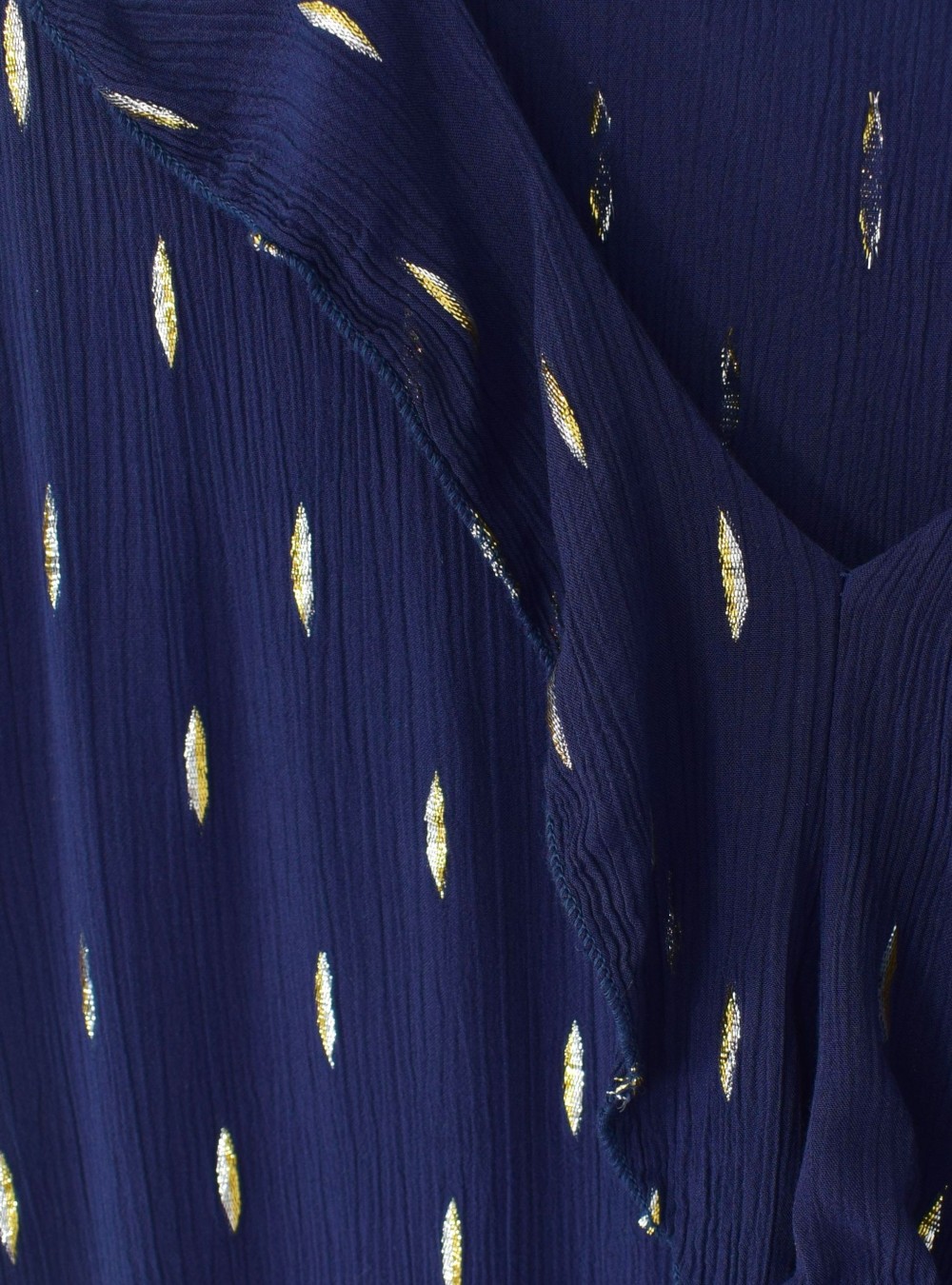 Blusa de manga corta en tejido de viscosa con topos de lurex en plata y dorado. Cuello en pico bordeado por un volante del mismo tejido. Tejido muy suave y con mucha caída. Perfecta para combinar con jeans en la gama de azules, con negro para looks súper estilosos y con colores claros para looks de día.