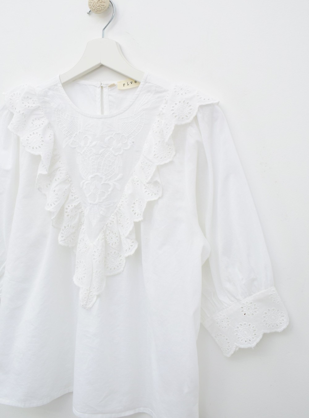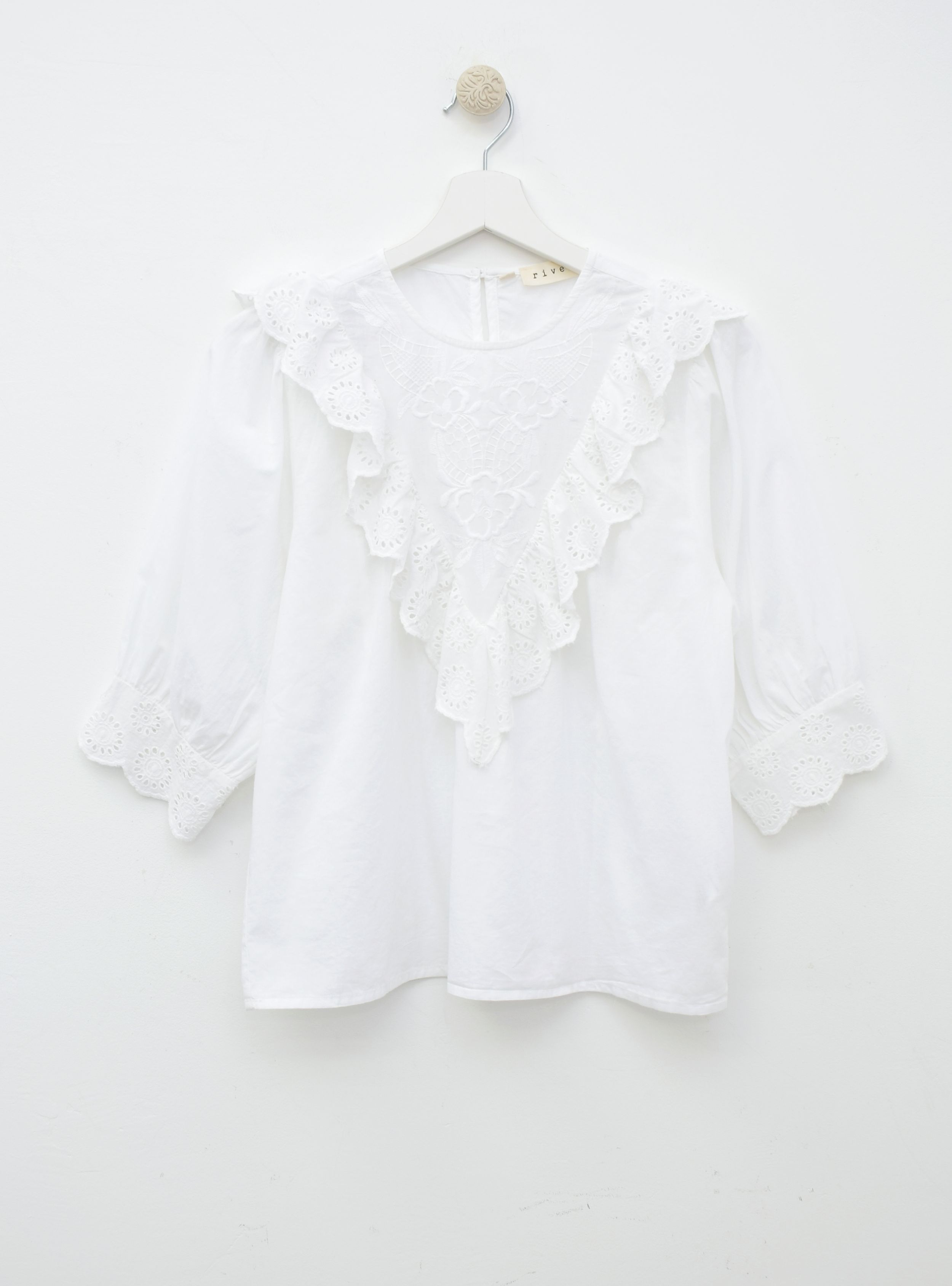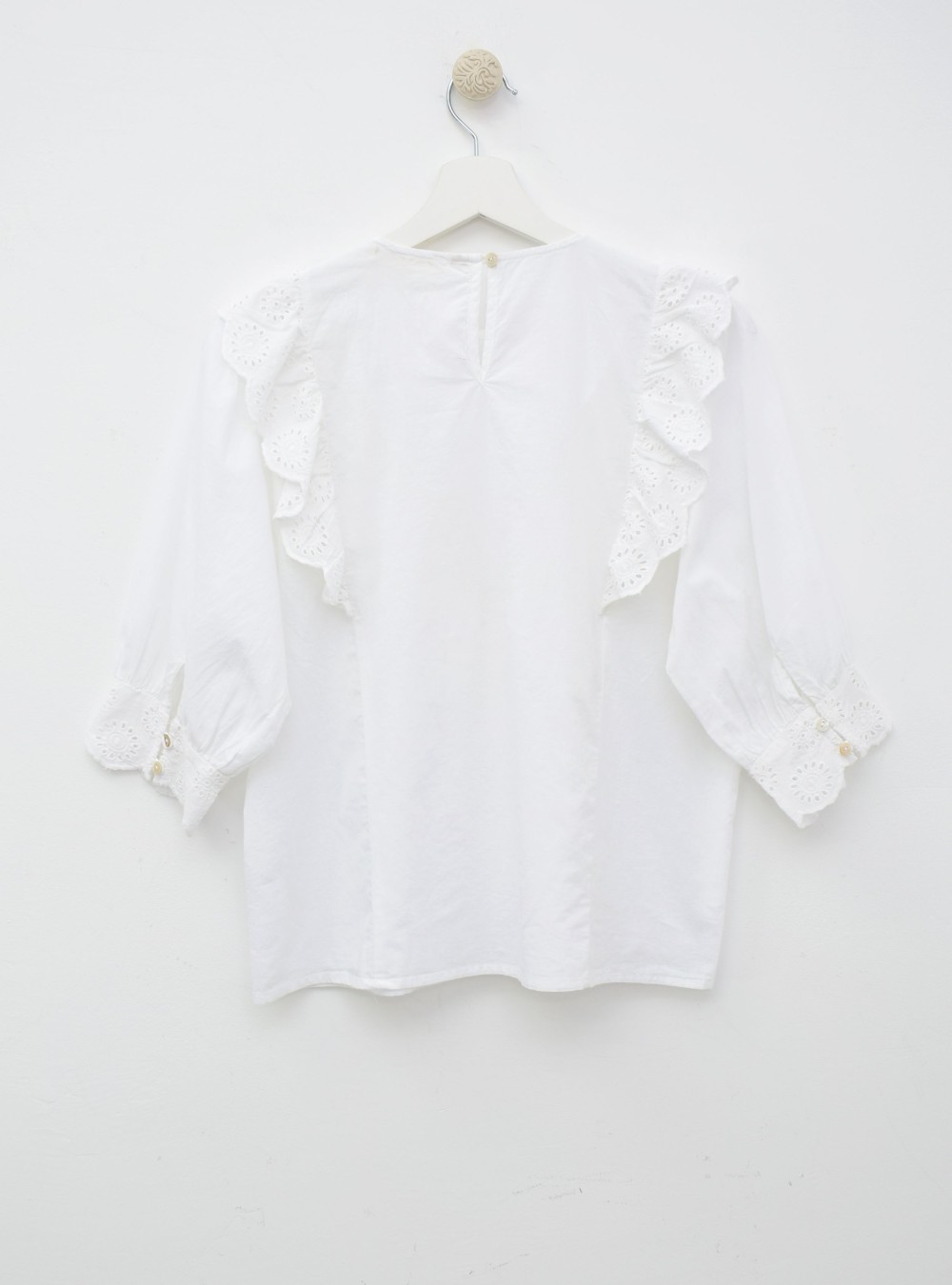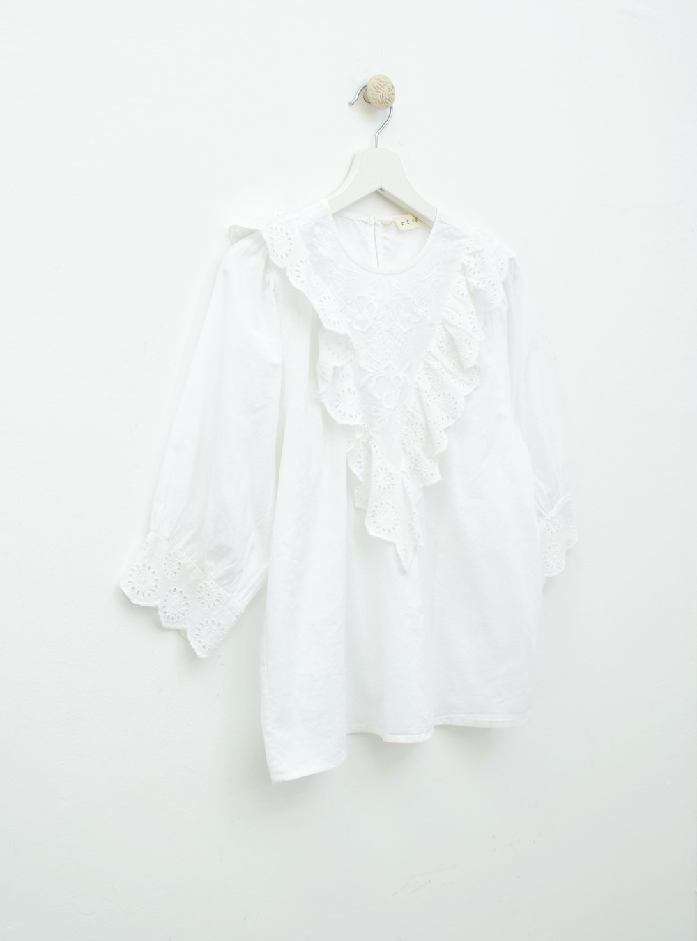 Blusa de corte holgado en tejido de algodón 100%. Tiene volantes perforados a lo largo del tejido y un bordado floral en la parte de delante. Es una prenda atemporal y romántica que elevará seguro tus looks del día a día.