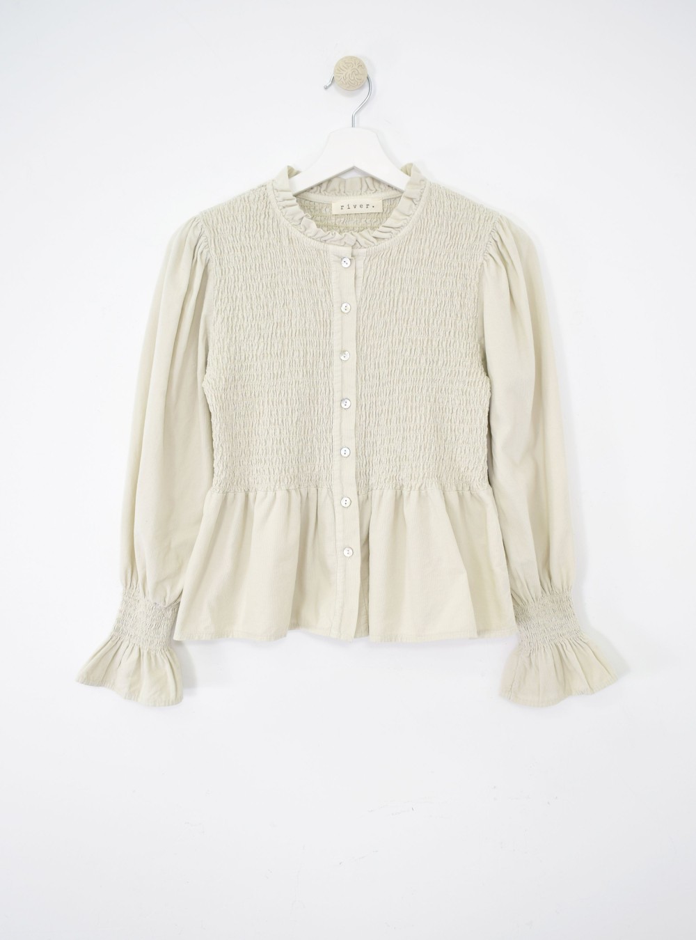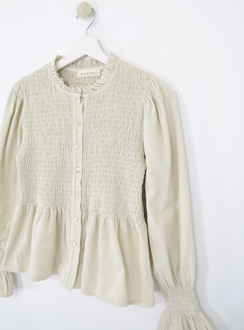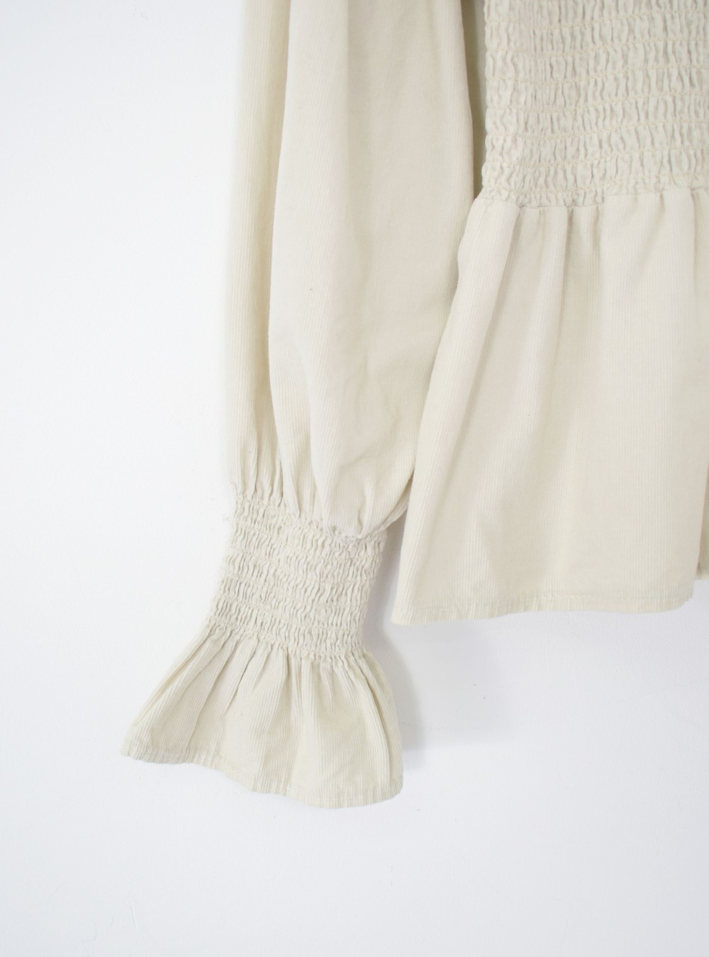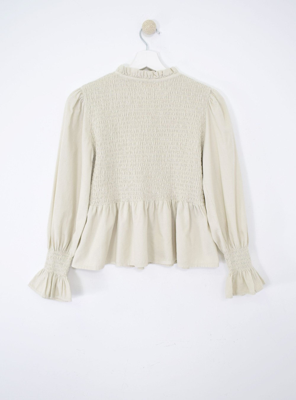 Blusa de manga larga en tejido de pana con elásticos en pecho y puños. Cierre por delante mediante botones de nácar. Cuello y puños fruncidos.