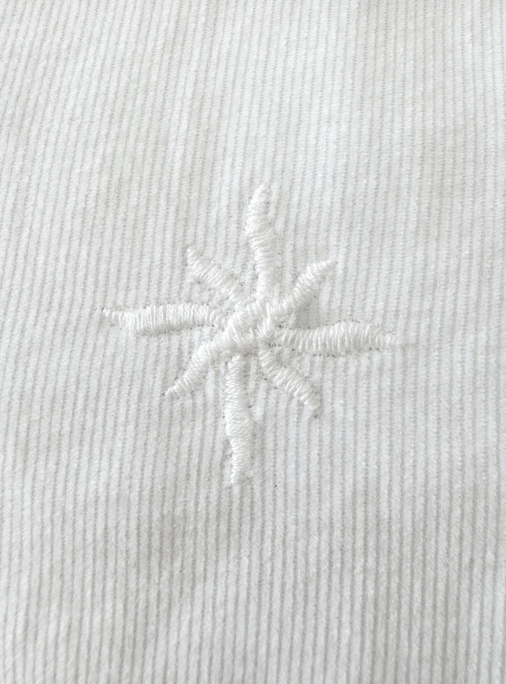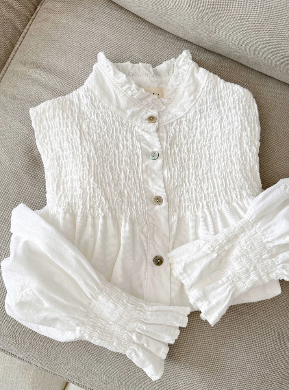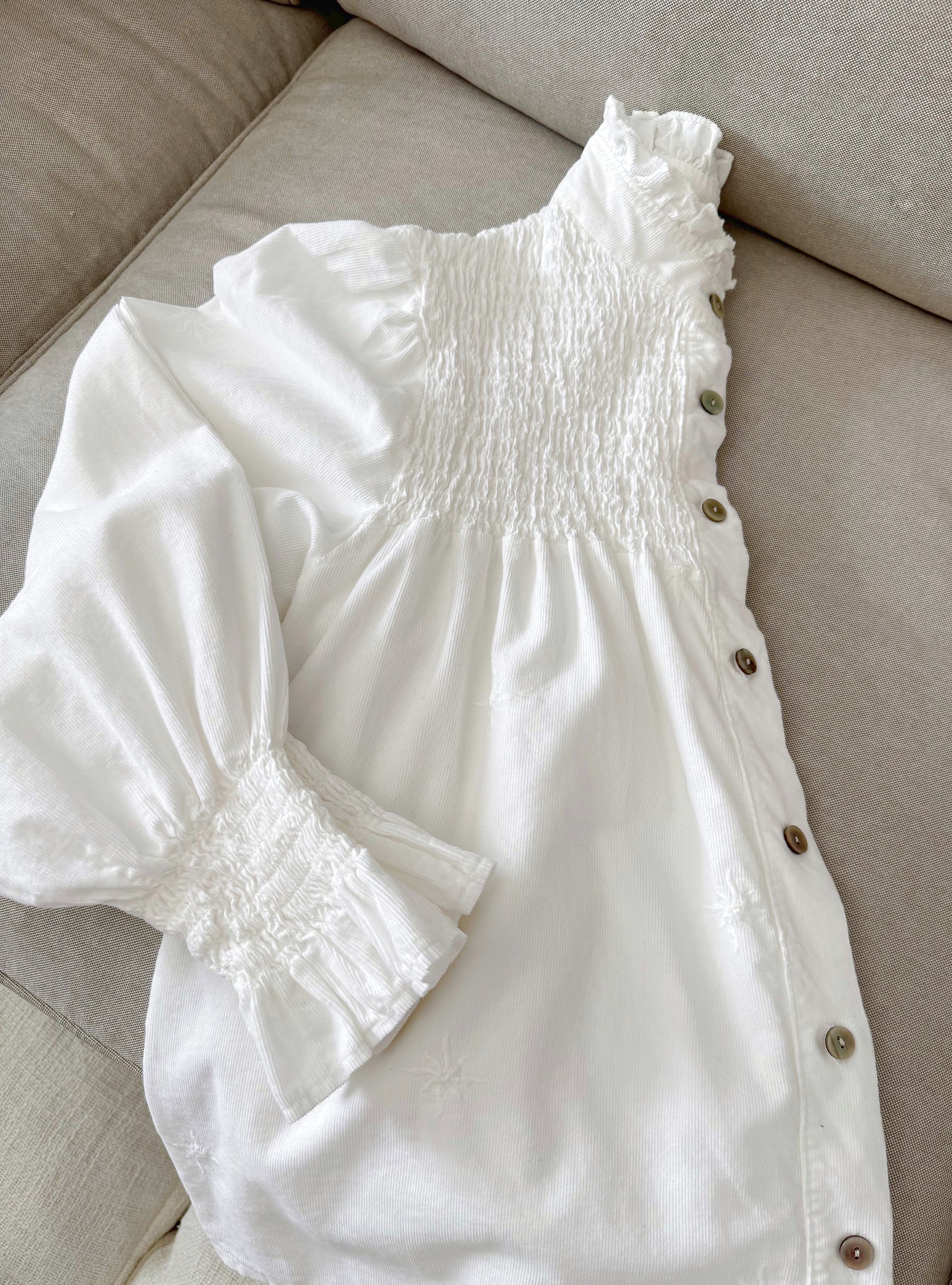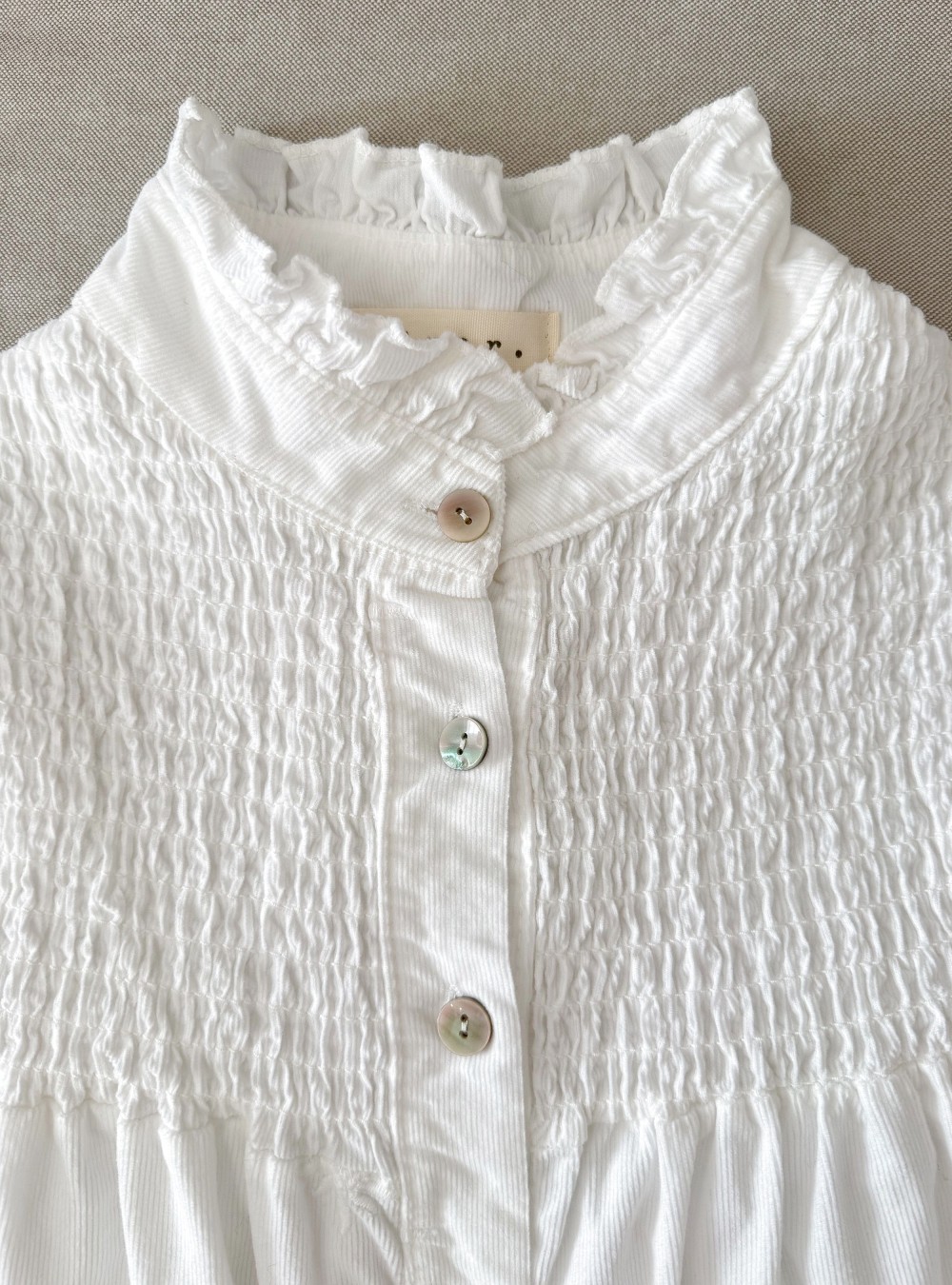 Blusa de micropana con soles bordados a lo largo del tejido. Cuello mao. Bordado de nido de abeja en la parte superior. Corte holgado. Mangas abullonadas.