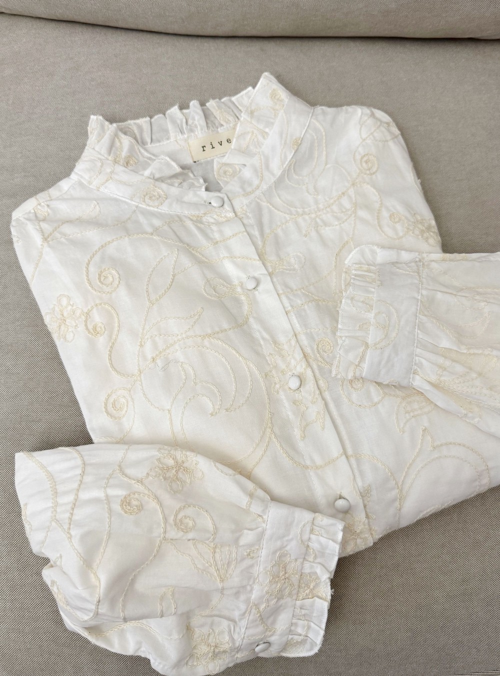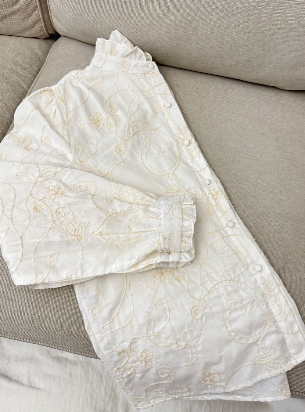 Blusa romántica en tejido de algodón con bordados florales en contraste a lo largo del tejido. Cuello mao. Cierre por medio de botones forrados del mismo tejido.