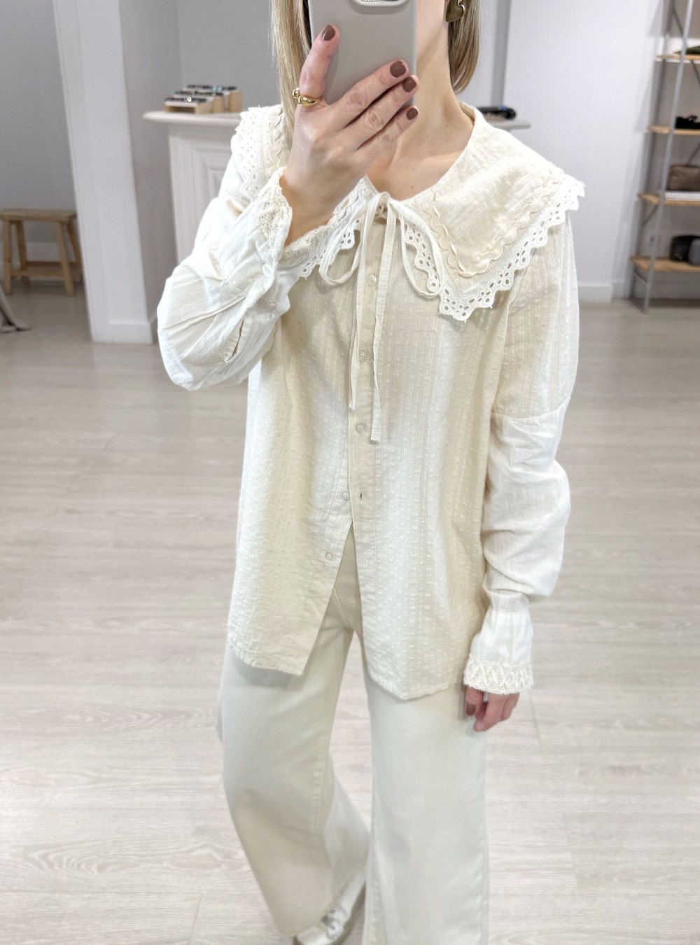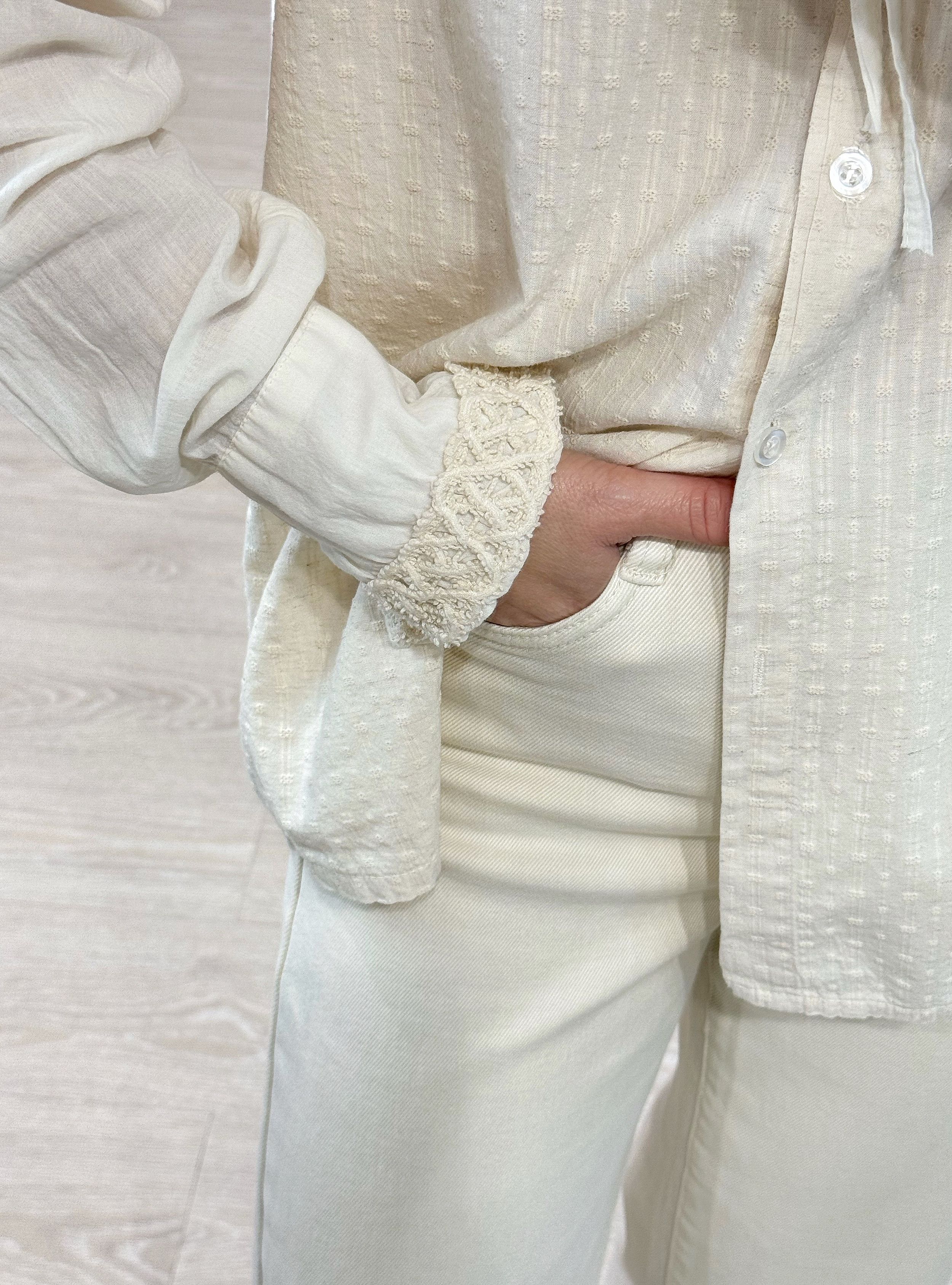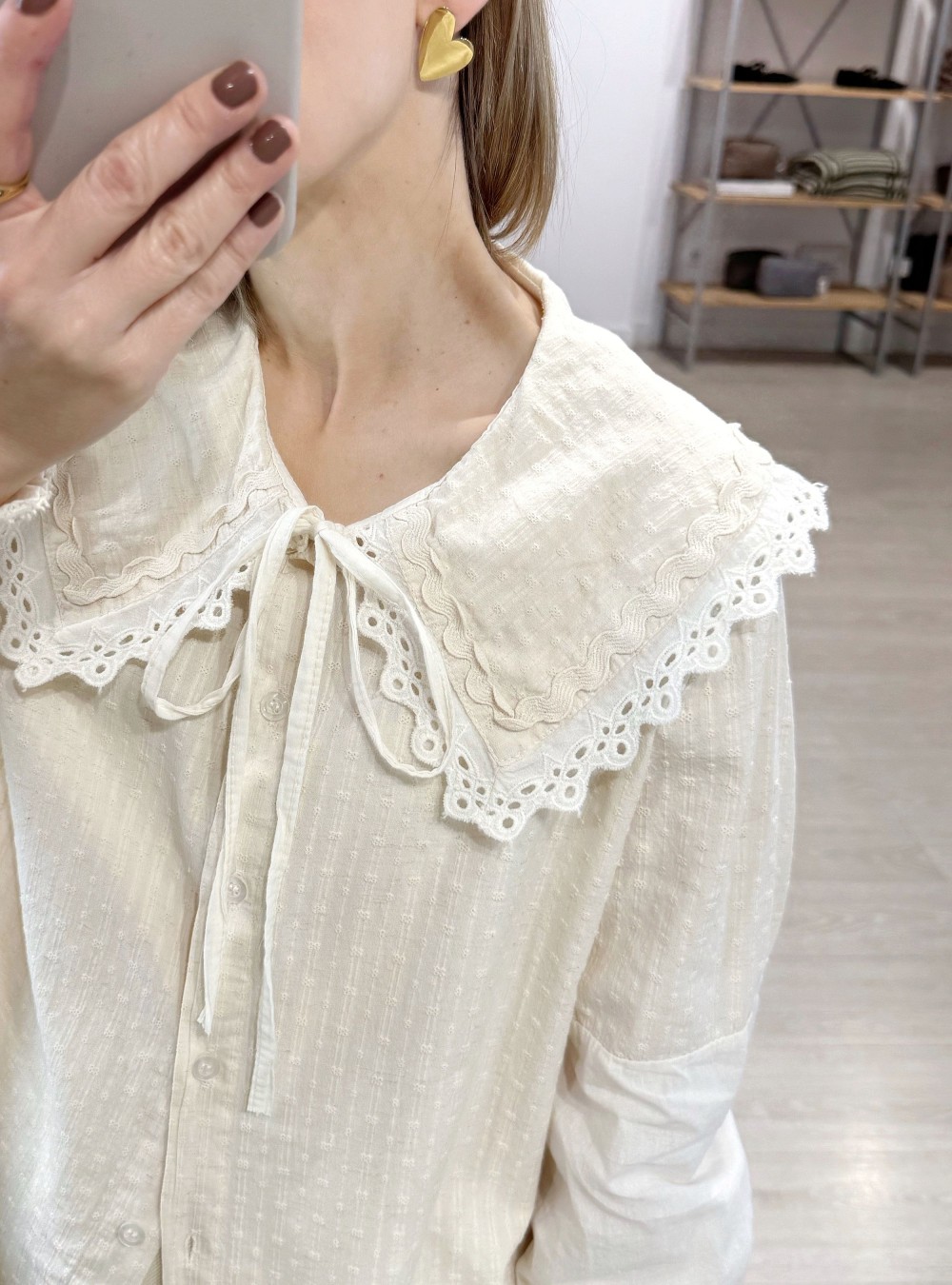 Blusa combinada con mini bordados en el tejido. Cuello bebé con lazo del mismo tejido. Corte amplio. Puedes mezclarla con un jeans de la misma gama de color y nuestro abrigo de borreguito en color chocolate para un look de día muy actual.