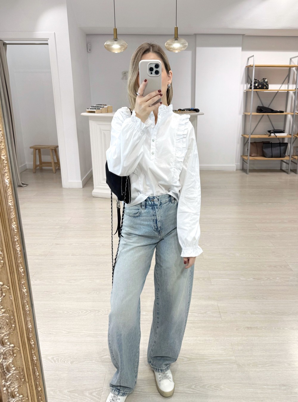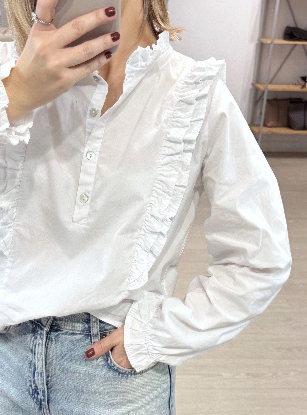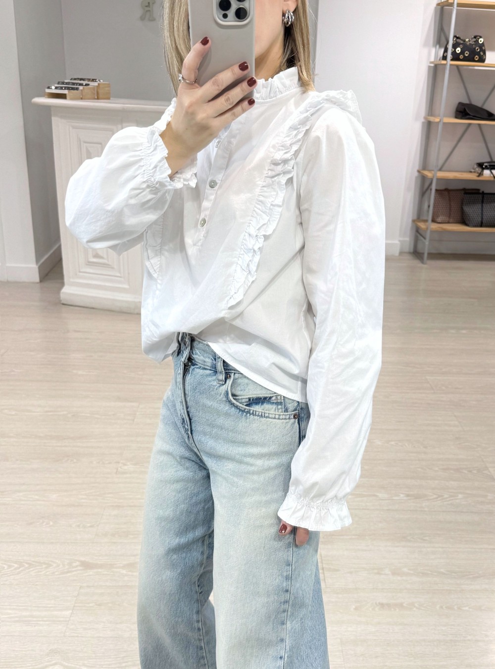 Blusa romántica en tejido de algodón 100%. Cuello mao. Tiene pequeños volantes. Corte clásico.