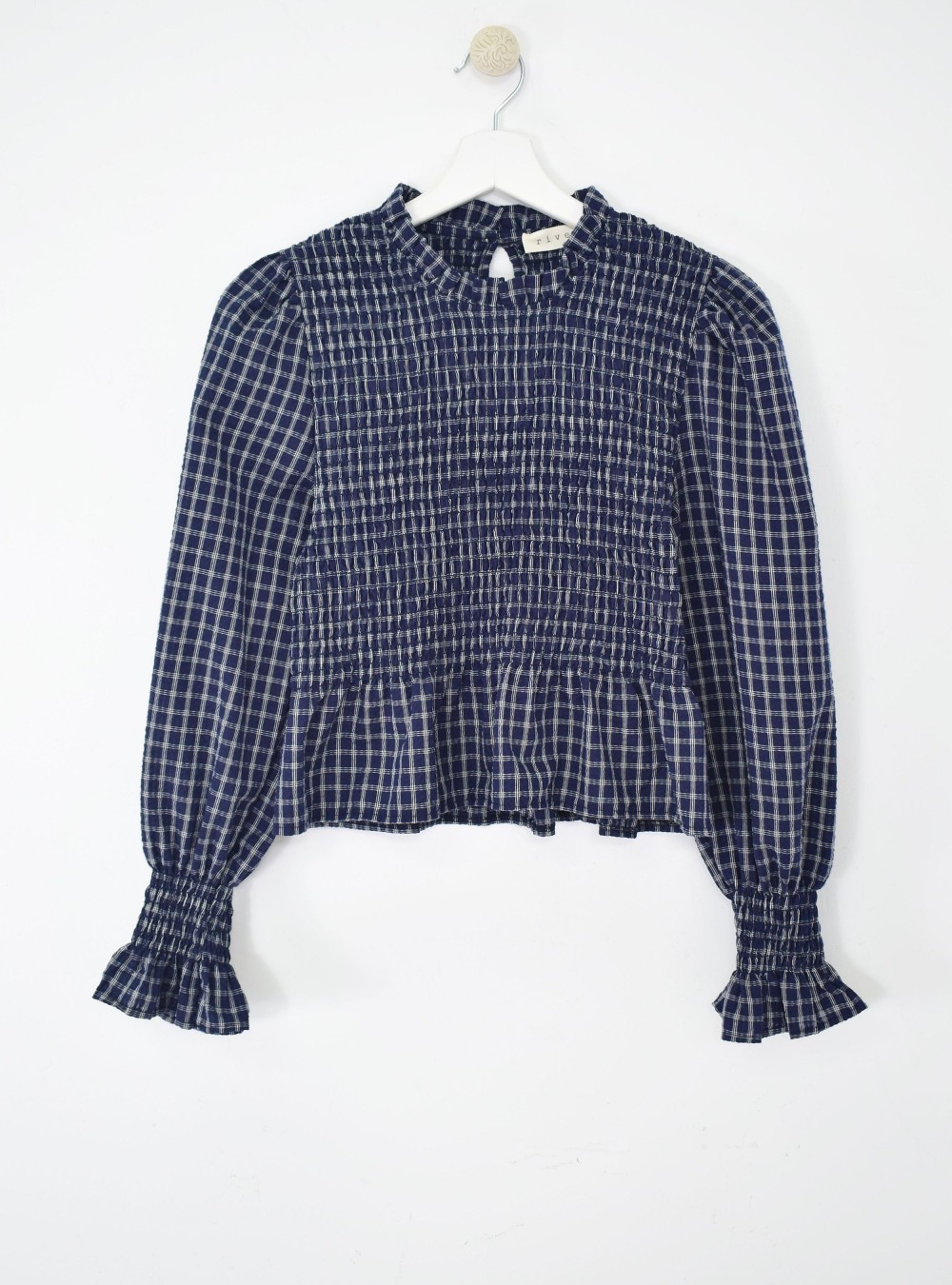Blusa de manga larga en tejido de bambula y cuadros con elástico en la parte del cuerpo y en los puños. Cierre en la espalda mediante un botón de nácar. Perfecta para combinaciones del día a día con tus jeans y faldas lisas preferidos.