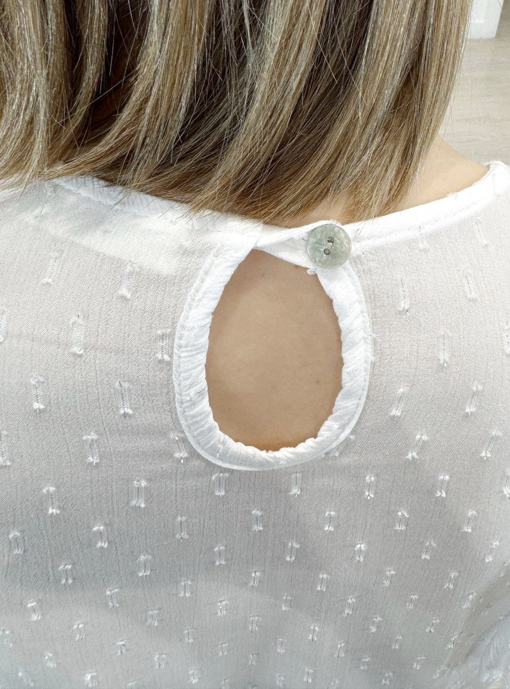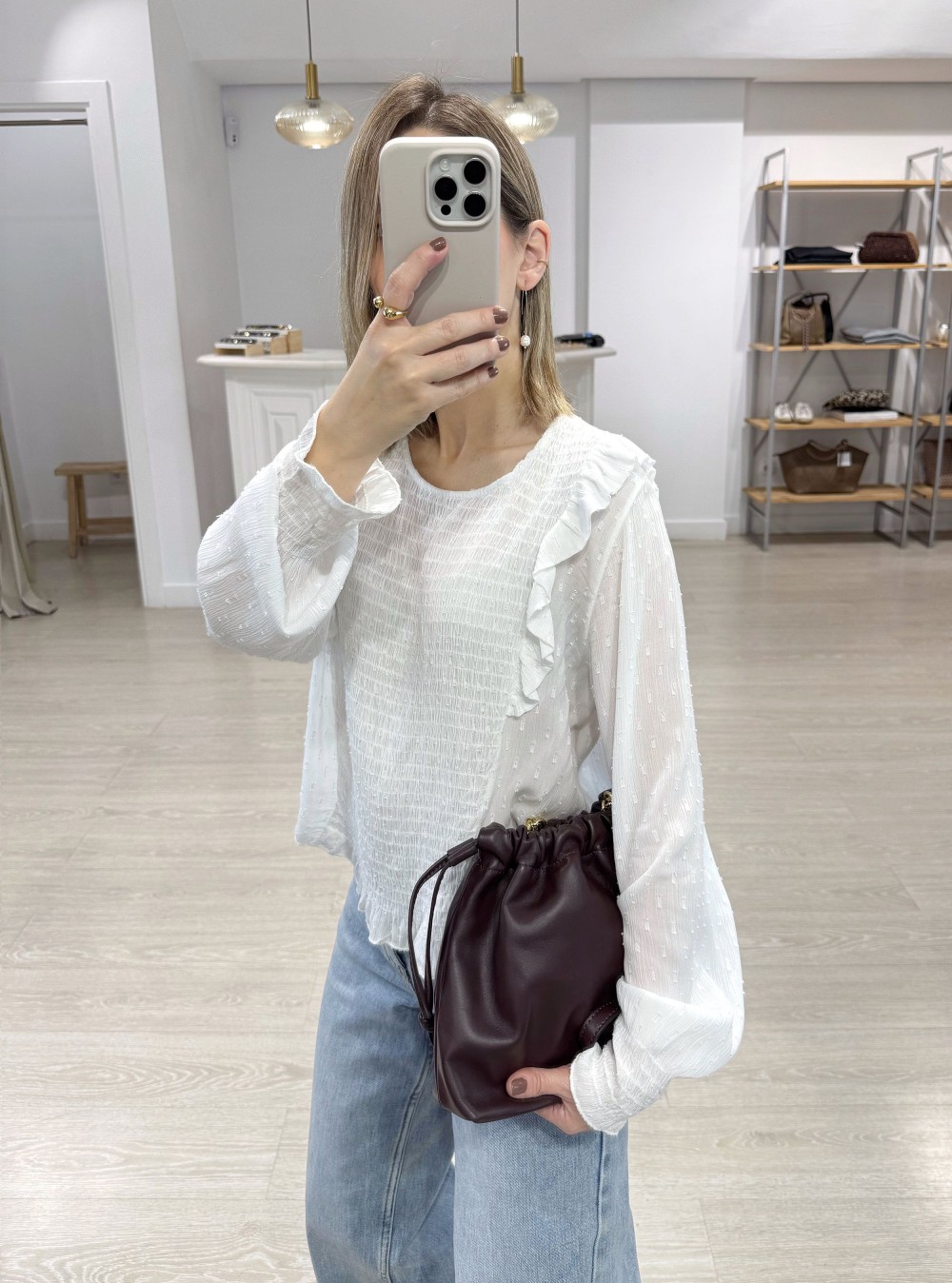 Blusa de manga larga en tejido de viscosa, con mucha caída y muy suave al tacto. Tiene elástico en la parte de delante y en los puños. Decorada con plumeti con interior de lurex en todo el tejido. Cuello redondo y cierre en espalda mediante un botón de nácar. Te proponemos combinarla con unos jeans en azul claro, bolso chocolate y como parte de arriba una blazer lisa en colores claros.