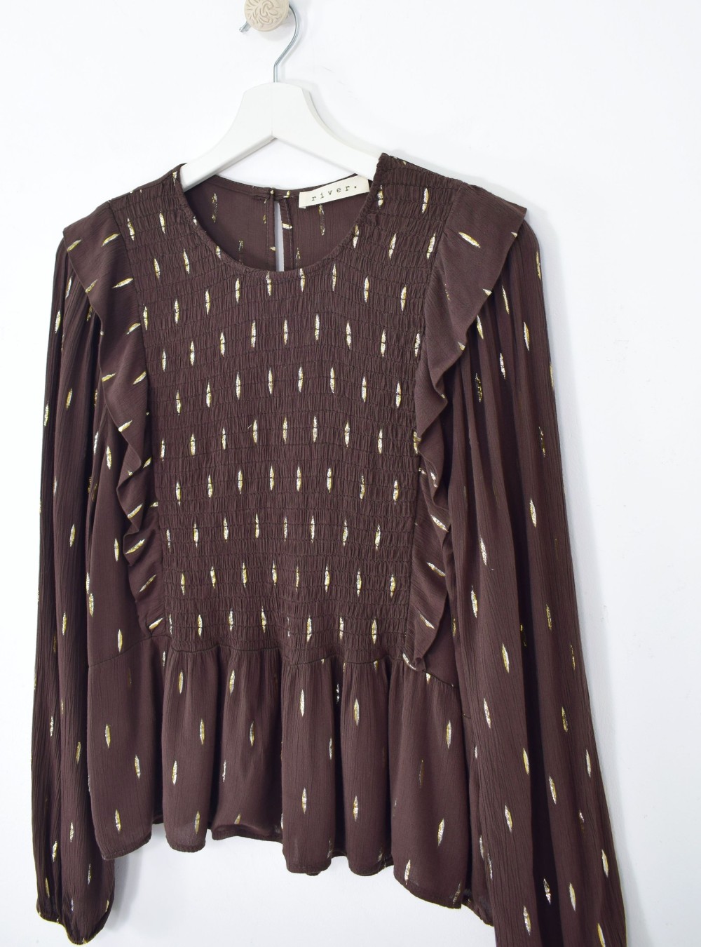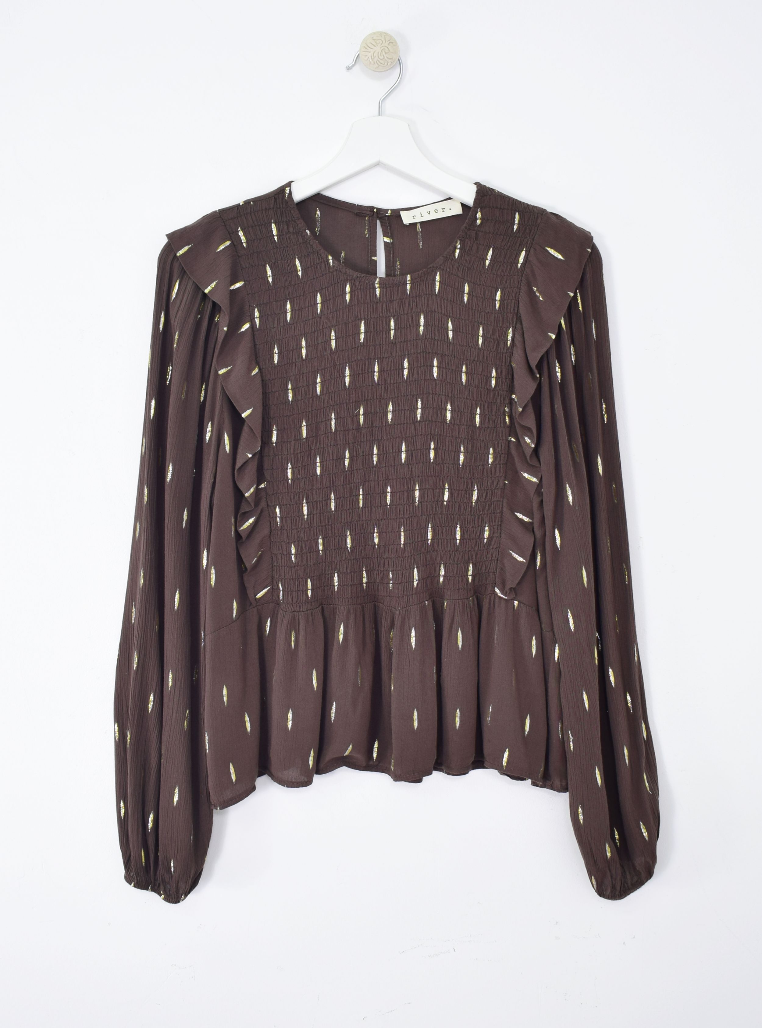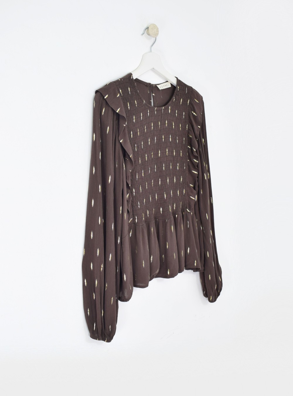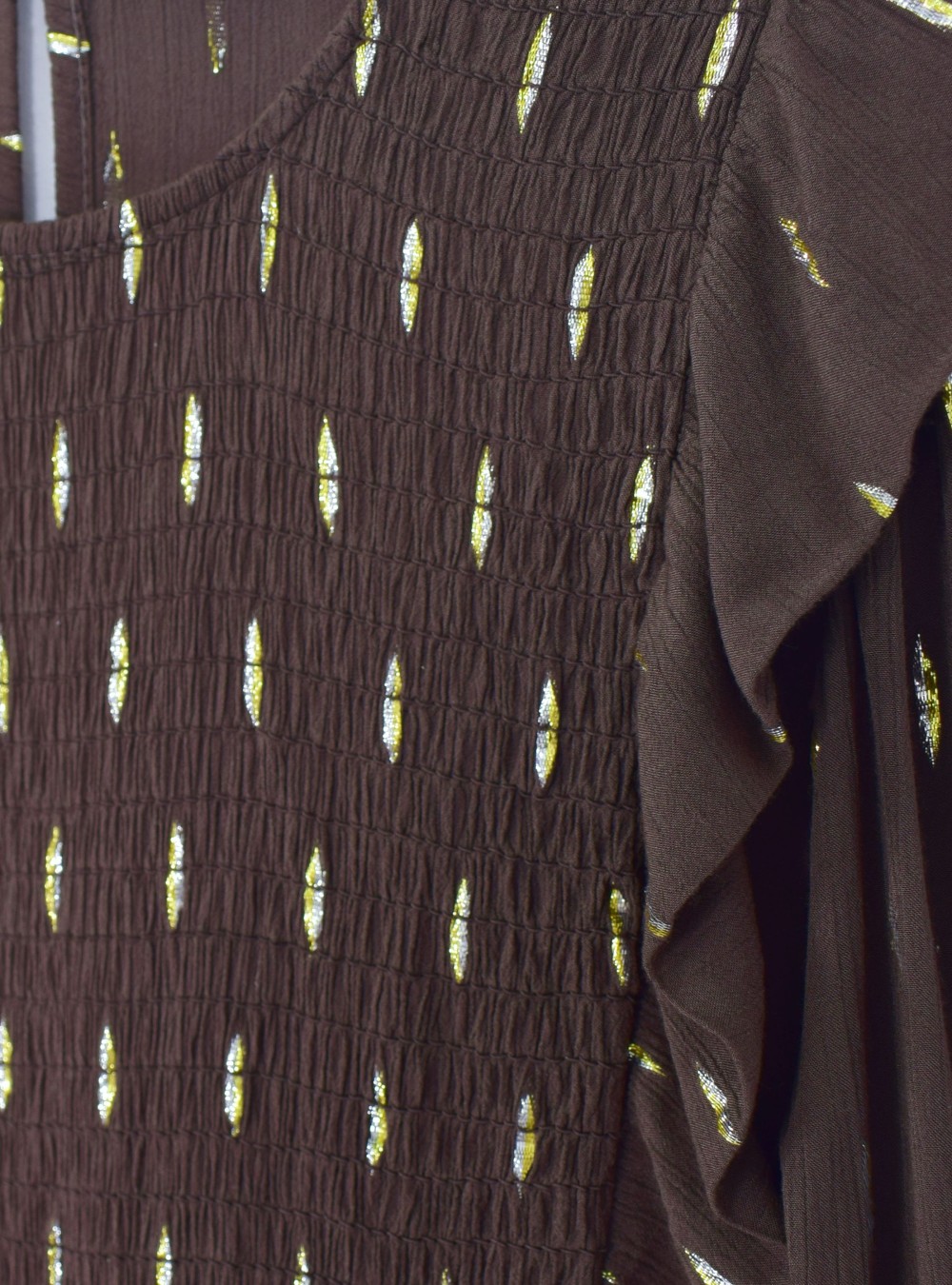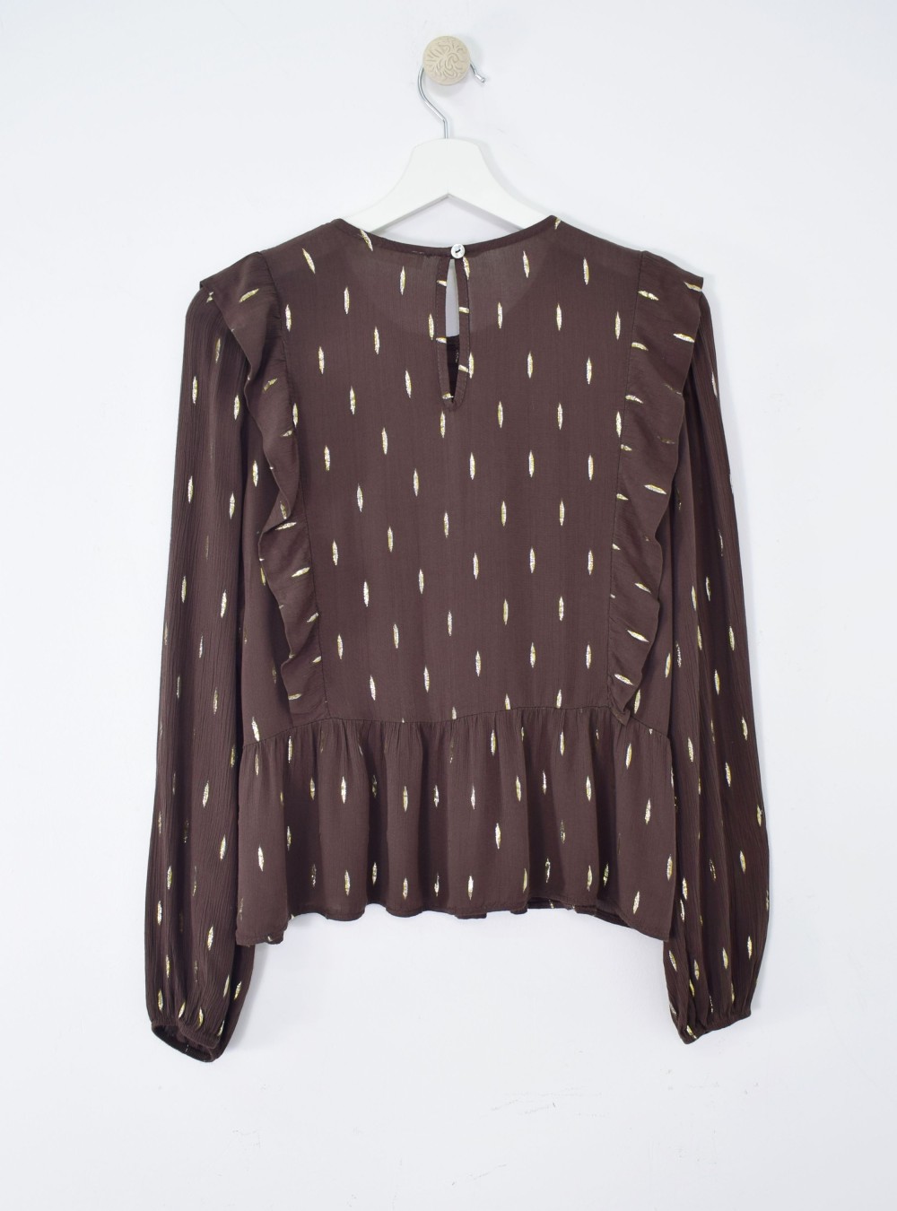 Blusa romántica fluida con detalles de lurex en plata y dorado. Cuello redondo. Volante en la parte baja. Transparenta un poco. Cierre por medio de botón en la parte de atrás.