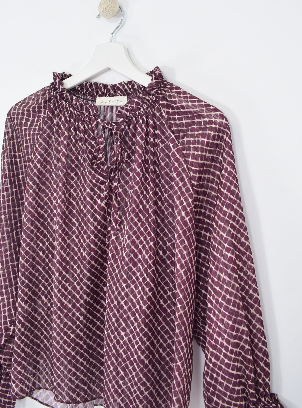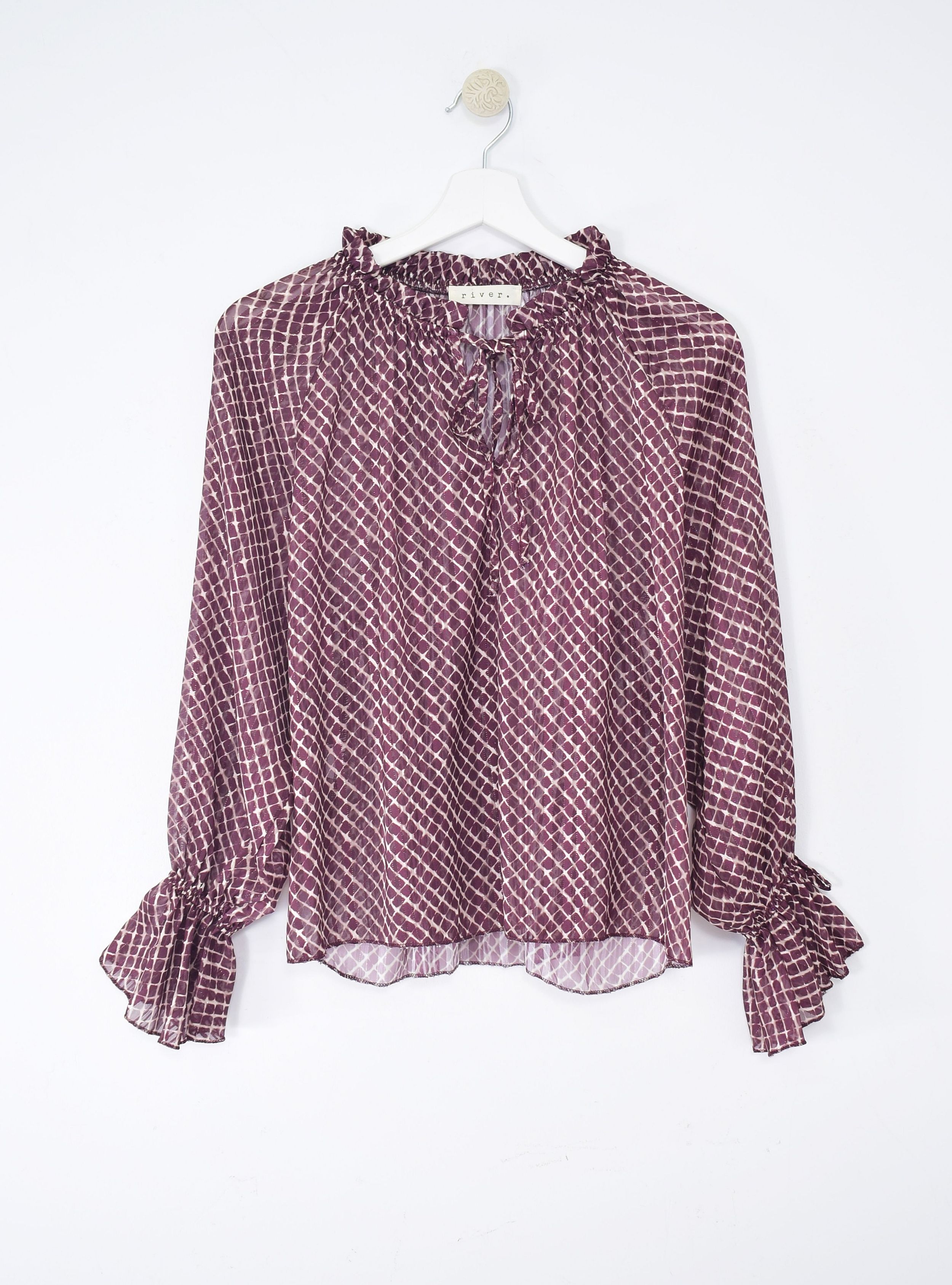 Blusa boho con estampado geométrico y detalles de lurex. Cuello mao que se cierra por medio de un lazo del mismo tejido. Elástico y lazos en los puños. Transparenta un poco. Puedes mezclarla con un jeans, una americana y unos botines de tacón para un look de oficina.