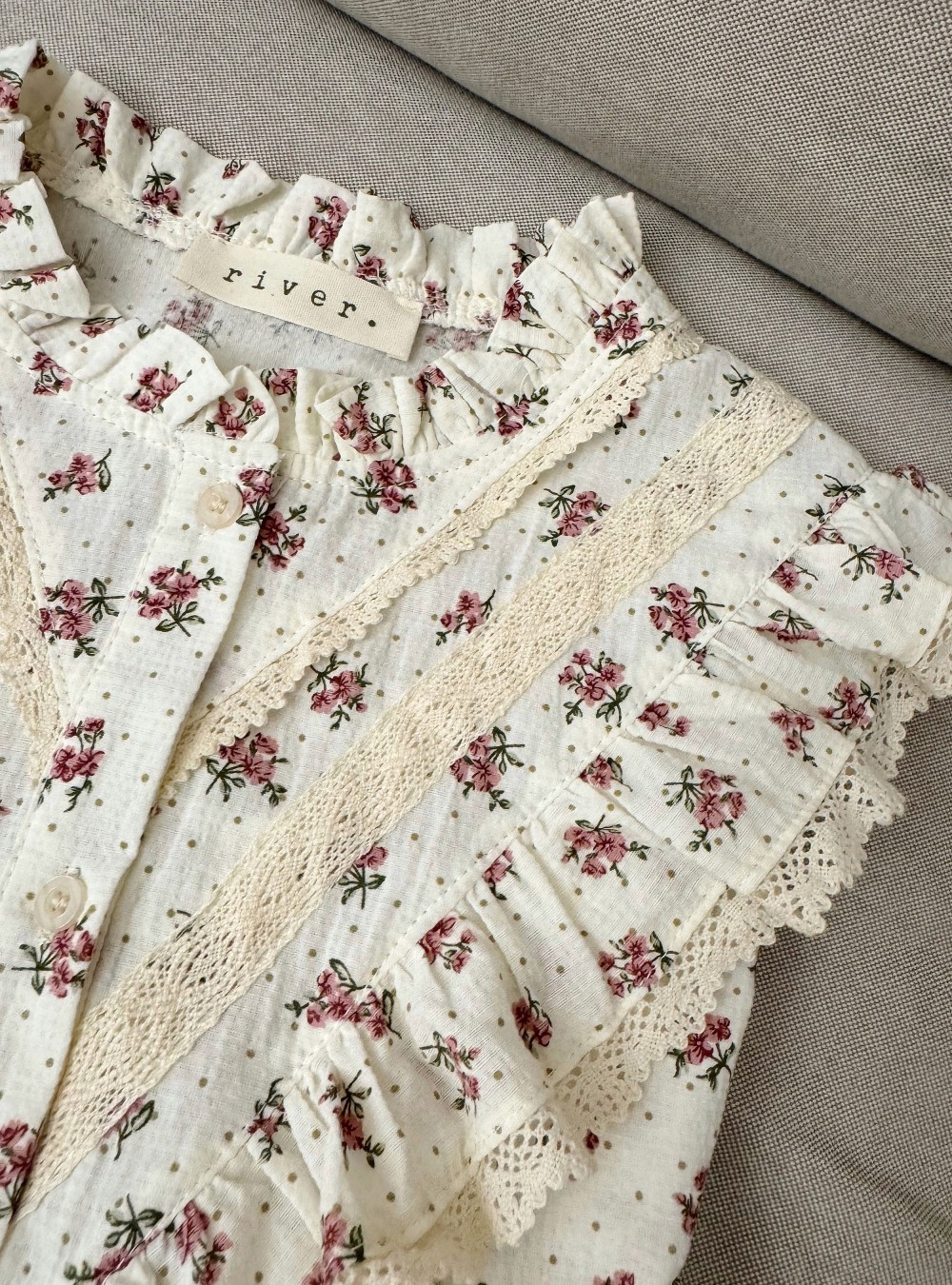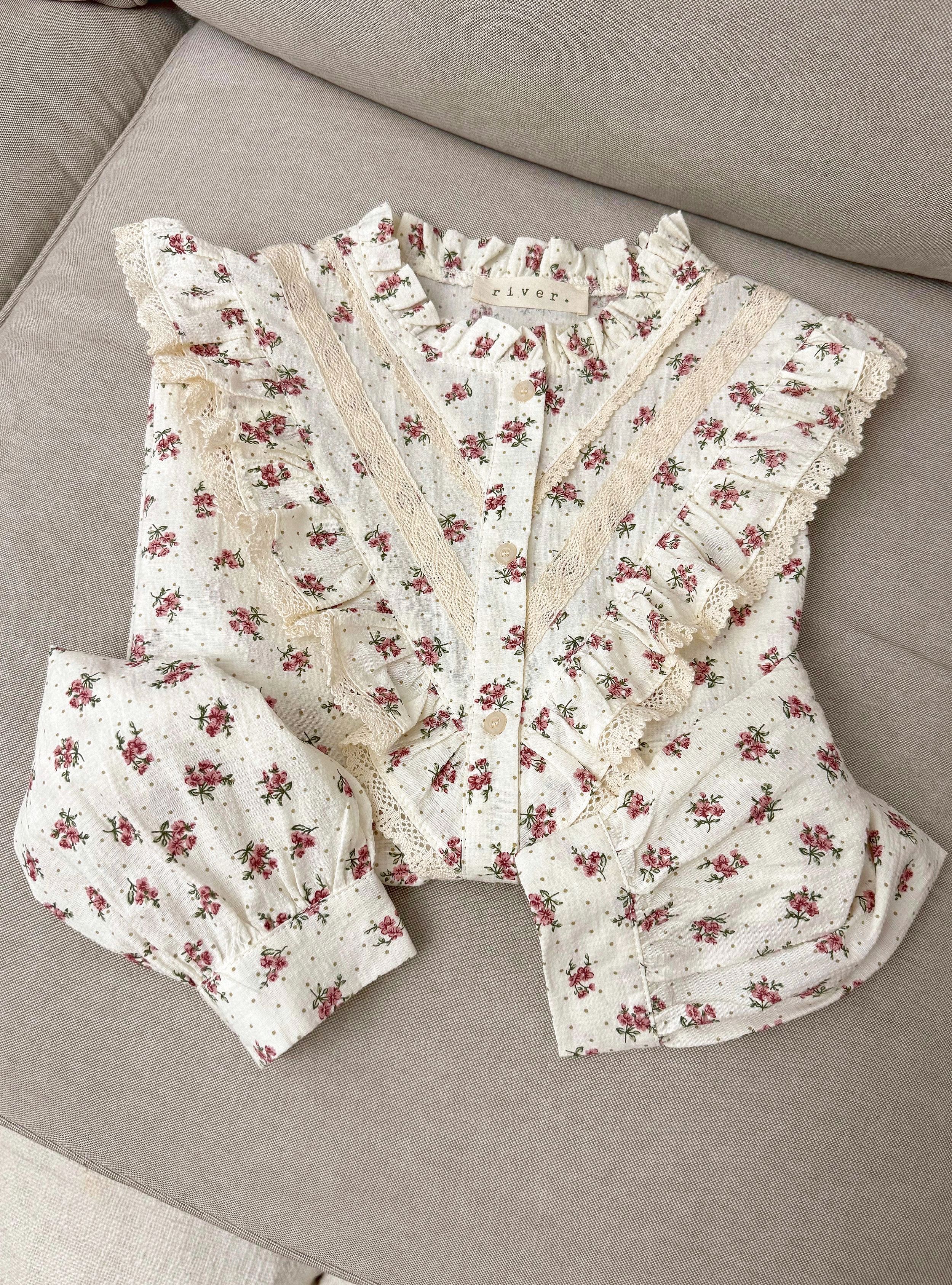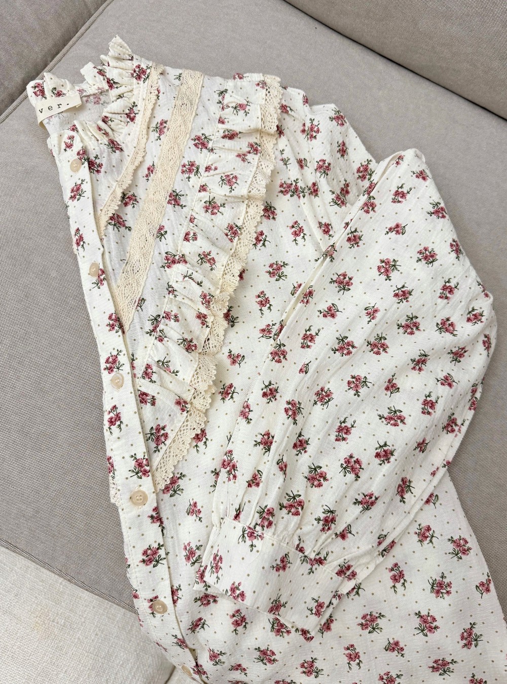 Blusa de manga larga en tejido de algodón con cierre por botones también en los puños. Con detalles románticos como estampados florales en tonos fresa, bordados, cuello fruncido… hacen que sea una blusa espectacular para mezclar con partes de abajo lisas.