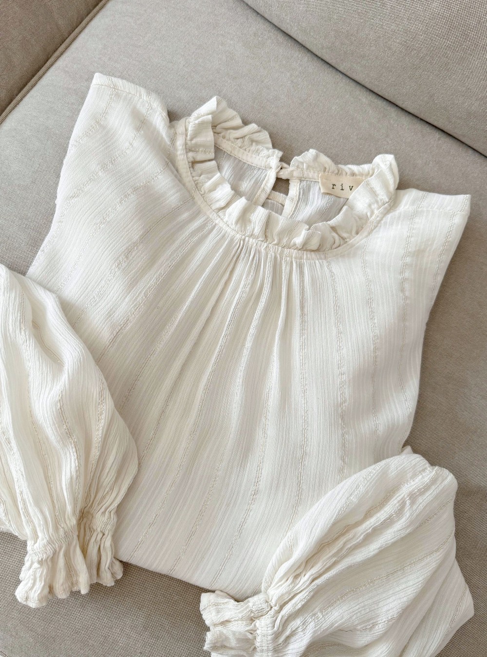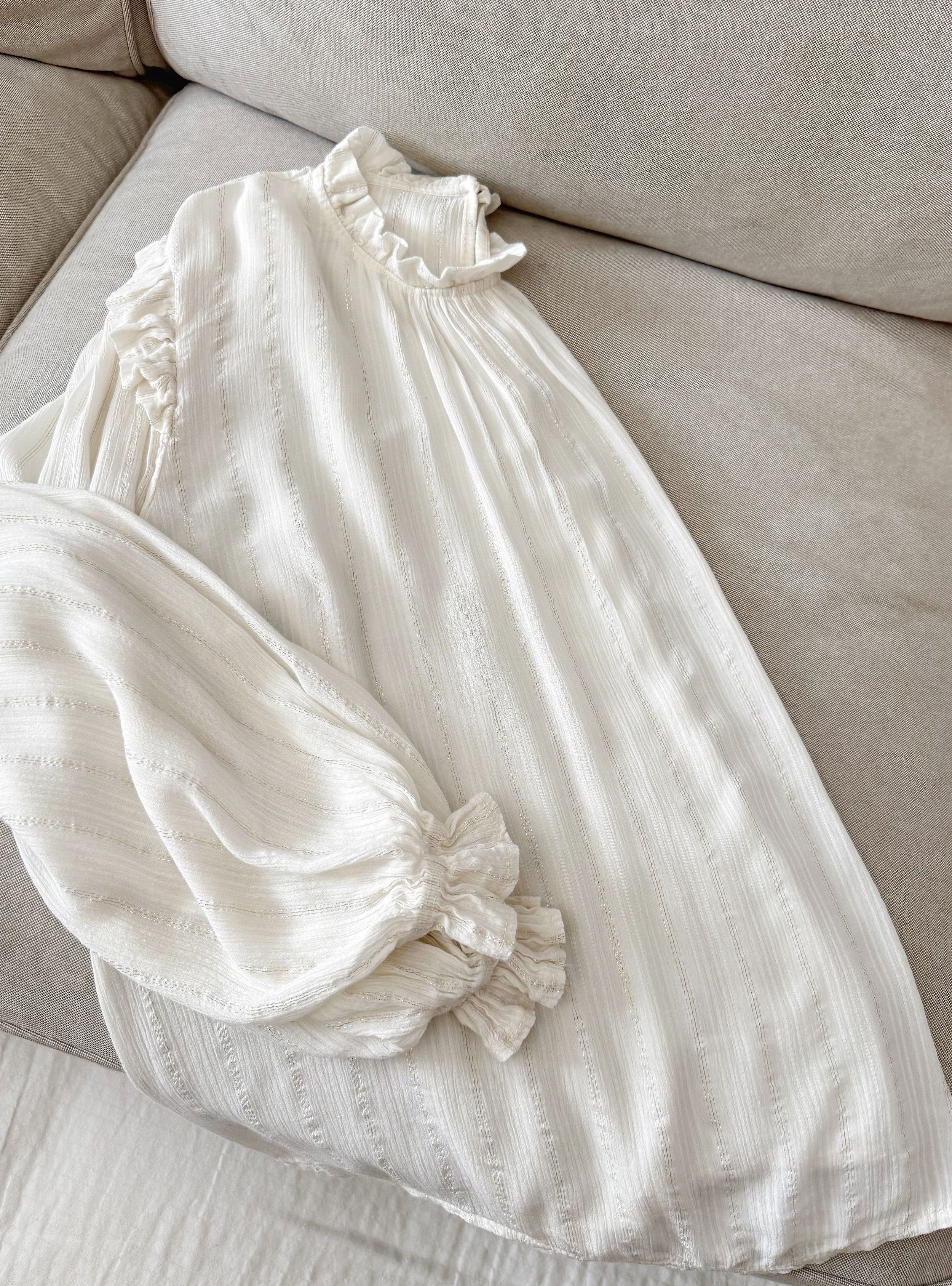 Blusa fluida con rayas sutiles muy finas en luex plata y dorado. Cuello redondo con un pequeño volante. Volantes también en los hombros. Corte holgado. Tejido con  mucho movimiento.