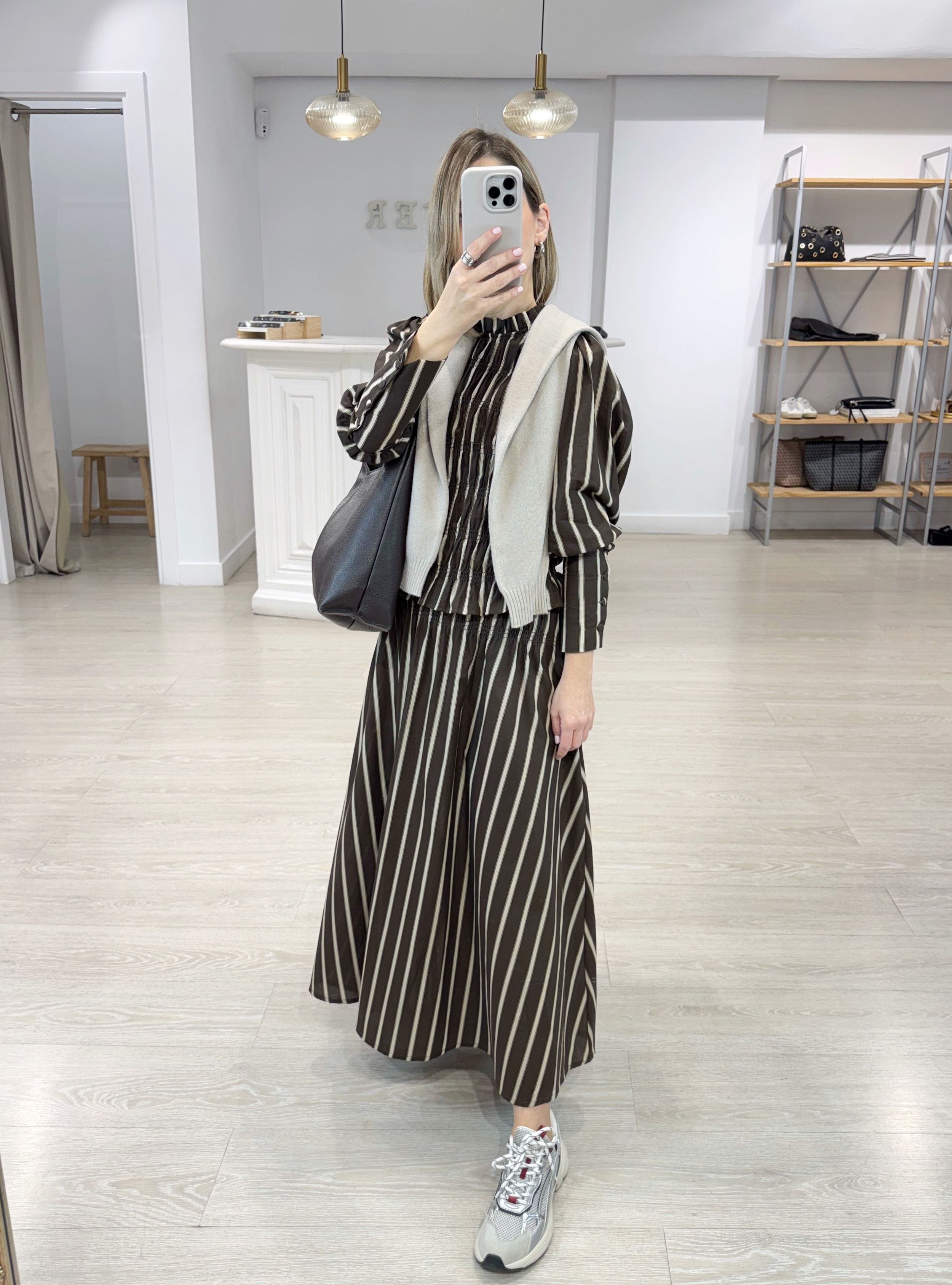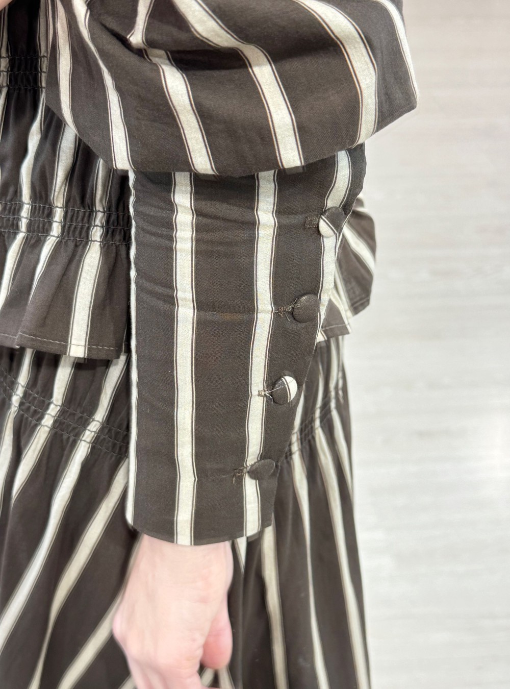 Blusa de rayas con bordado de nido de abeja en tejido de algodón 100%. Cierre por medio de botón en la parte trasera. Mangas abullonadas con botones forrados del mismo tejido. Puedes mezclarla con la falda a juego para un total look súper estiloso.