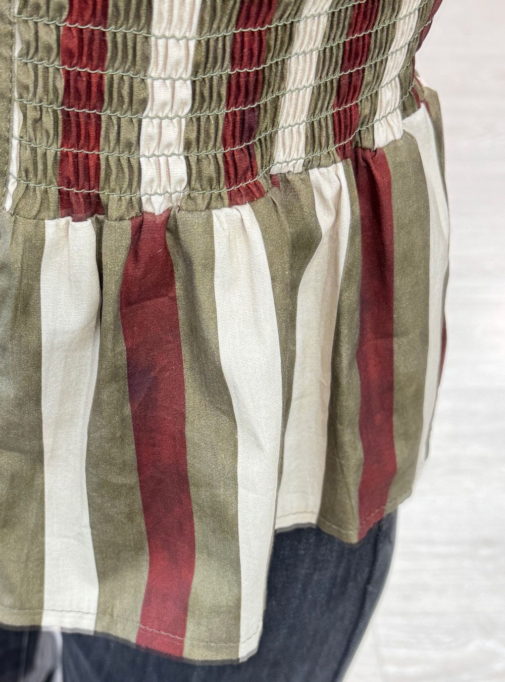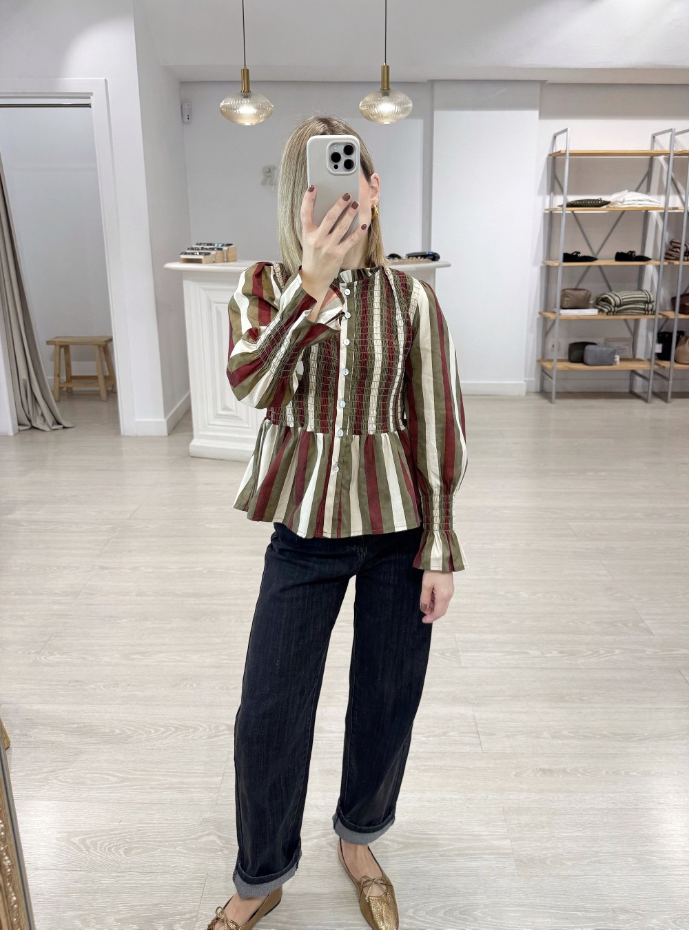 Blusa de rayas en tejido de algodón. Bordado de nido de abeja en la parte de arriba.Volante en la parte baja. Cuello mao. Mangas abullonadas. Puedes mezclarla con un jeans o con la falda a juego para un total look increíble.