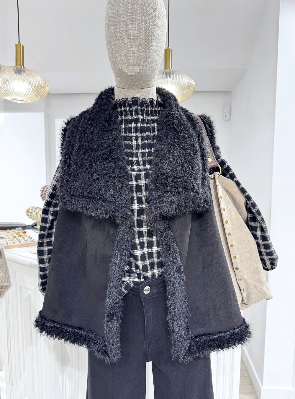Blusa de manga larga en tejido de felpa (algodón) súper calentito con cuello chimenea y elástico en el tercio superior. Te proponemos combinarla con un chaleco de pelo y un jeans straight en negro (en color antracita o gris oscuro es otra posibilidad) para un look calentito y estiloso a la vez.