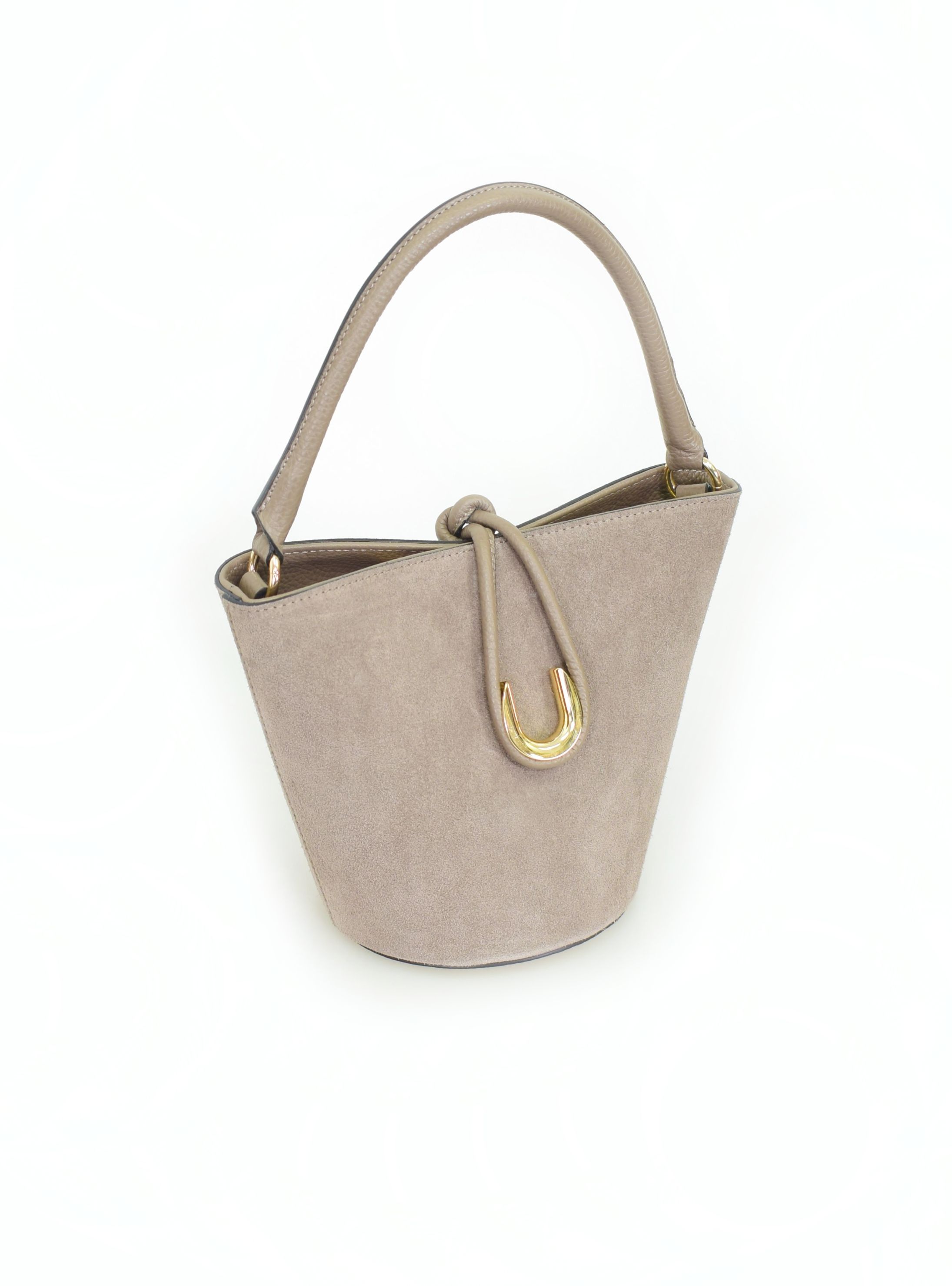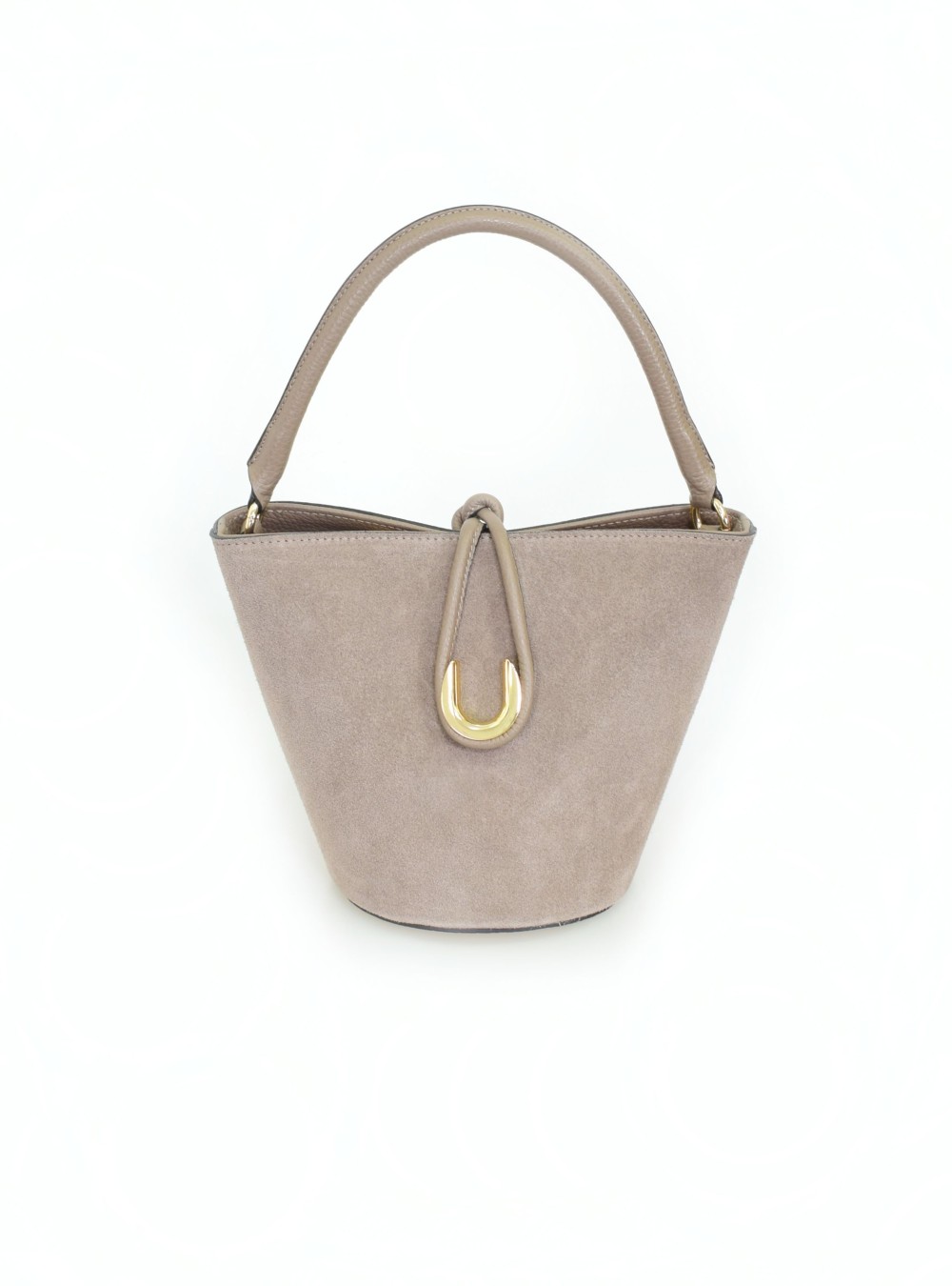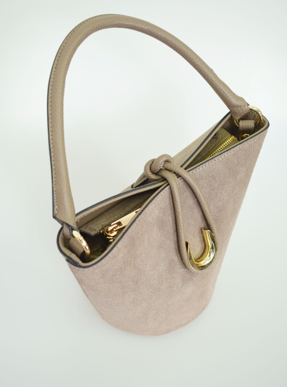 Bolso de ante con forma de bombonera. Puedes llevarlo de mano o a modo bandolera por medio de una correa regulable del mismo material. Cierre por medio de tira y cremallera. Tiene bolsillo interior.