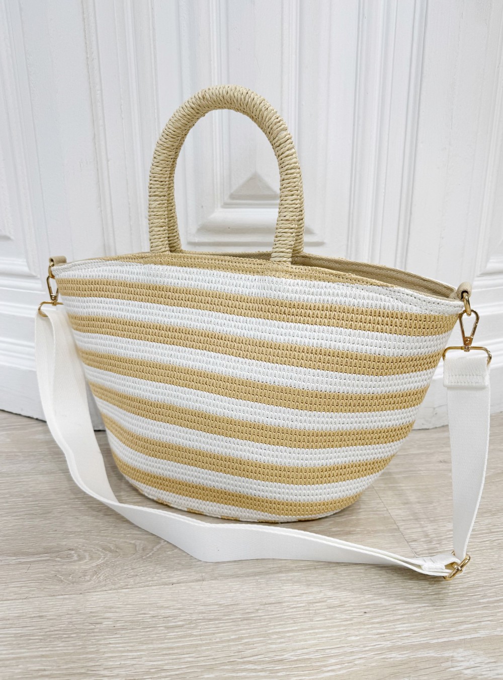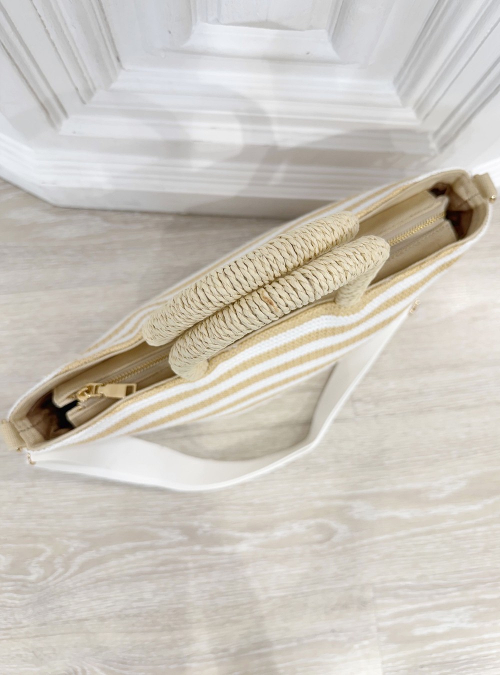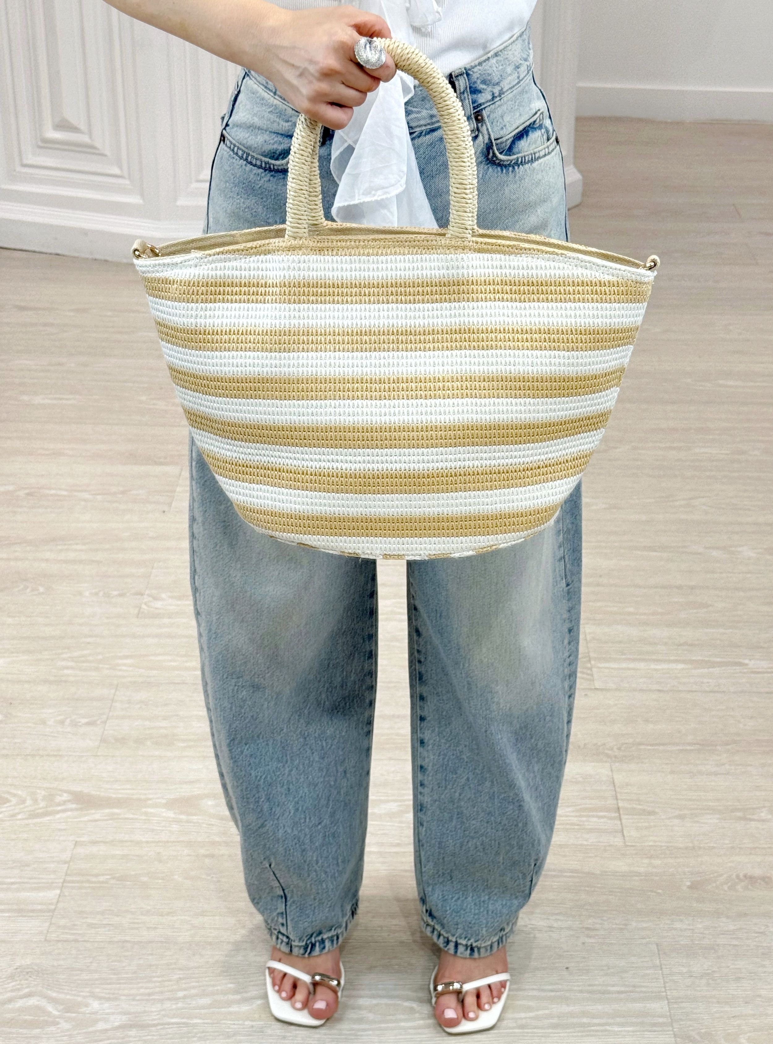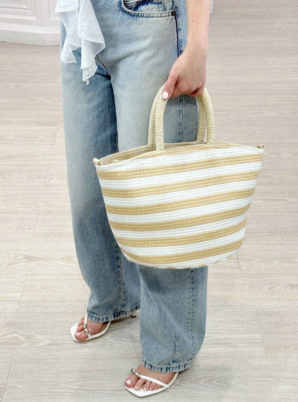 Bolso capazo de tamaño medio de gran calidad de rayas. Cierre por medio de cremallera. Tiene una correa regulable ancha en color blanco. Dos bolsillos en el interior.