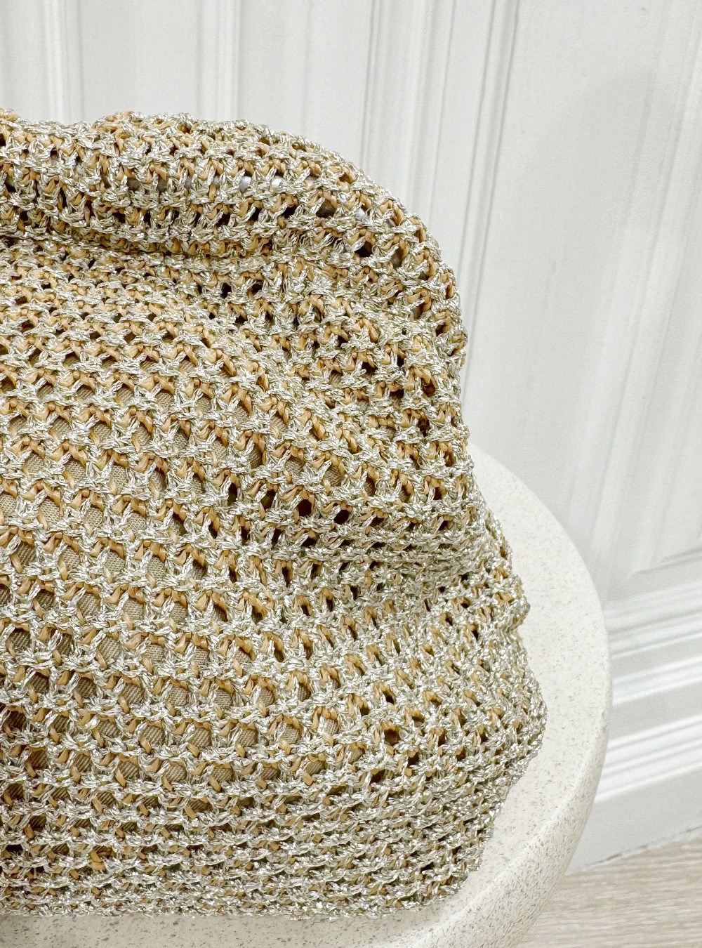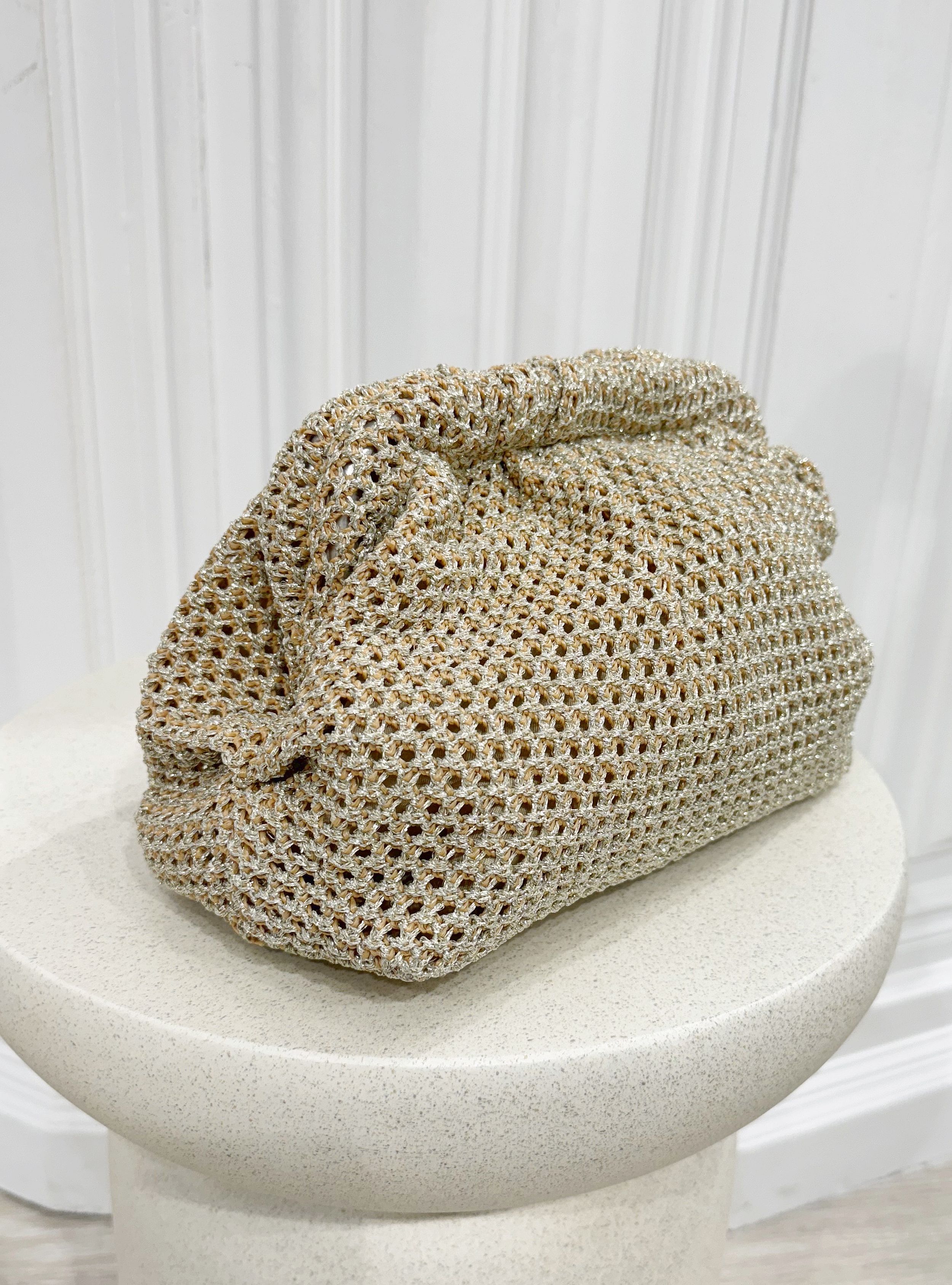 Bolso tipo monedero en tejido de red. Tiene una cadena dorada para llevarlo a modo bandolera.