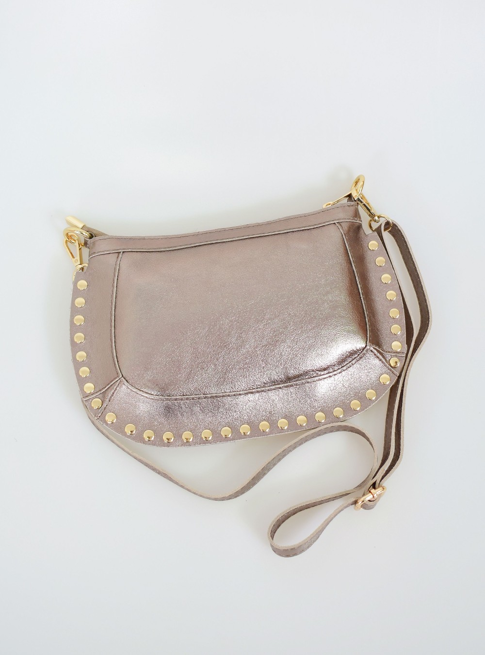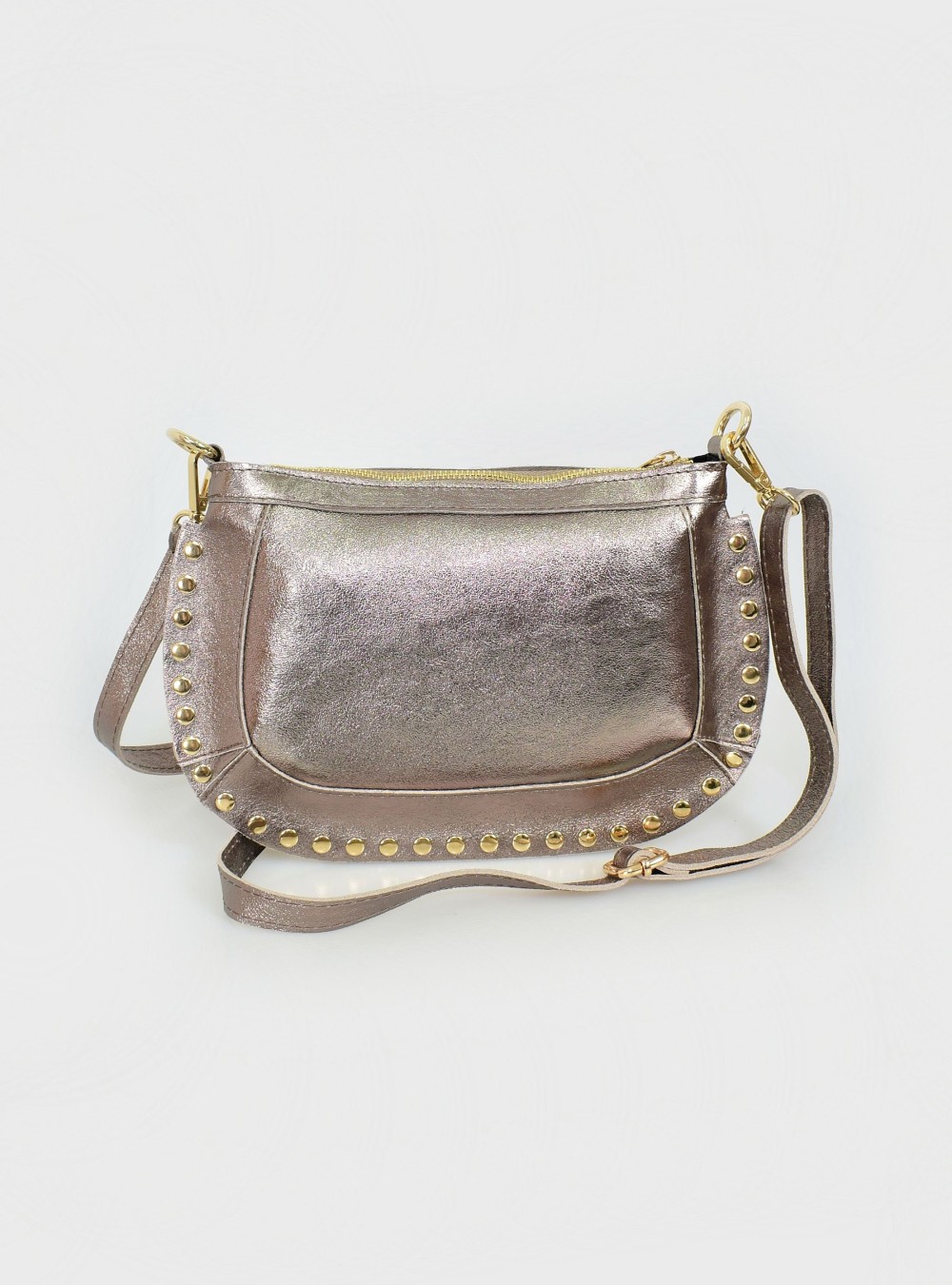 Bolso de piel con acabado metalizado y decorado con tachuelas doradas en el borde. Tiene correa regulable para llevar a modo bandolera. Cierre por cremallera. Interior forrado en tela y bolsillo con cierre por cremallera.