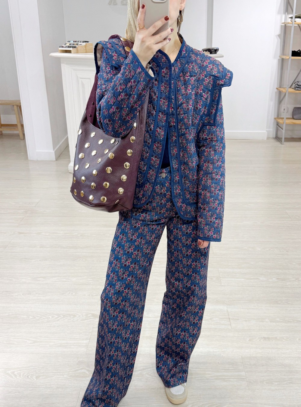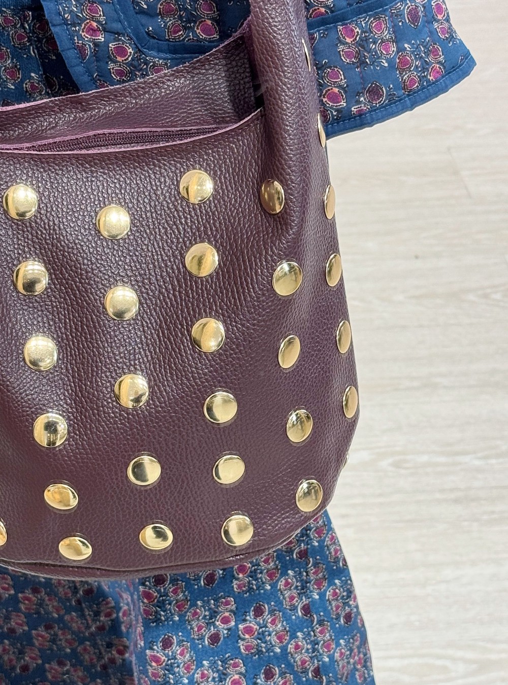 Bolso de piel de gran calidad con tachas doradas en la parte de delante. Cierre por medio de cremallera.