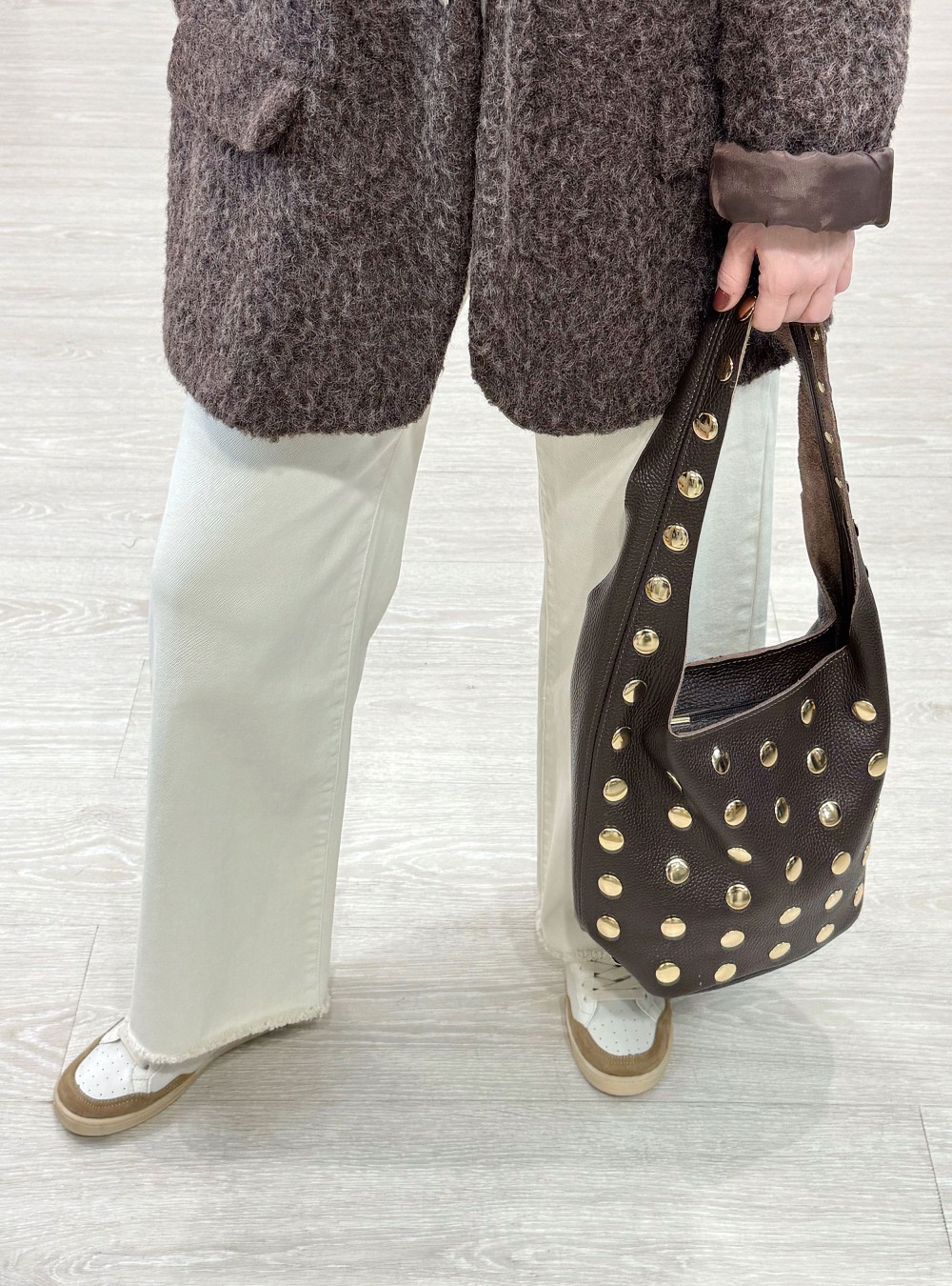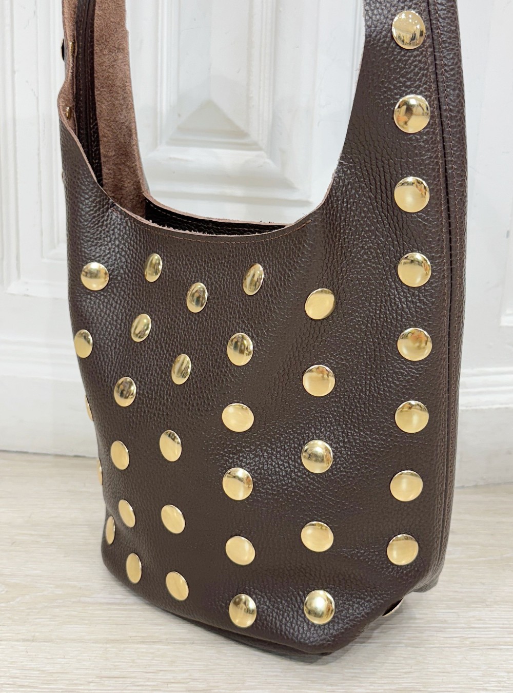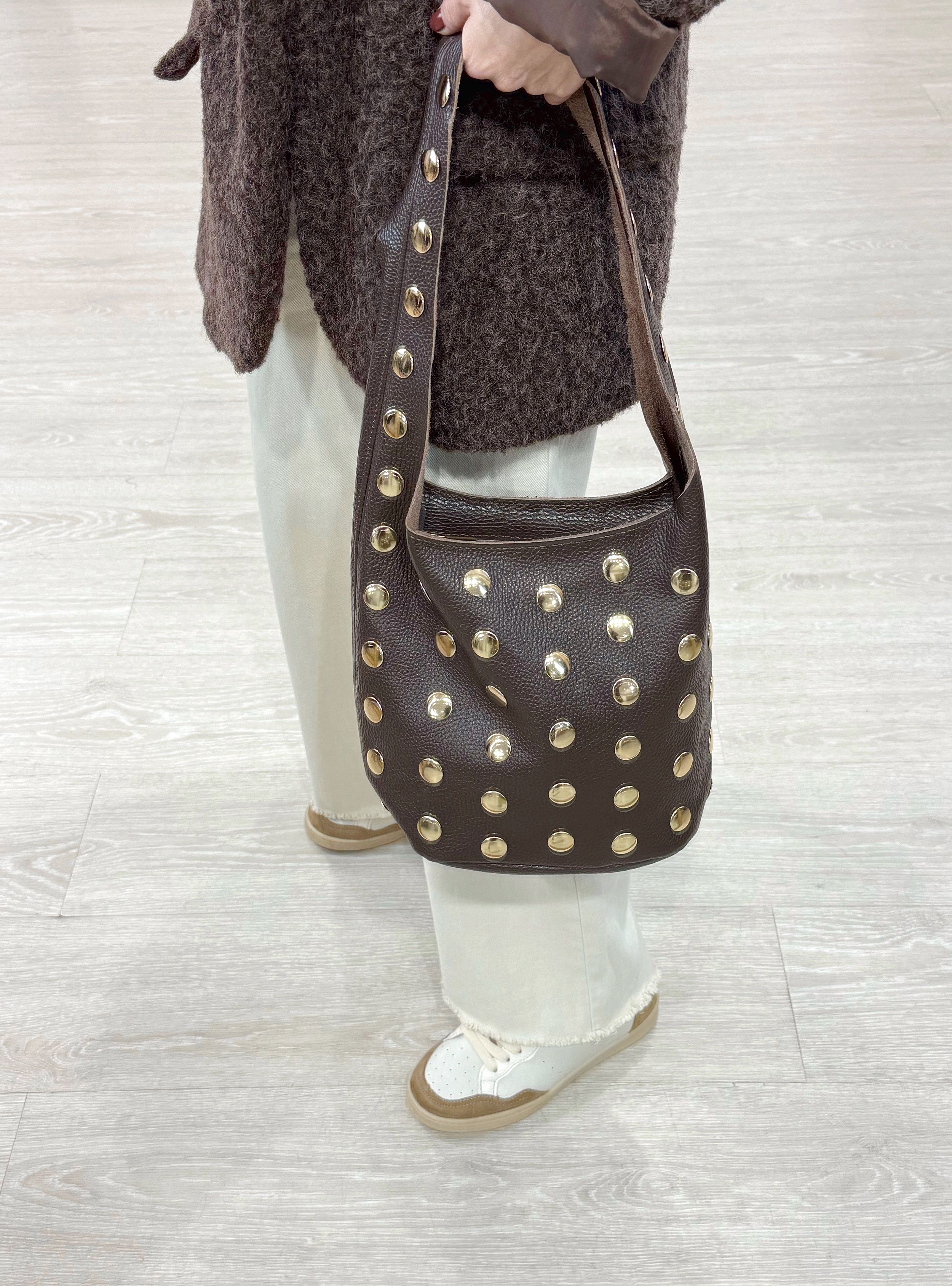 Bolso de piel de gran calidad con tachas doradas en la parte de delante. Cierre por medio de cremallera.