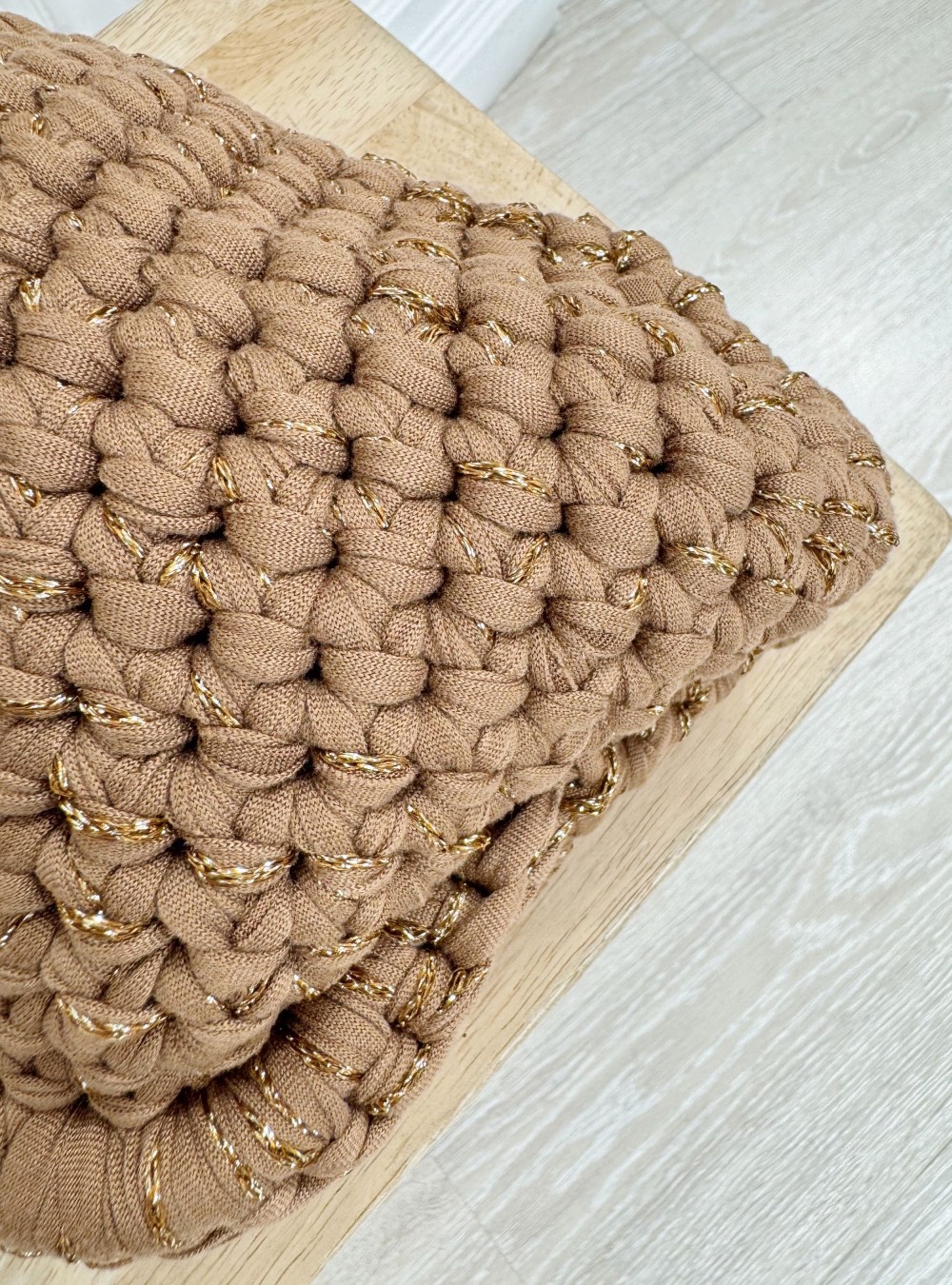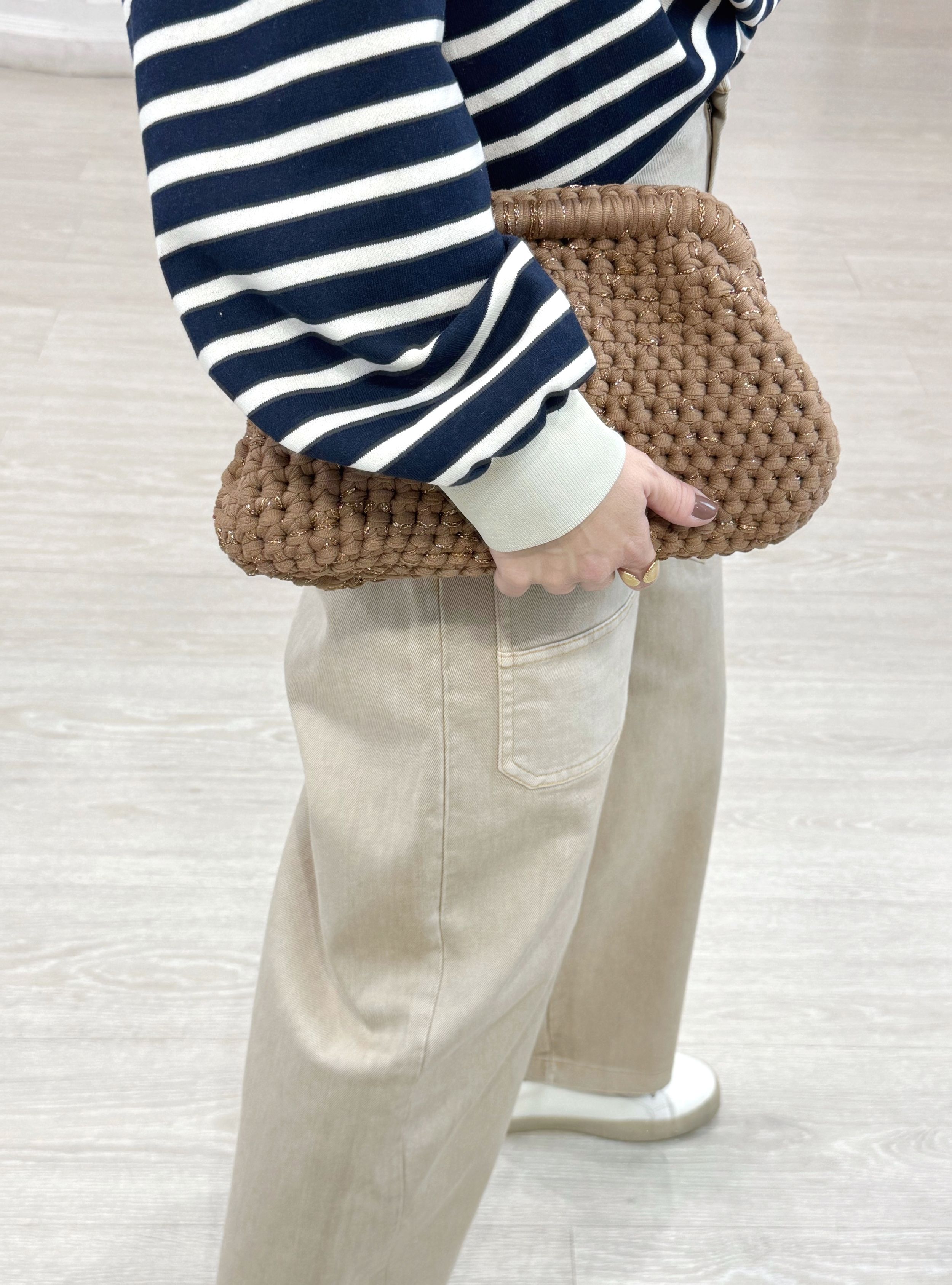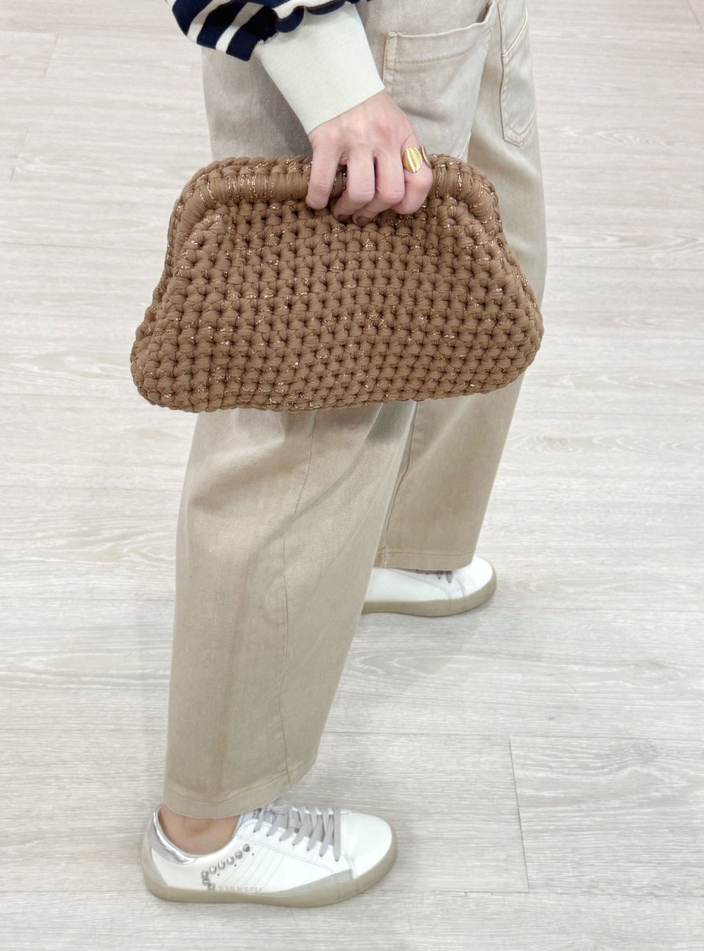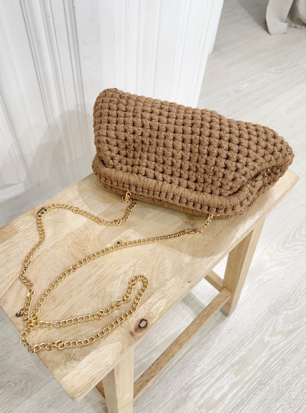 Bolso tipo monedero en tejido trenzado con detalles de lurex. Tiene una cadena dorada para llevarlo a modo bandolera.
