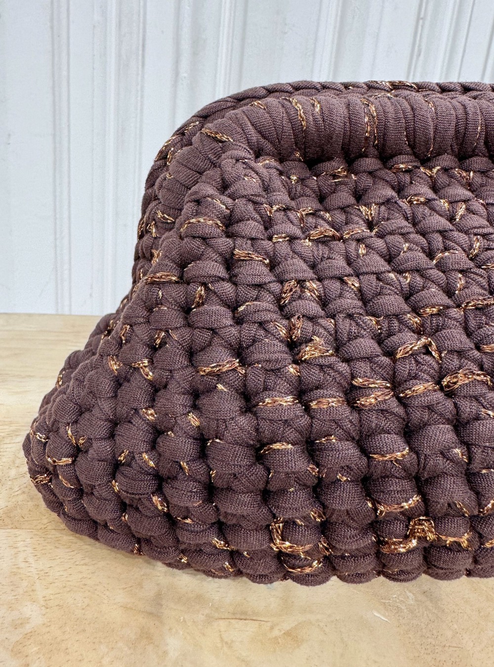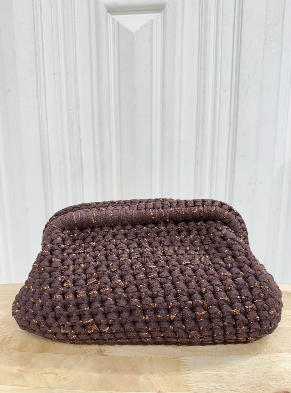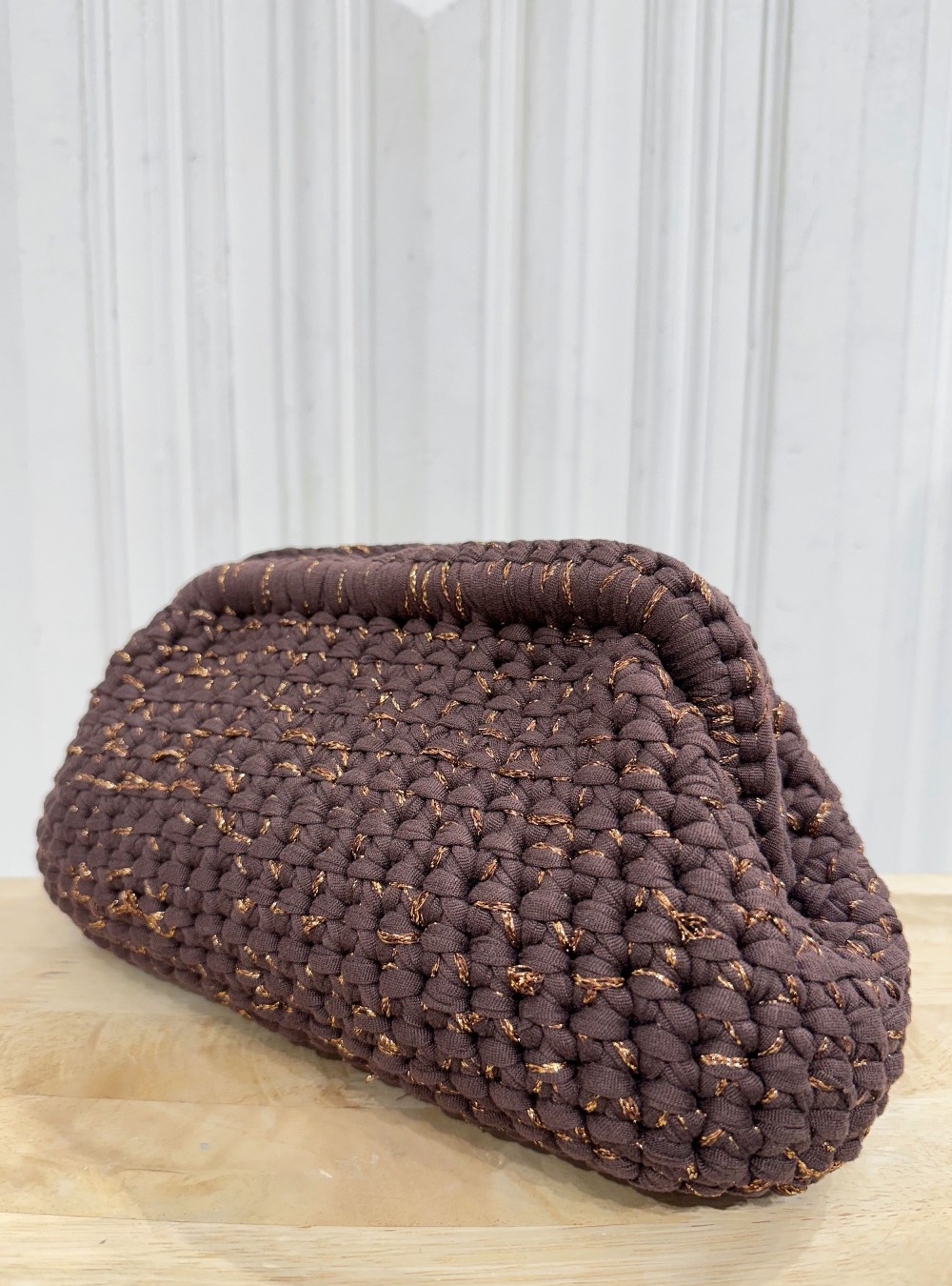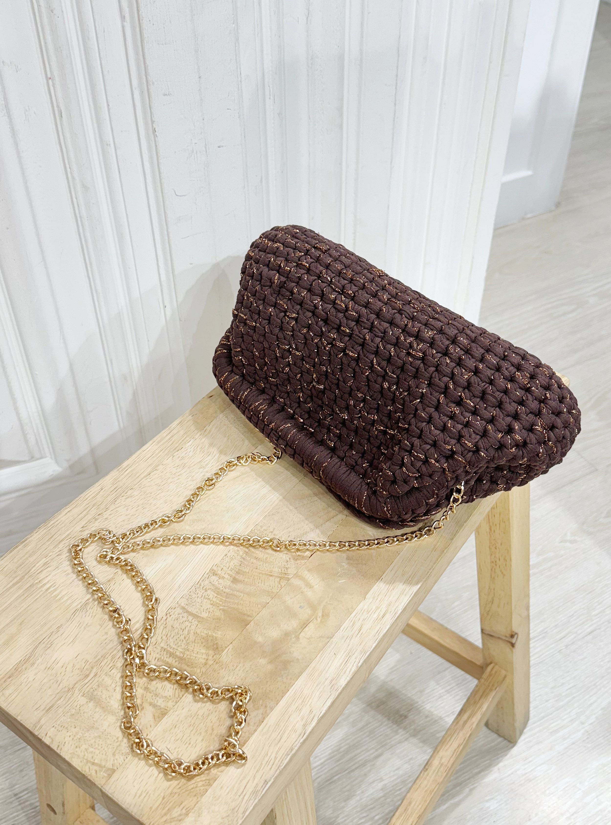 Bolso tipo monedero en tejido trenzado con detalles de lurex. Tiene una cadena dorada para llevarlo a modo bandolera.