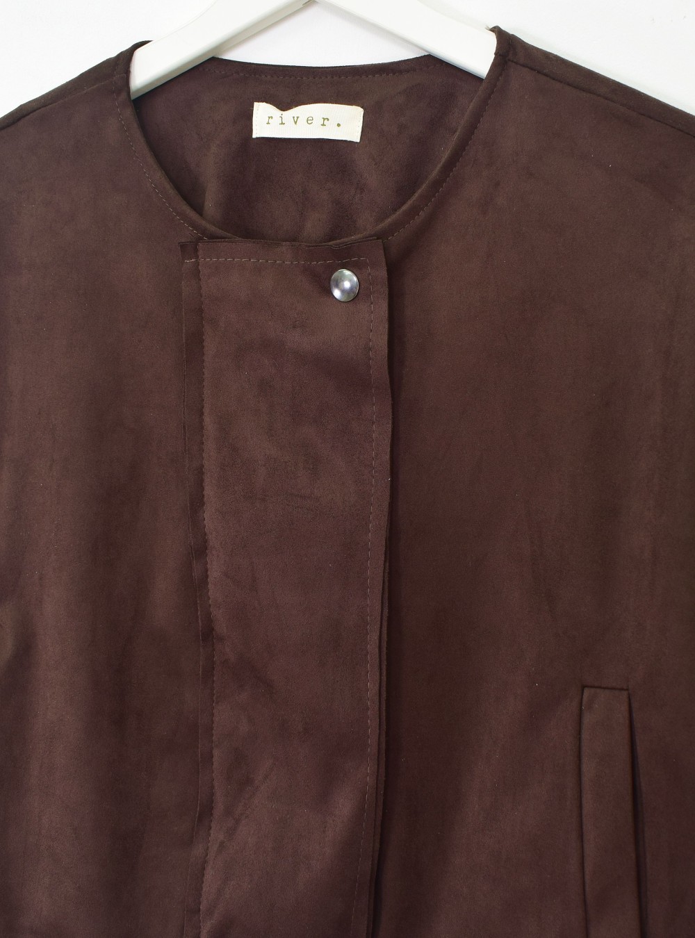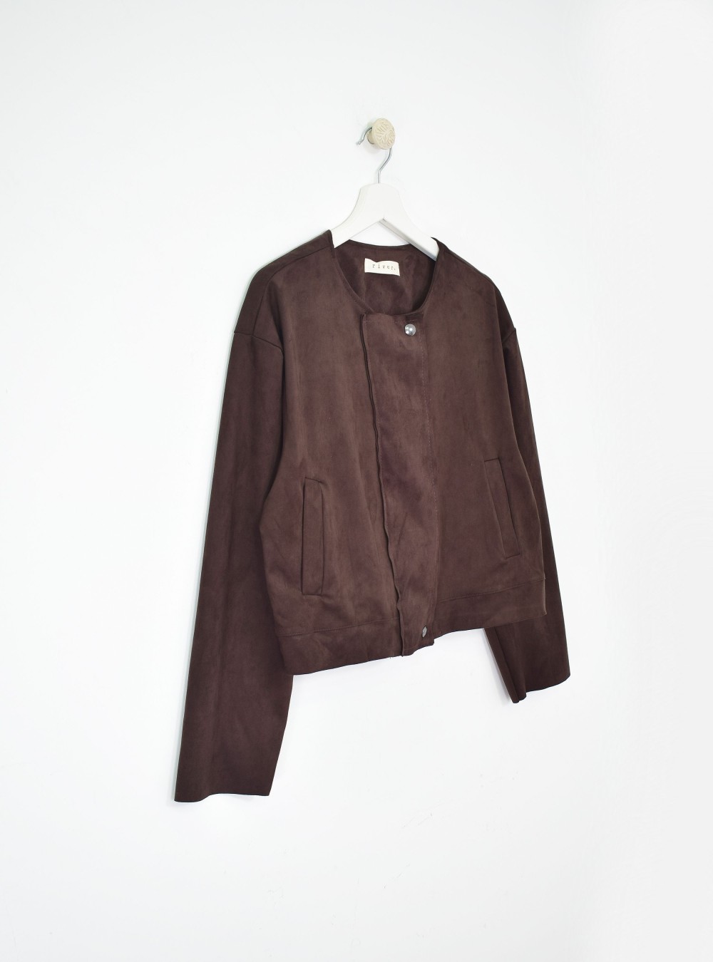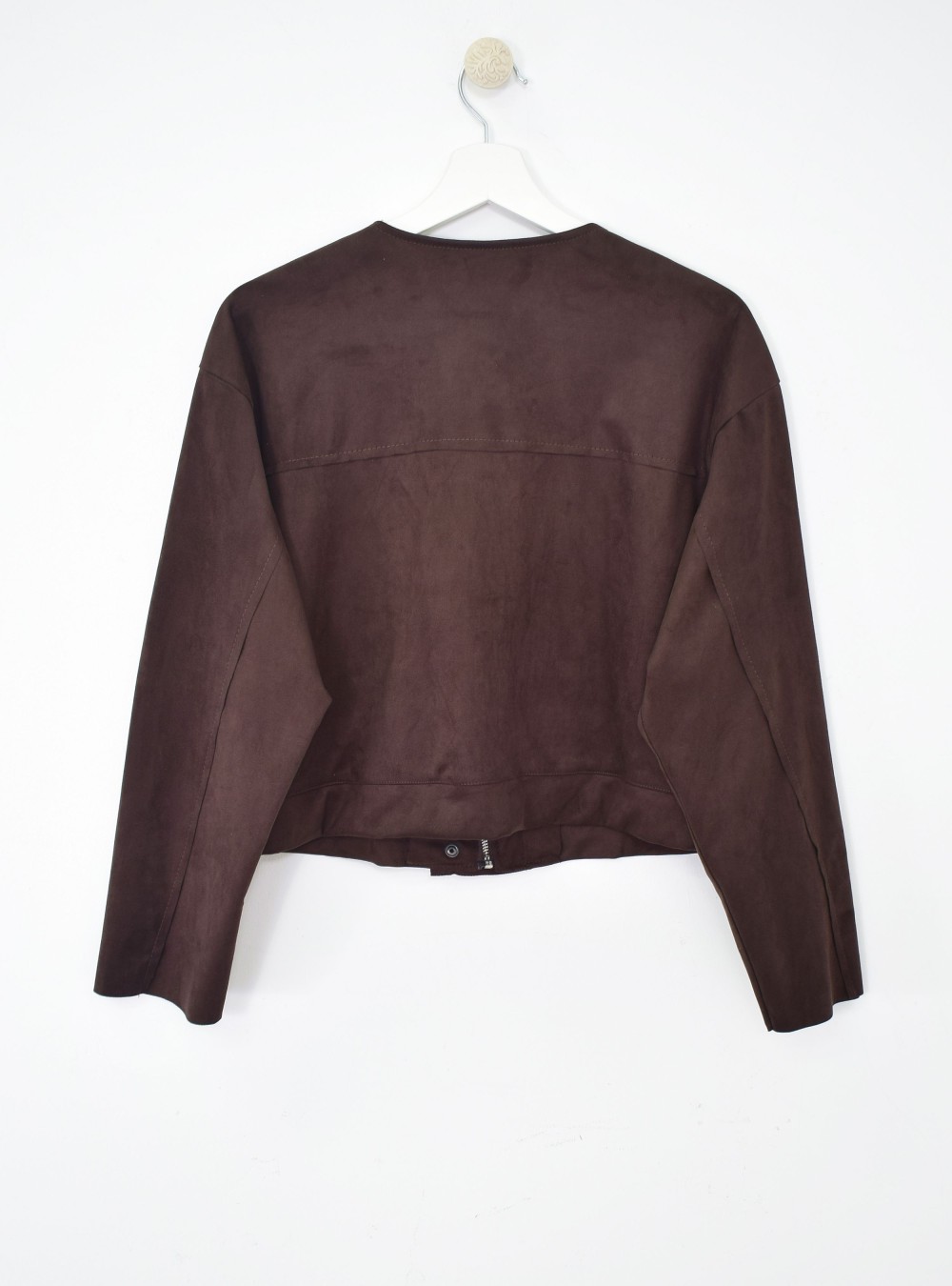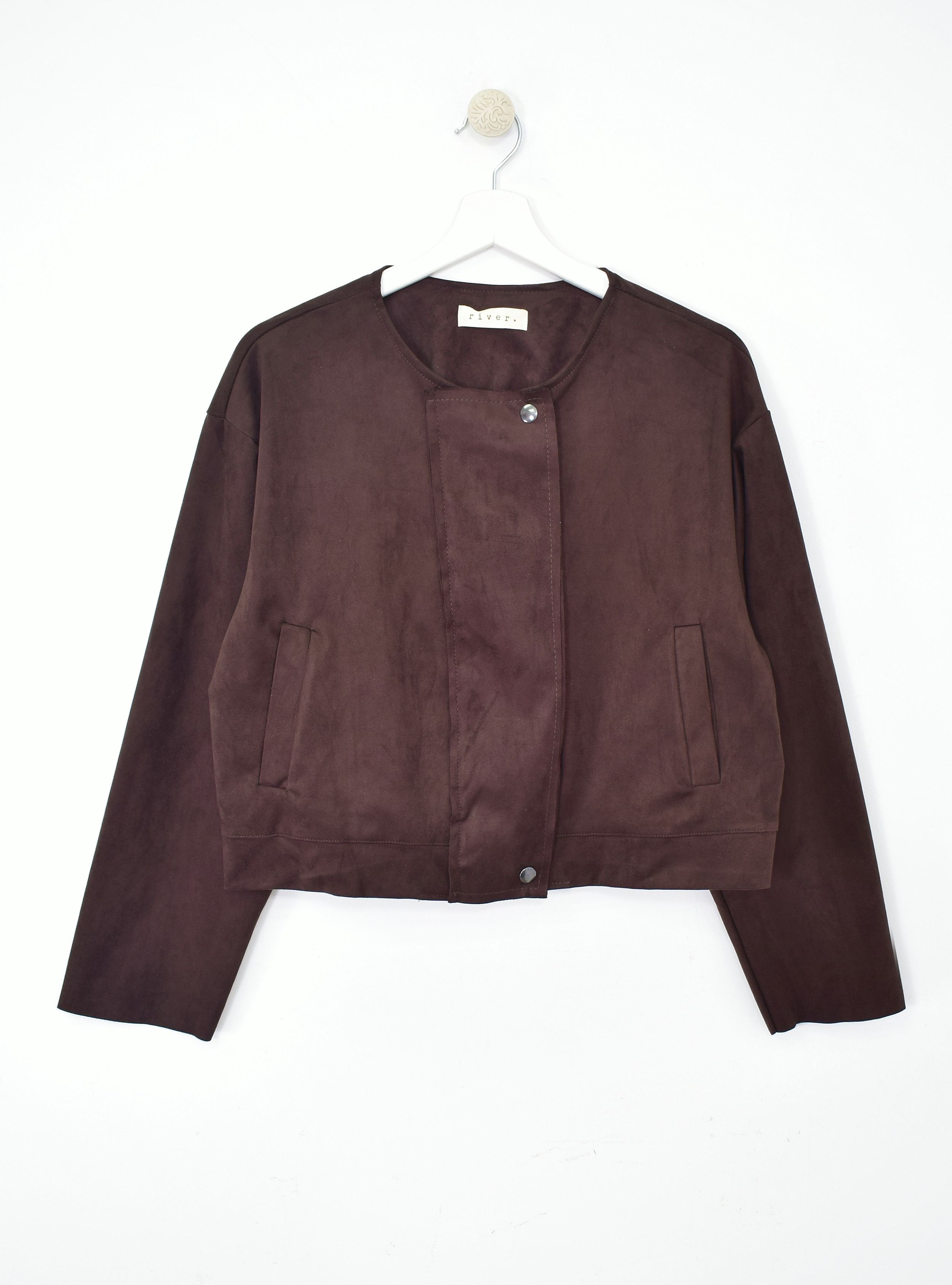 Bomber corta efecto ante. Cuello redondo. Dos bolsillos. Cierre por medio de botón y cremallera. Tejido muy suave al tacto.