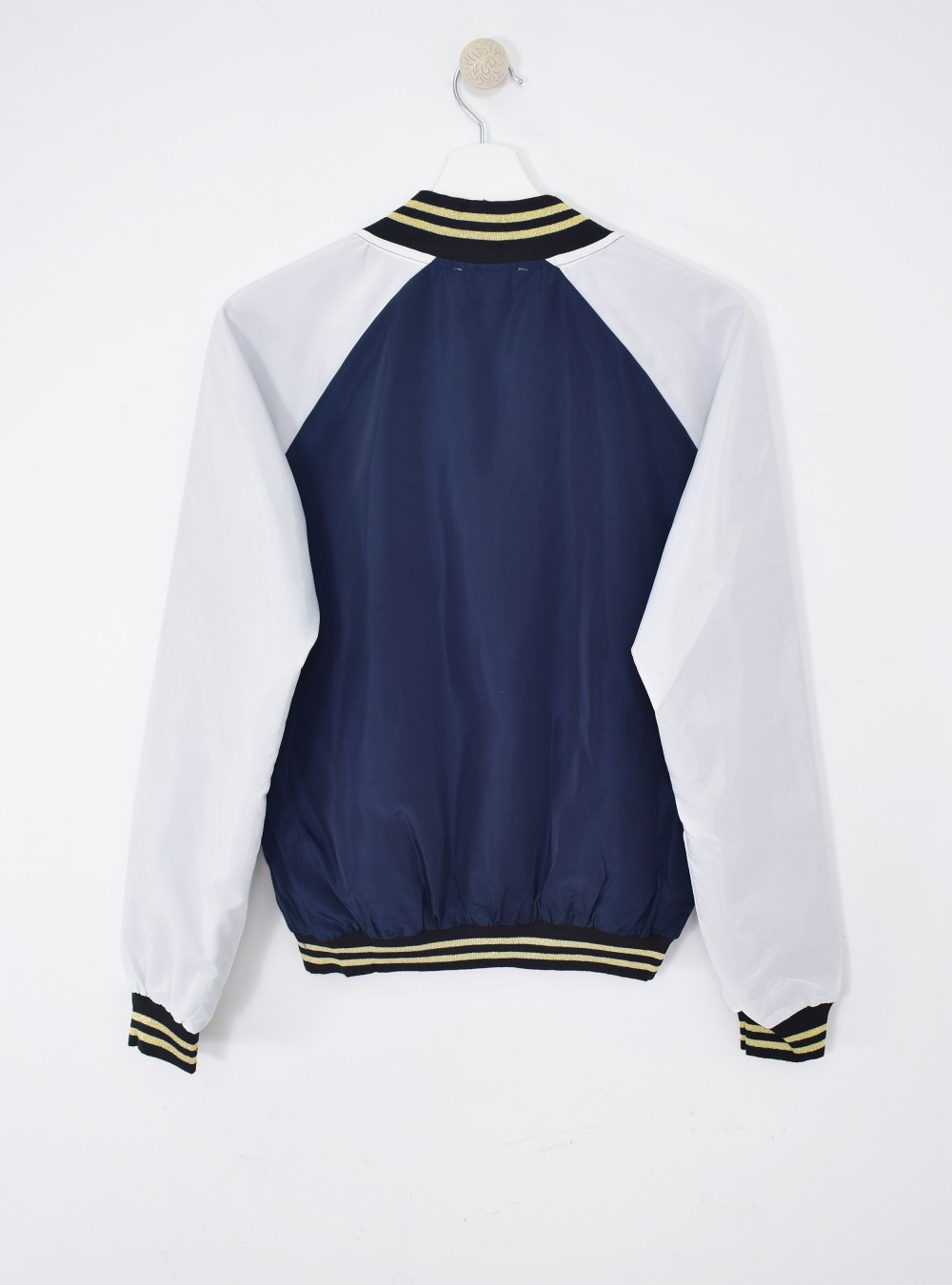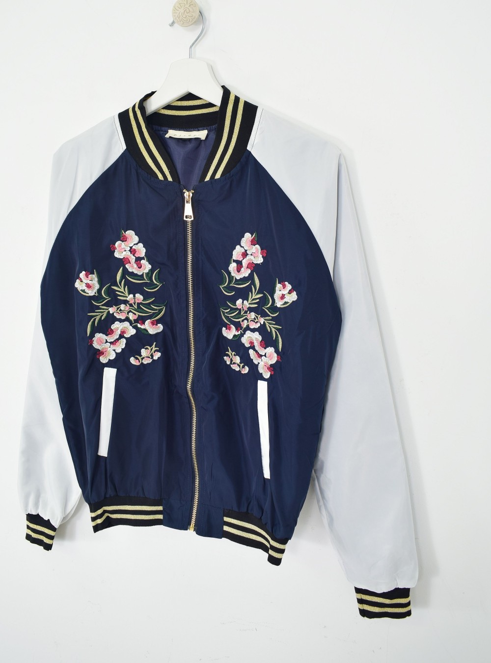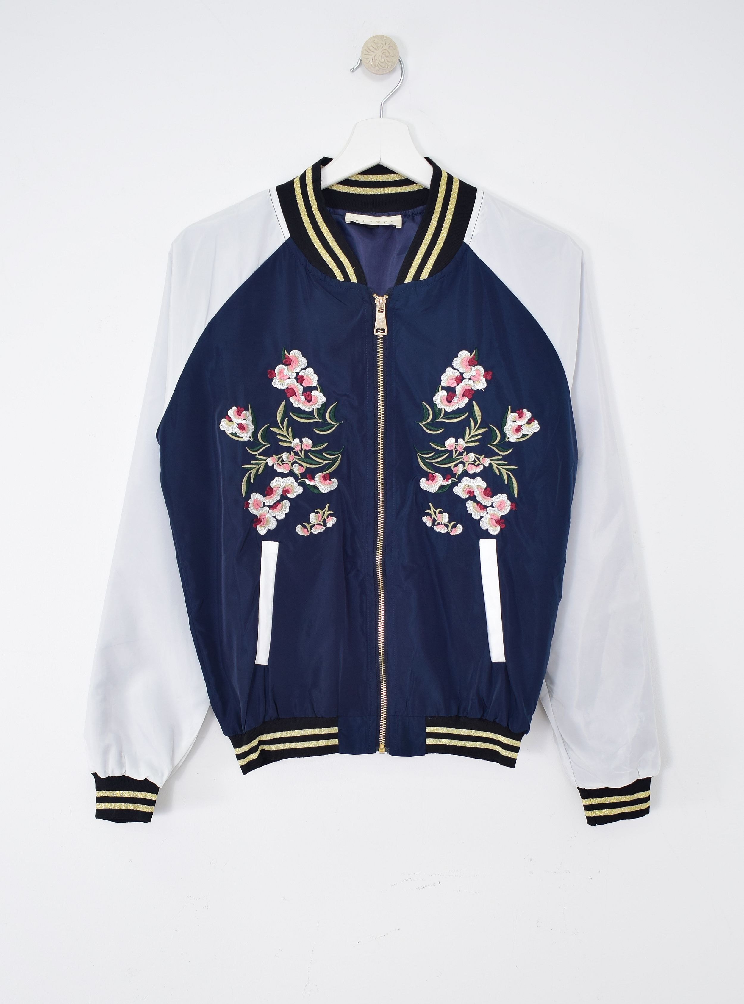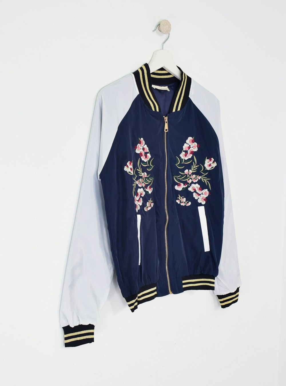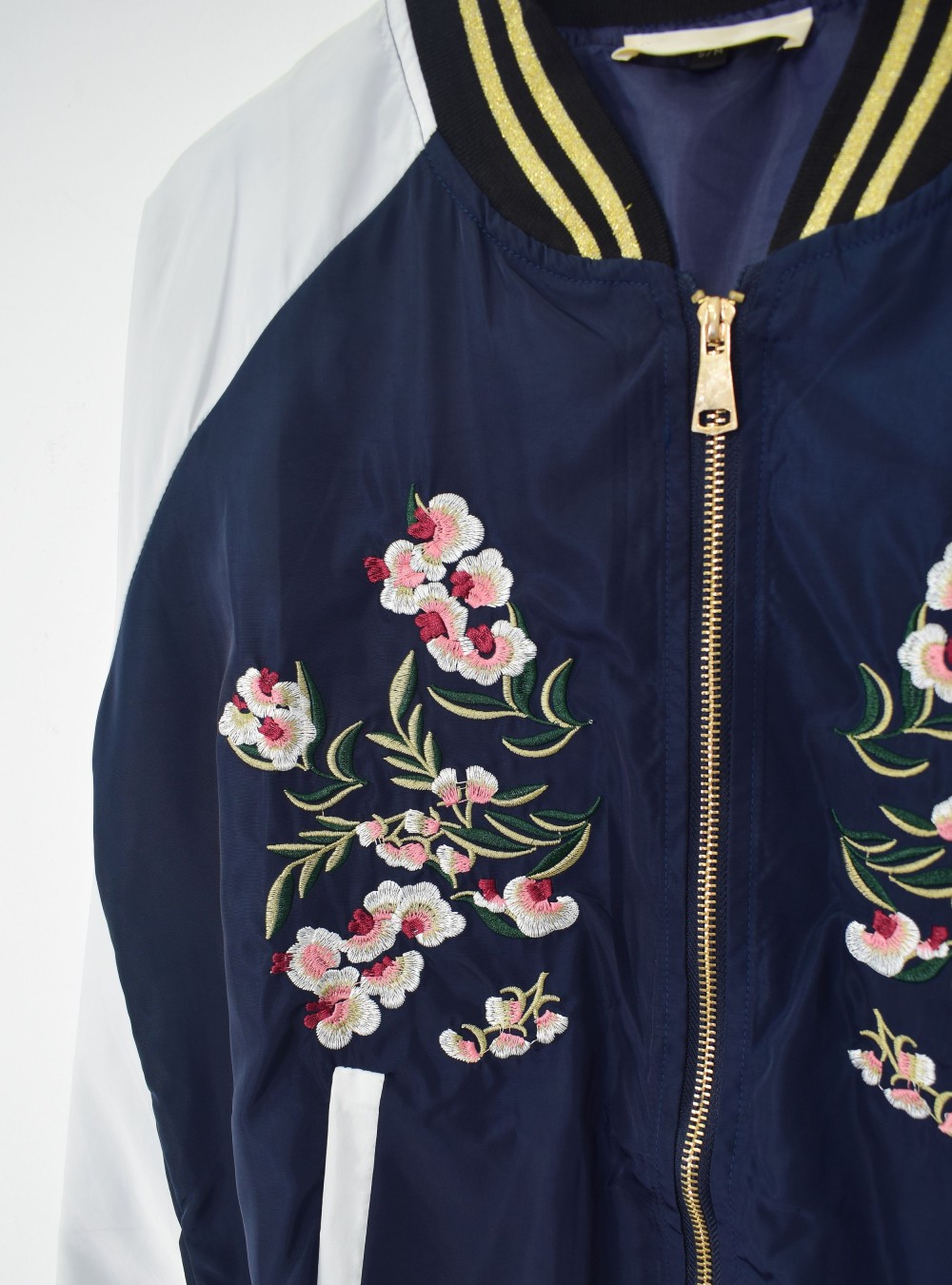 Chaqueta tipo bomber con cierre por cremallera y bordado florar tipo japonés en la zona del pecho. Bolsillos internos en la parte baja y contraste de colores en la tela de la prenda. Tiene bandas de punto elástico en cuello, puños y parte baja. Mézclala en looks lisos donde quieras dar un toque de alegría a tu día.