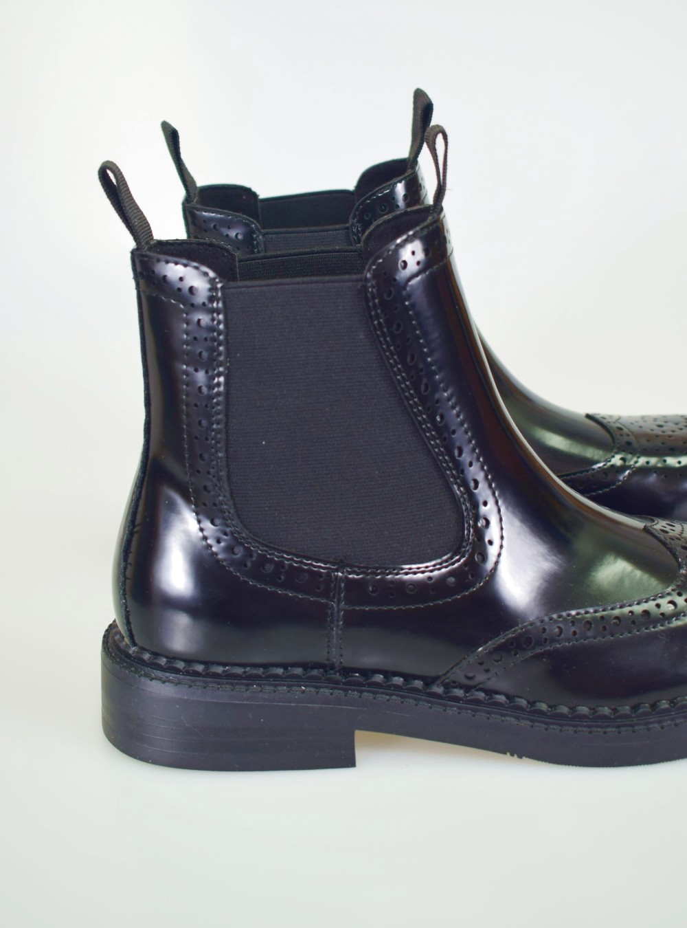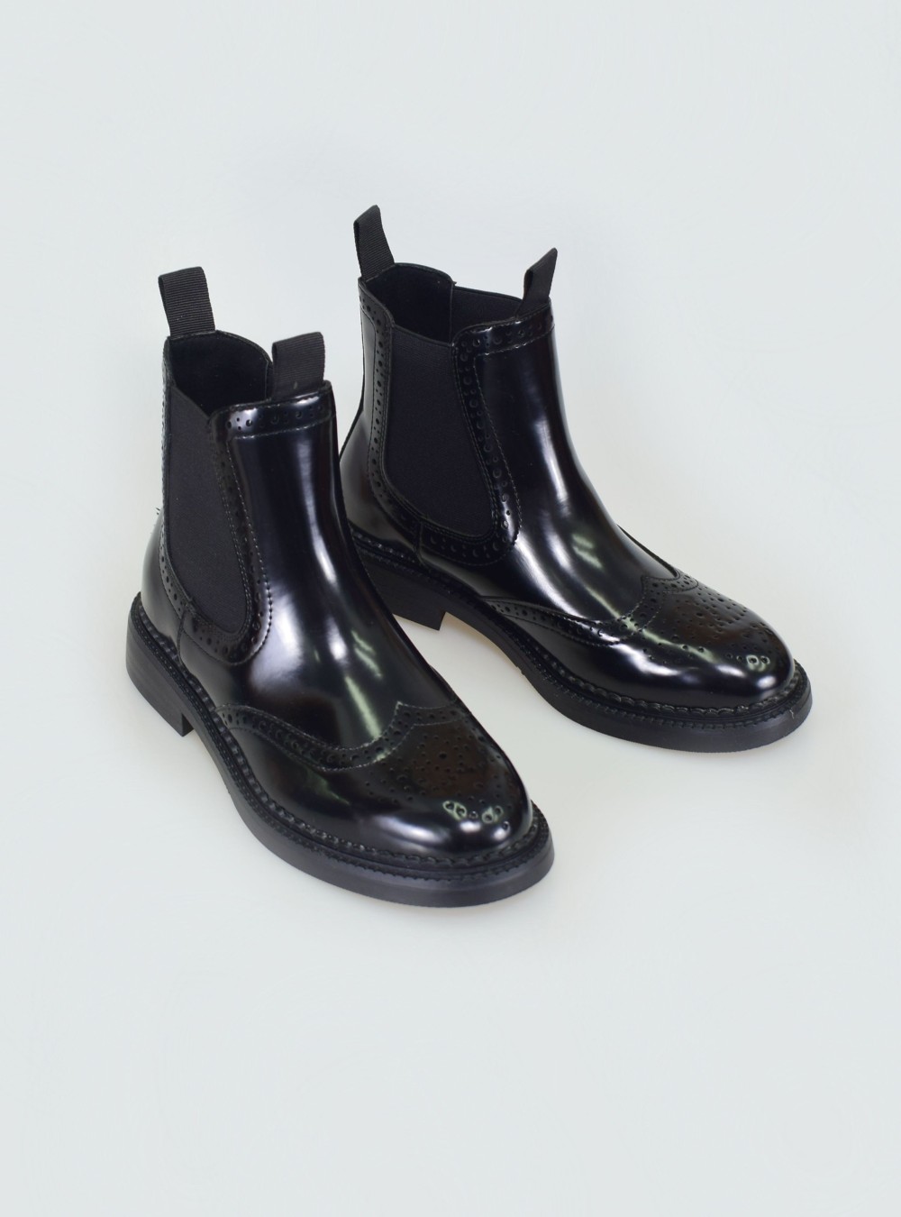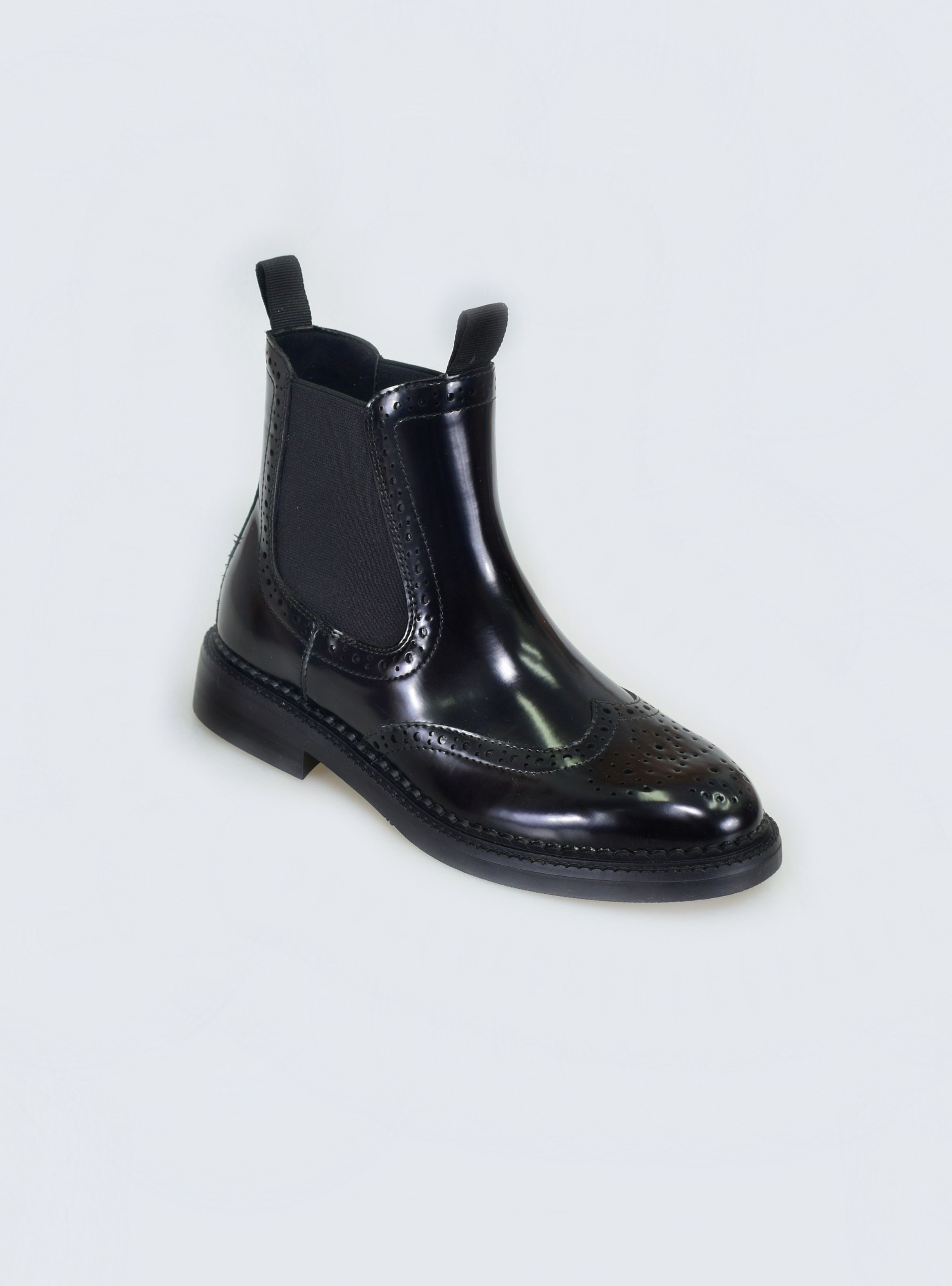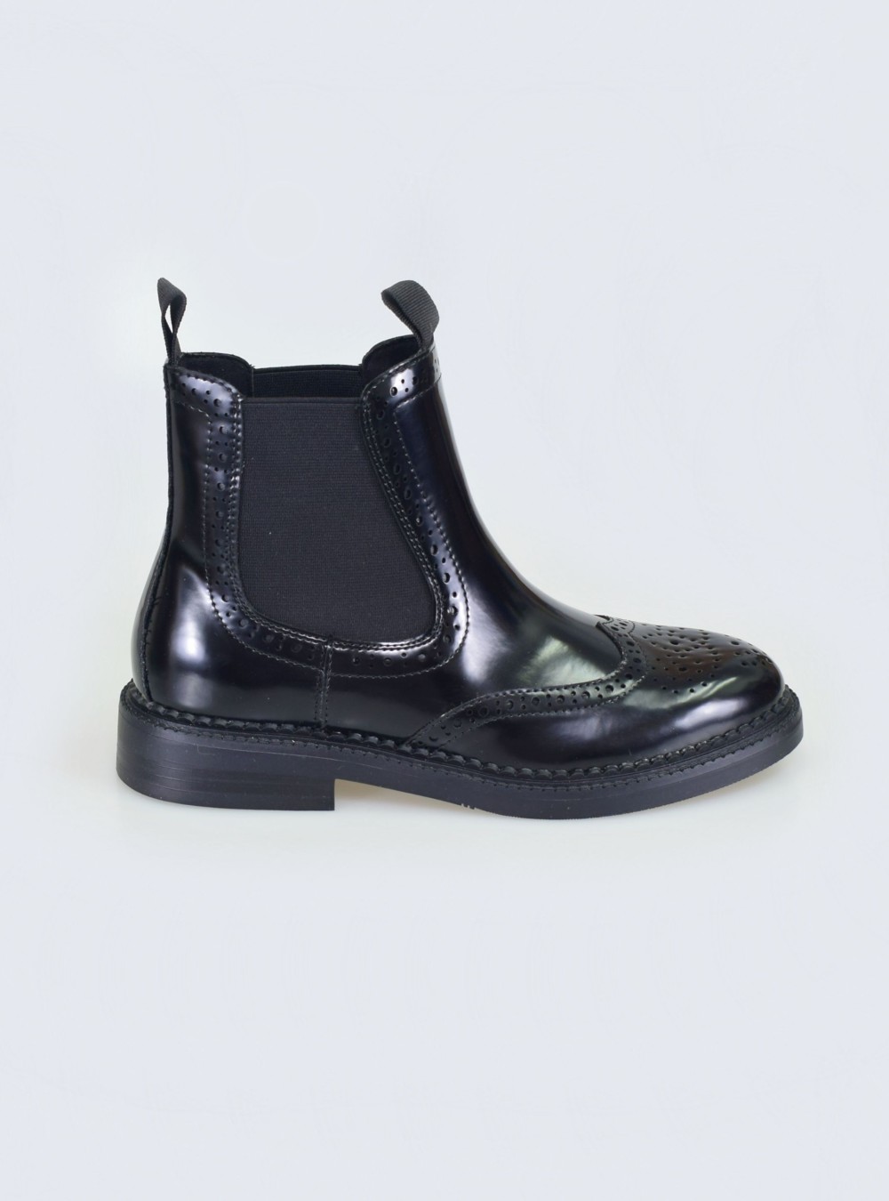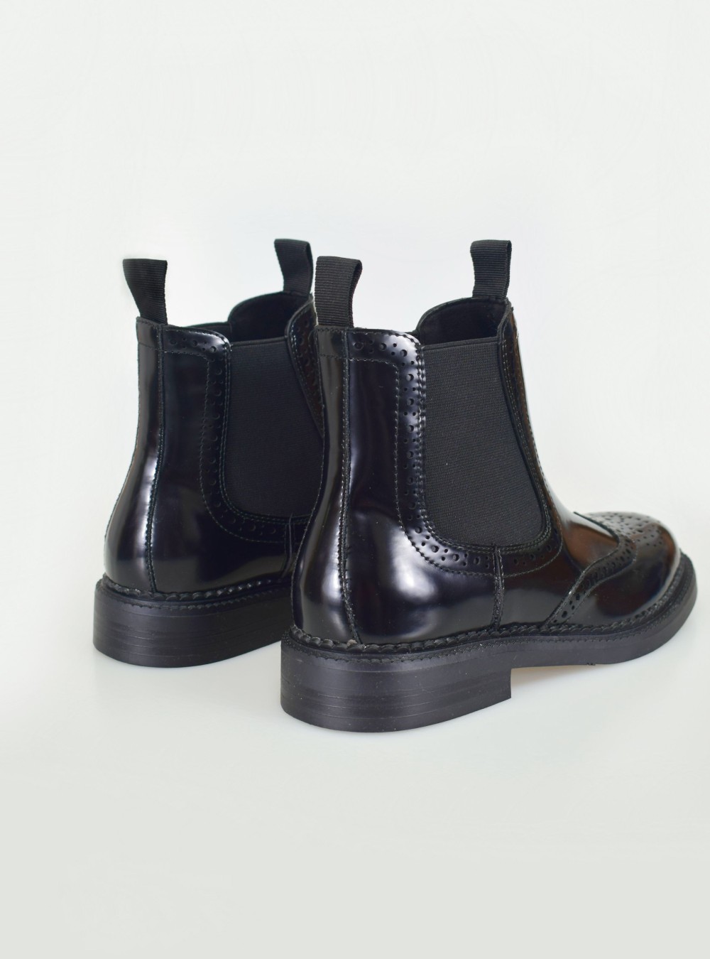 Bota Chelsea de charol con detalles troquelados. Elástico en el tobillo. Es muy cómoda y estilosa, elevará tus looks del día a día.