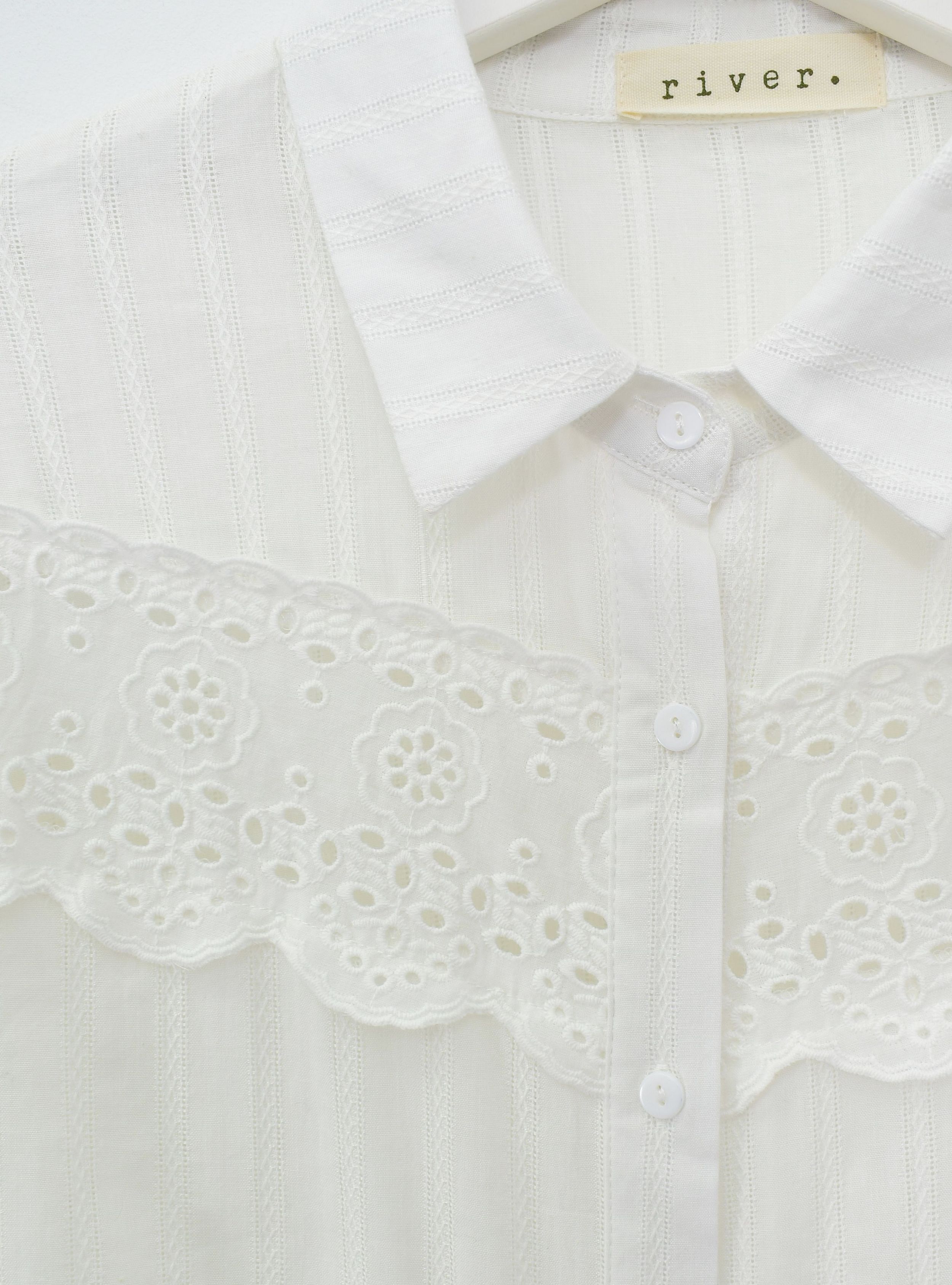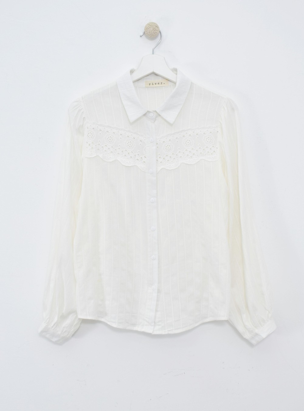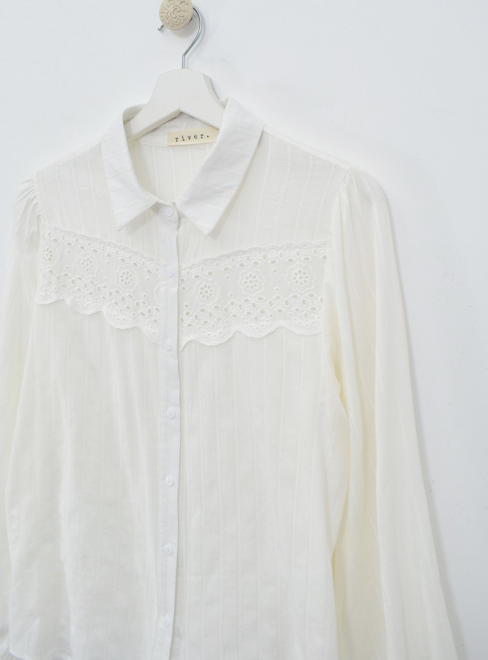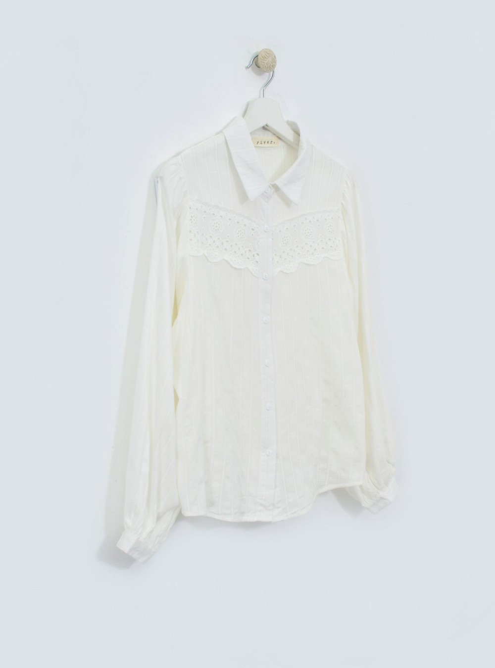 Camisa de manga larga en tejido de algodón. Cuello camisero y botones en los puños. Tiene el tejido decorado con bandas bordadas y troqueladas en el mismo color que le dan un toque estilo a esta prenda. Perfecta para crear looks diferentes con tus jeans y faldas lisas.