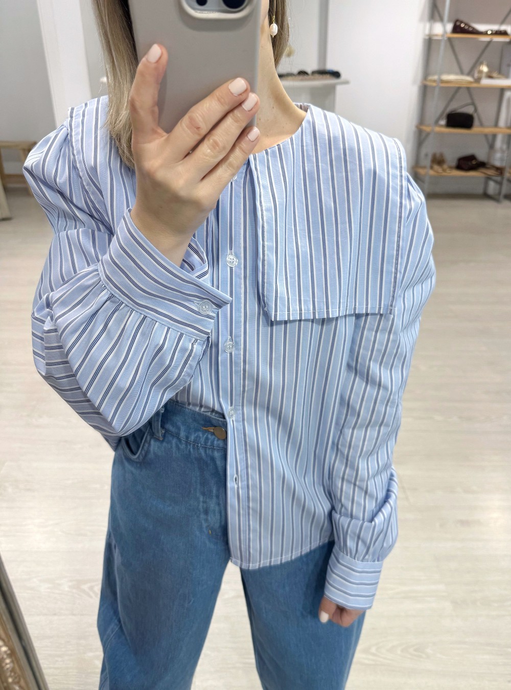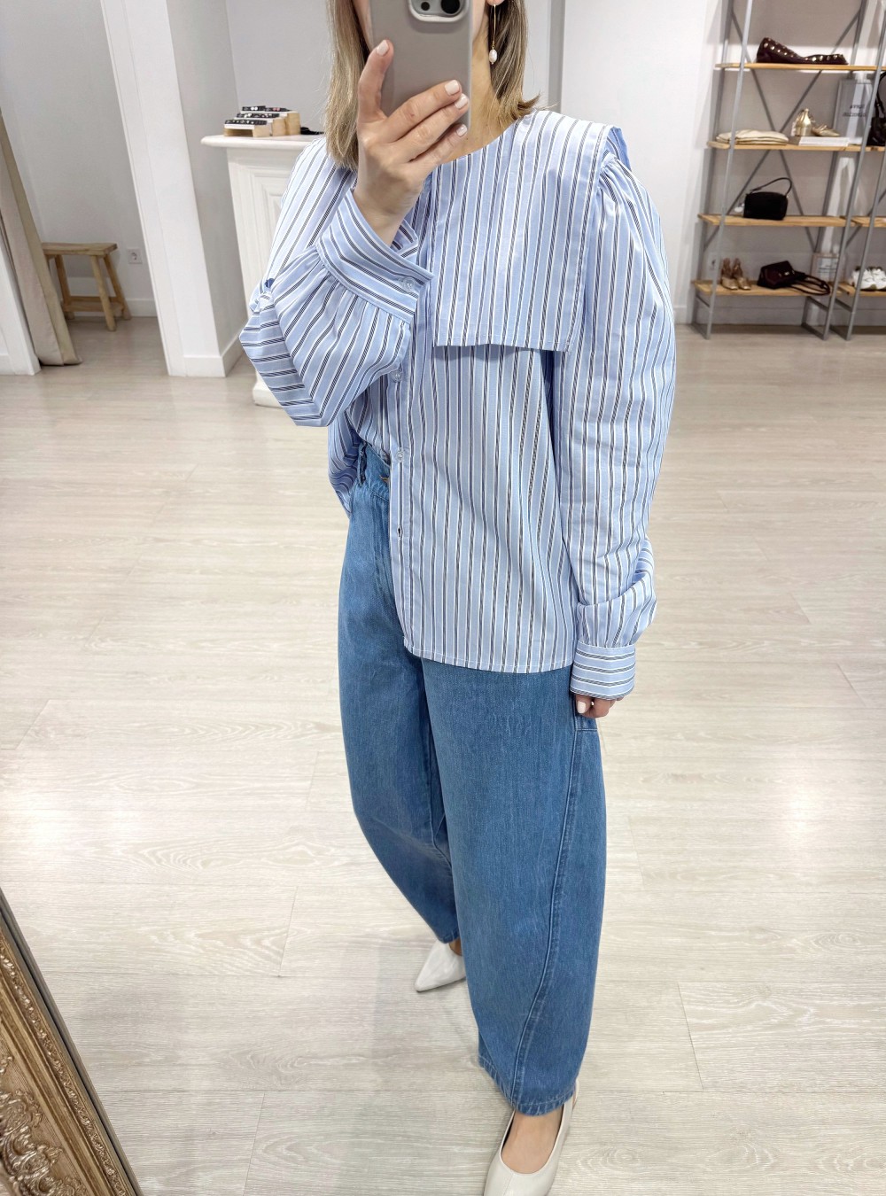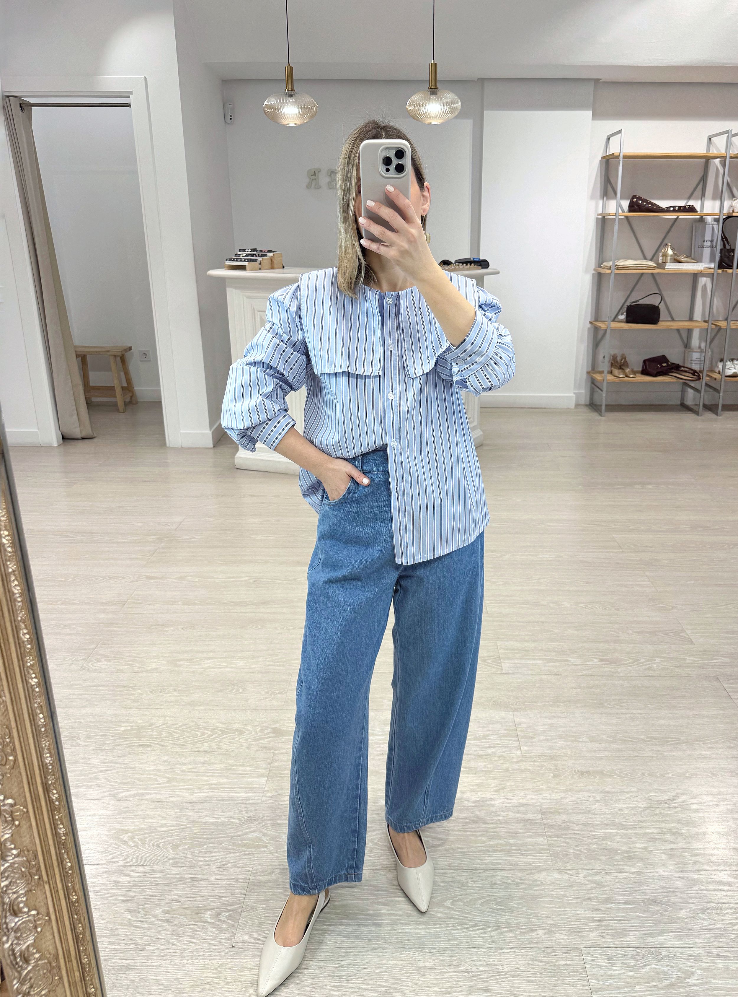 Camisa de rayas en tejido de algodón. Cuello amplio redondo. Puedes mezclarlo con un abrigo de paño para y para un jeans para un look de transición.