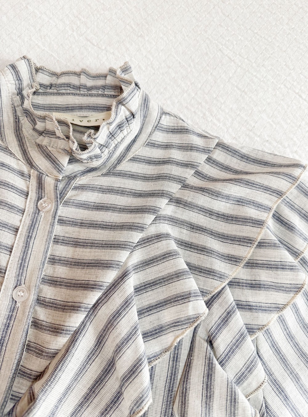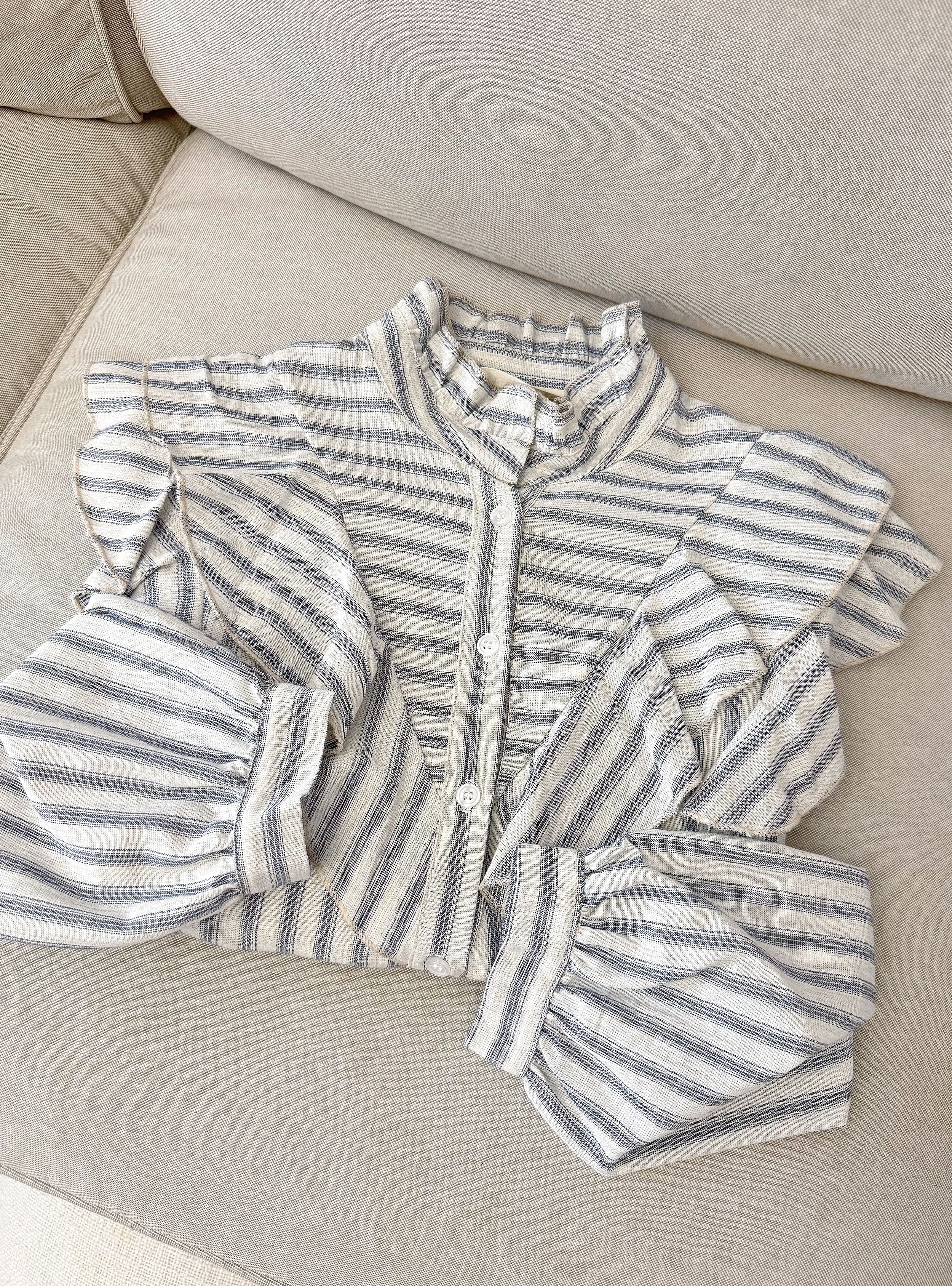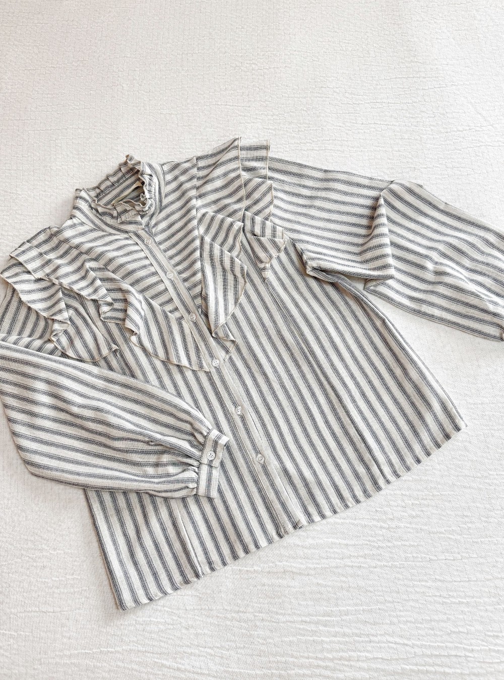 Camisa de manga larga de estilo romántico. Cuello alto tipo mao ligeramente ondulado. Doble volante en V tanto por delante como por detrás. Te proponemos combinarla con unos Jeans straight unas zapatillas para un look de día.