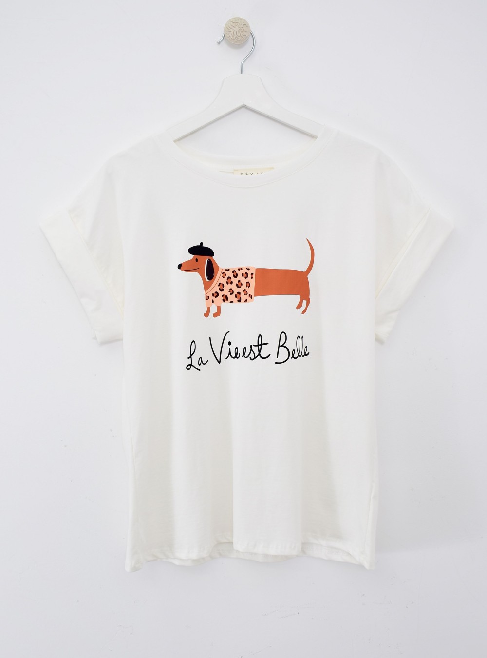 Camiseta de manga corta y corte clásico en tejido de algodón muy suave y con caída. Detalle de estilo en el doblez del borde de la manga. Perro salchicha estampado en el frontal con el mensaje “La vie est belle”. Perfecta para combinación de diario encorsetándola por dentro de la parte de abajo que lleves.