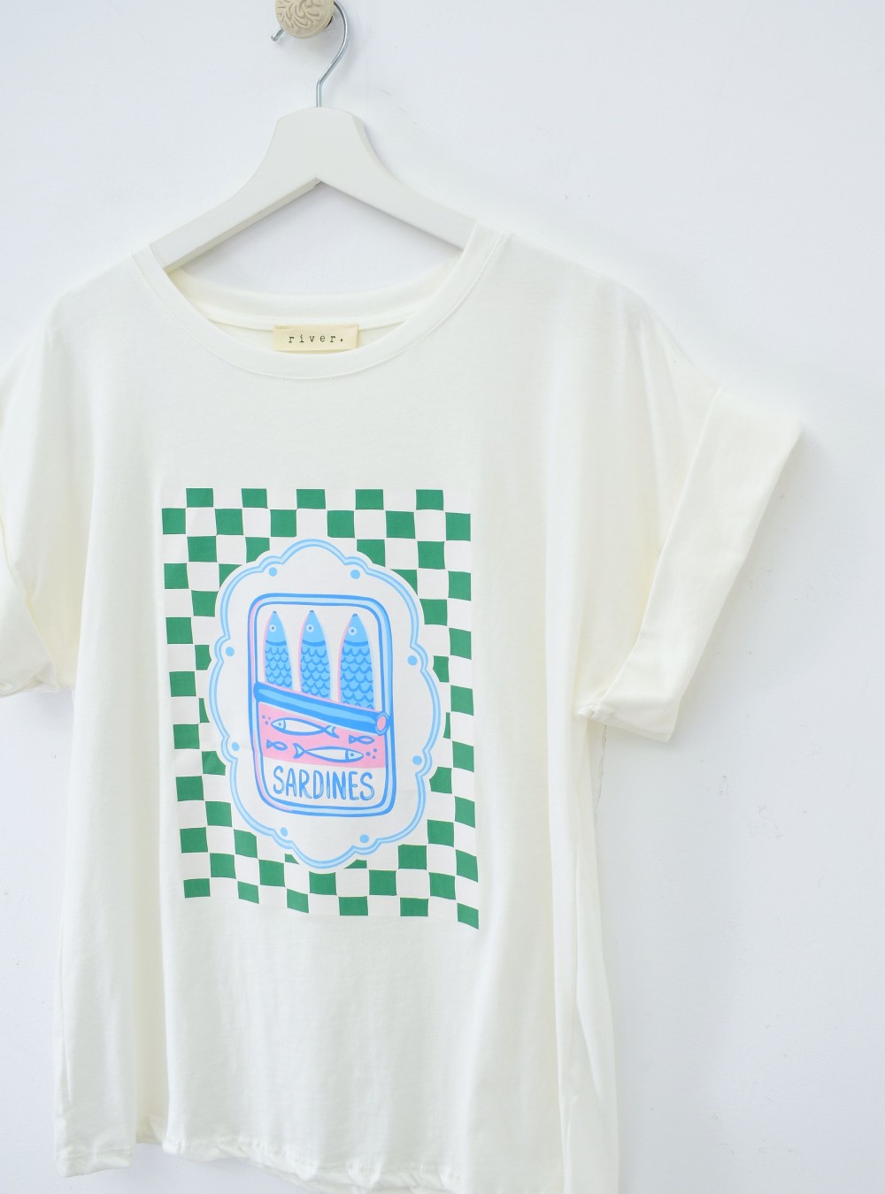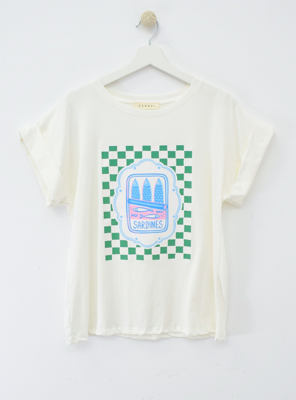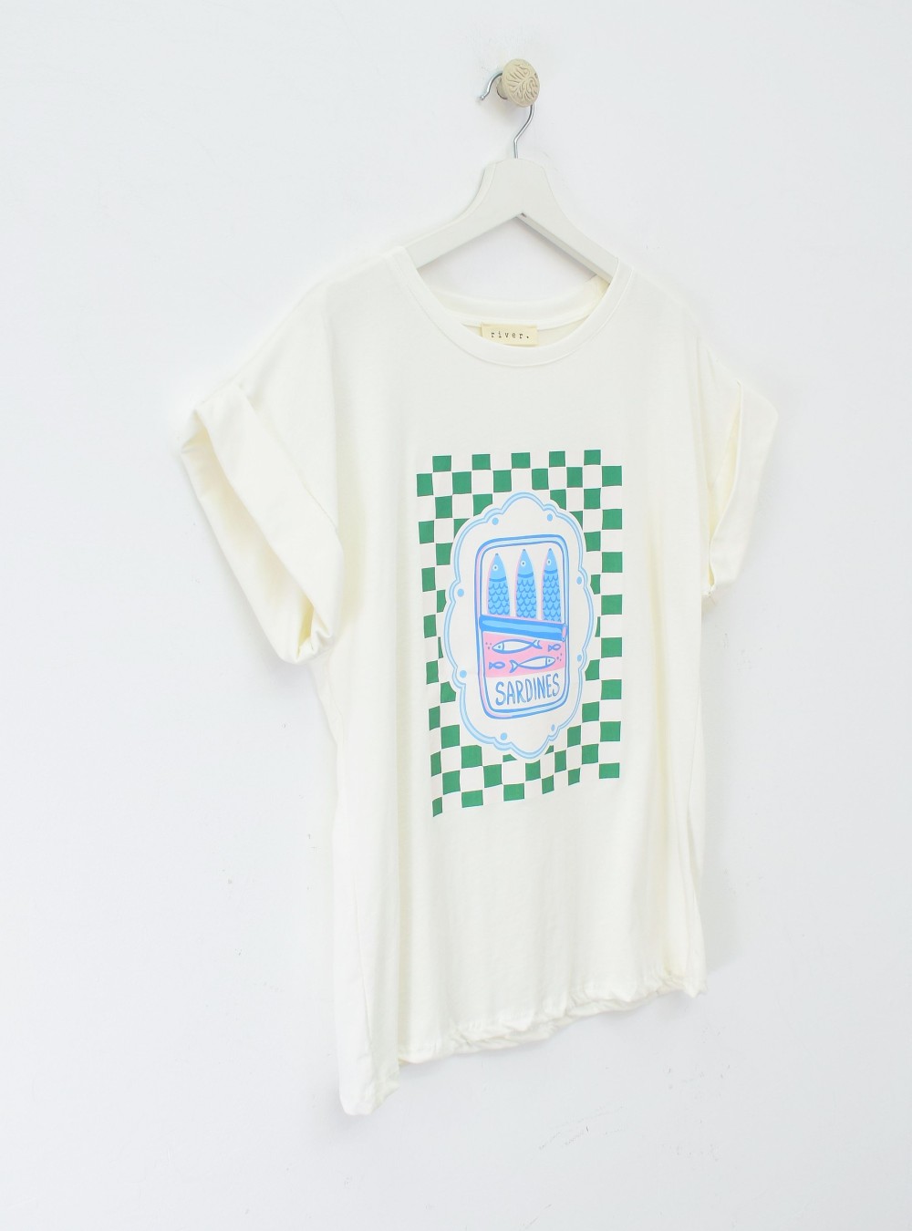 Camiseta de manga corta y corte clásico en tejido de algodón muy suave y con caída. Detalle de estilo en el doblez del borde de la manga. Tablero de ajedrez con una lata de sardinas a medio abrir. Perfecta para combinación de diario encorsetándola por dentro de la parte de abajo que lleves.