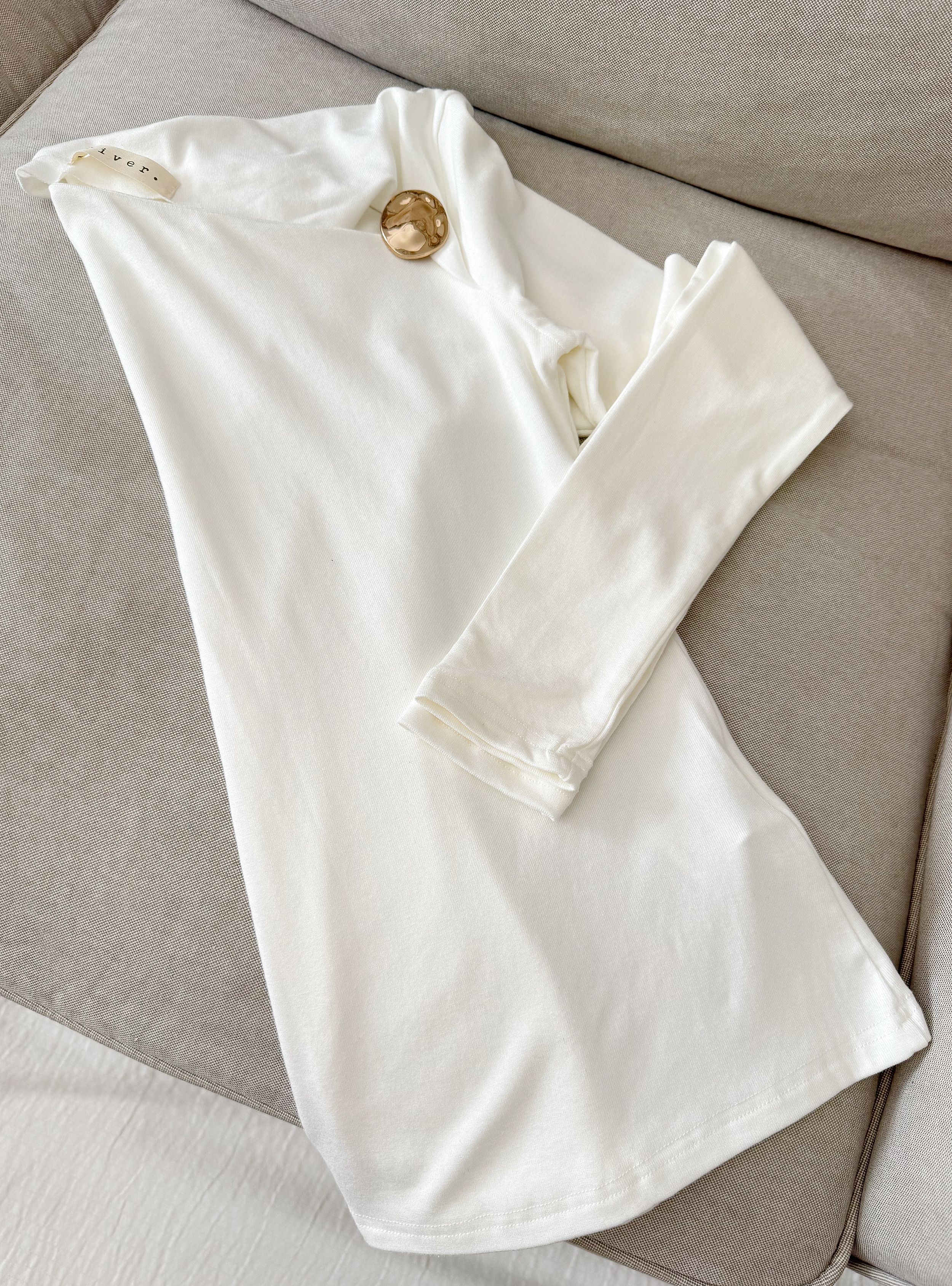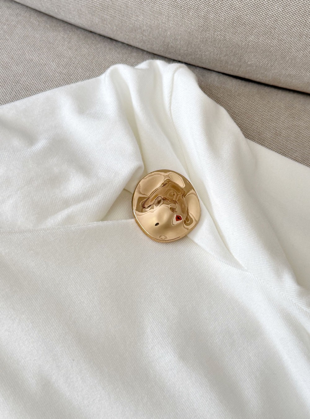 Camiseta ajustada con el escote asimétrico y un broche dorado en uno de los lados. Tejido suave que se adapta bien. Puedes mezclarla con la Sobrecamisa con bordados para un look increíble de entretiempo.