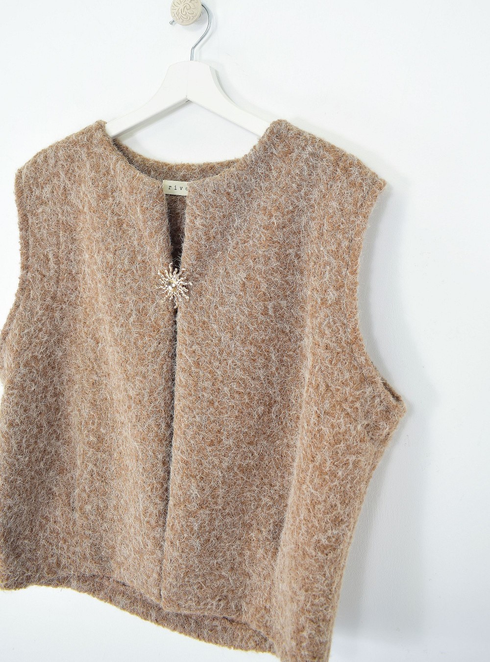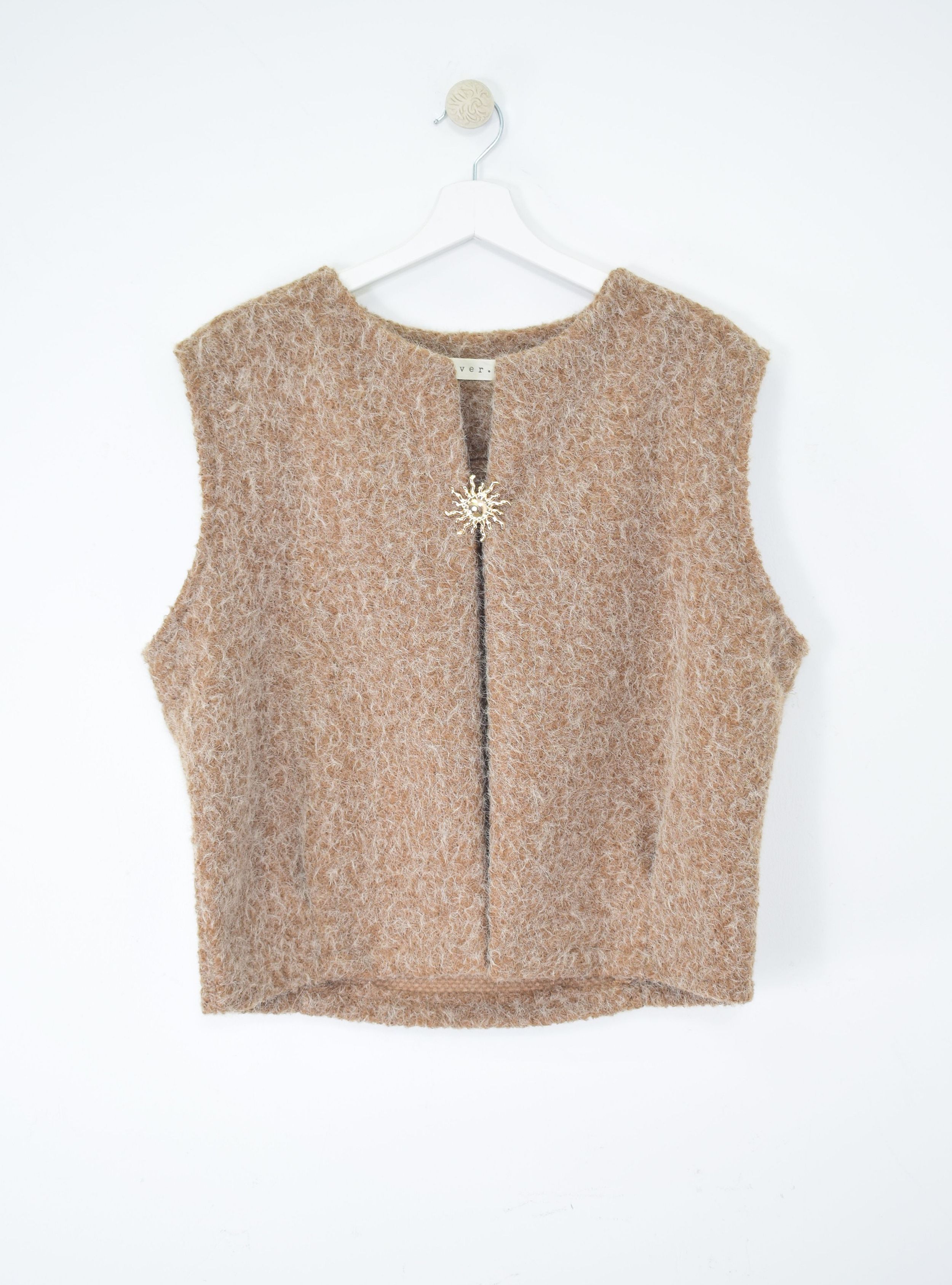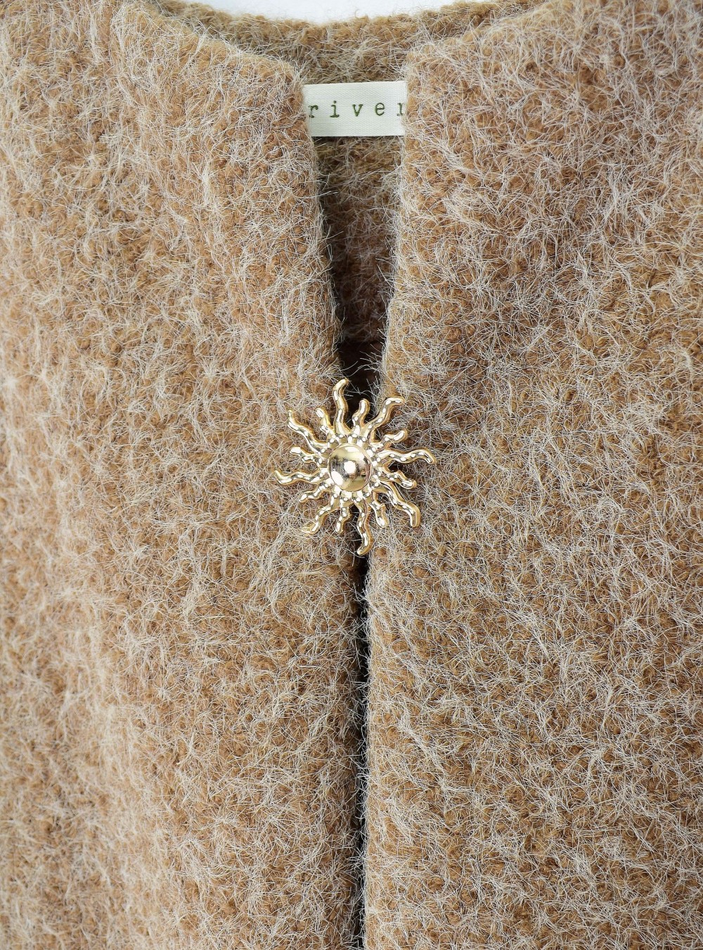 Chaleco oversize con acabado en pelo y cierre por medio de un broche con forma de sol dorado. Tejido con pinzas por delante y por detrás en la parte baja que hacen que siente genial. Te proponemos que lo combines con una camisa blanca, unos jeans azul oscuro y unos botines chocolate para un look súper “trendy”.