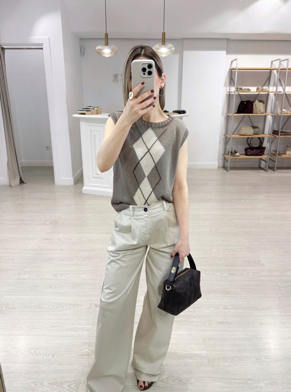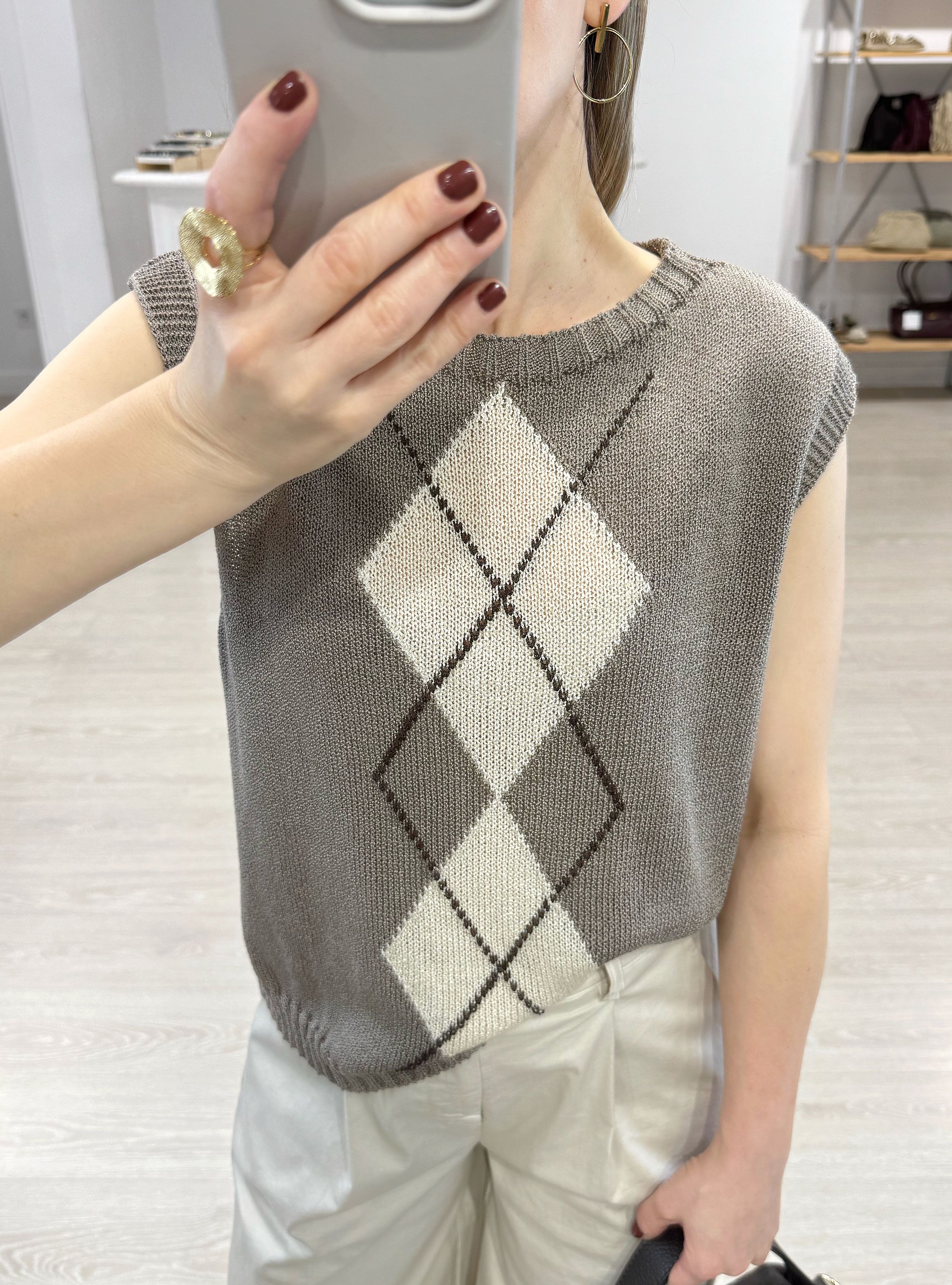 Chaleco de punto y corte holgado con rombos. Cuello redondo. Tejido suave al tacto y con mucho movimiento. Puedes mezclarlo con un pantalón de algodón y unas sandalias de tacón para un look de día sofisticado.