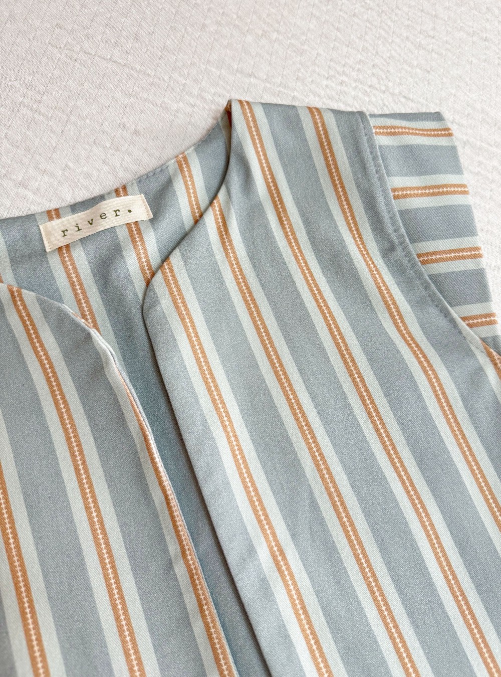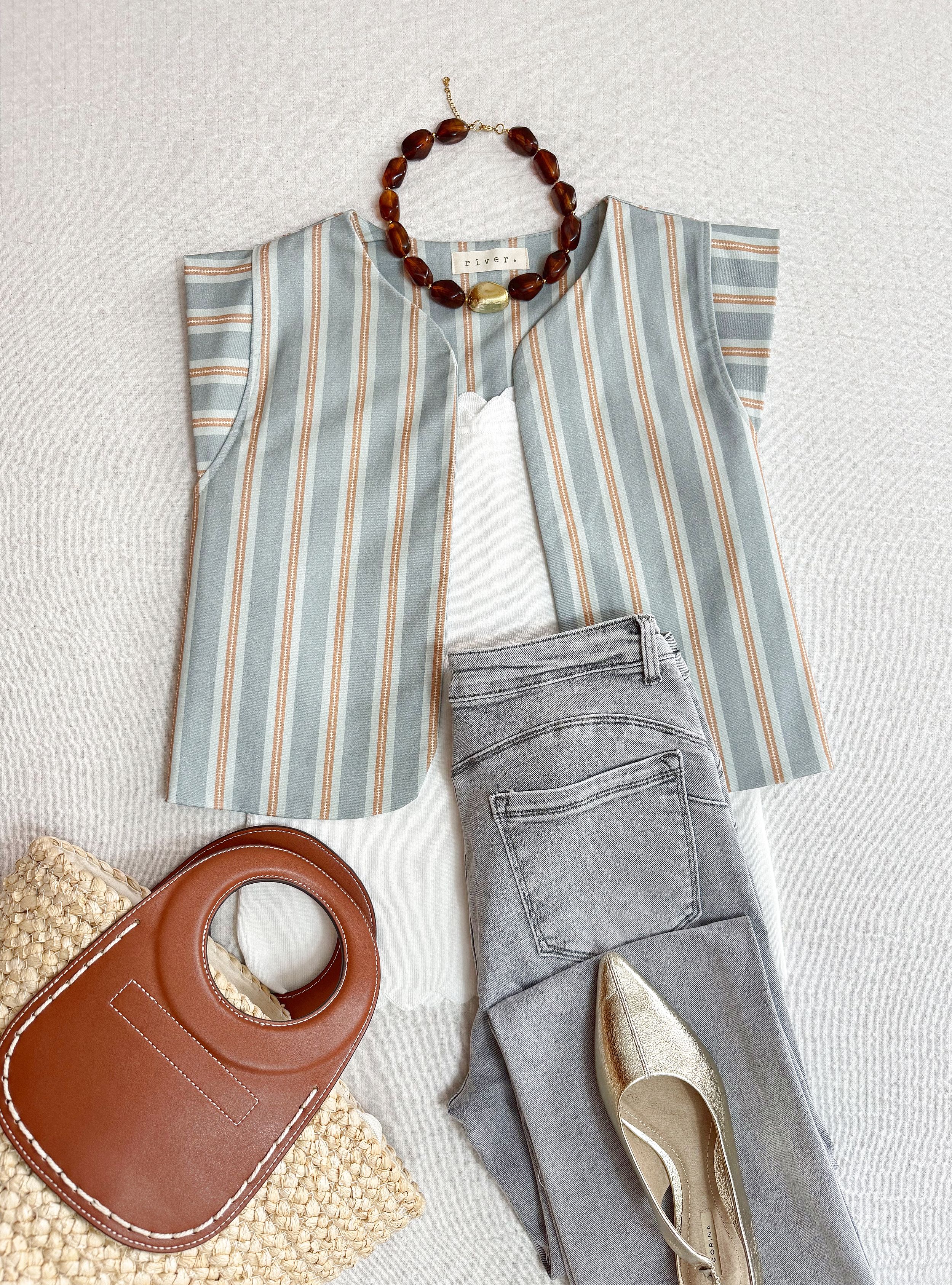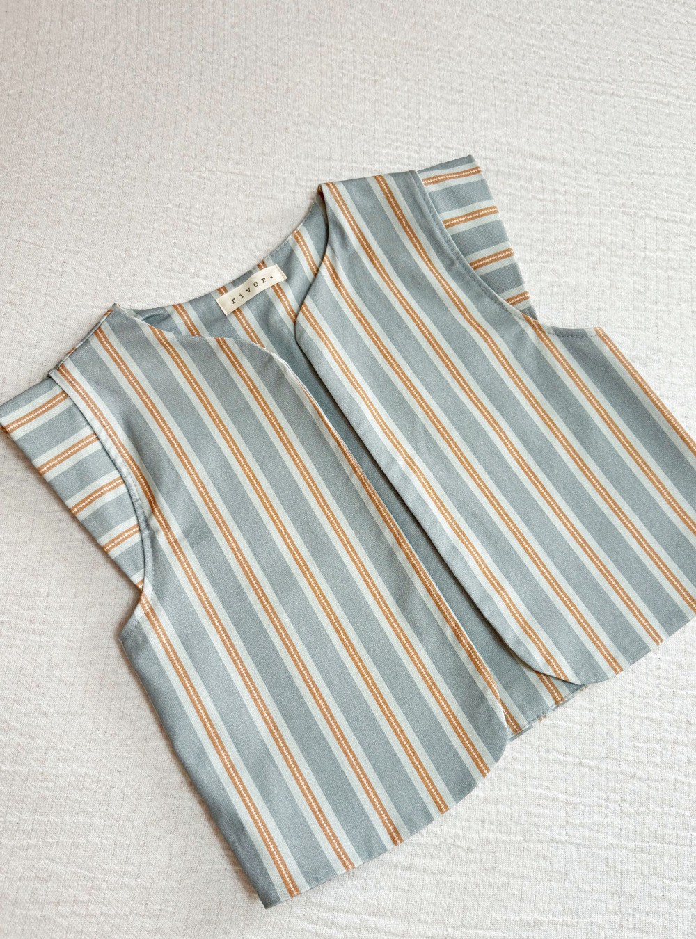 Chaleco corto con rayas en tono camel y verde agua. Corte holgado. Puedes mezclarlo con un top de punto ajustado y tu jeans favorito para un look todoterreno pero lleno de estilo.
