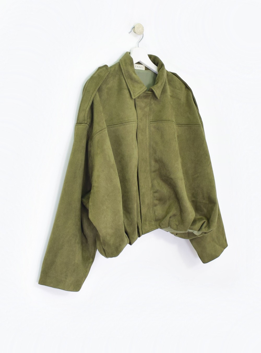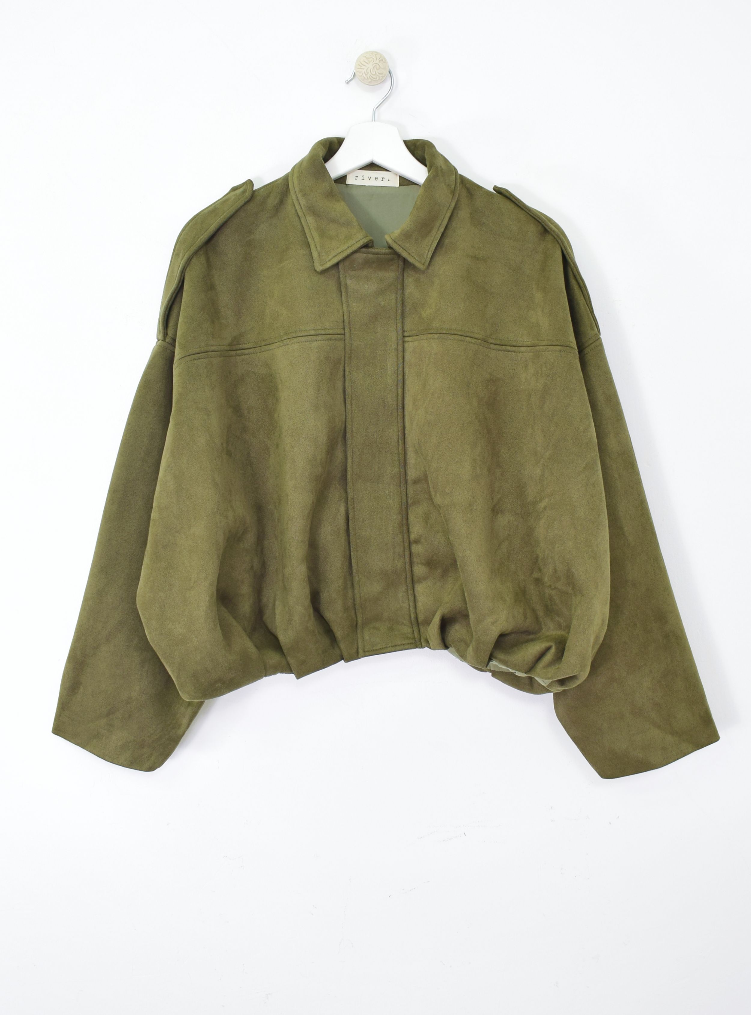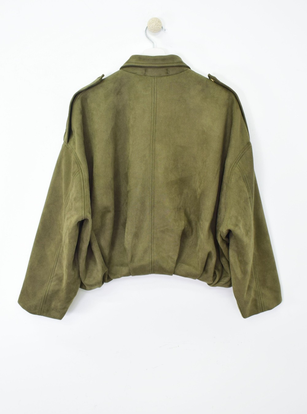 Chaqueta de corte bomber con acabado en antelina en el exterior y forrada con tela de color verde. Cierre por medio de cremallera que puedes ocultar mediante una solapa que se fija mediante dos botones automáticos. Bajo recogido formando pinzas en el tejido. Te podría decir que es una prenda con un potencial enorme para tus looks pero seguro que te darás cuenta de eso en cuanto te la pongas.